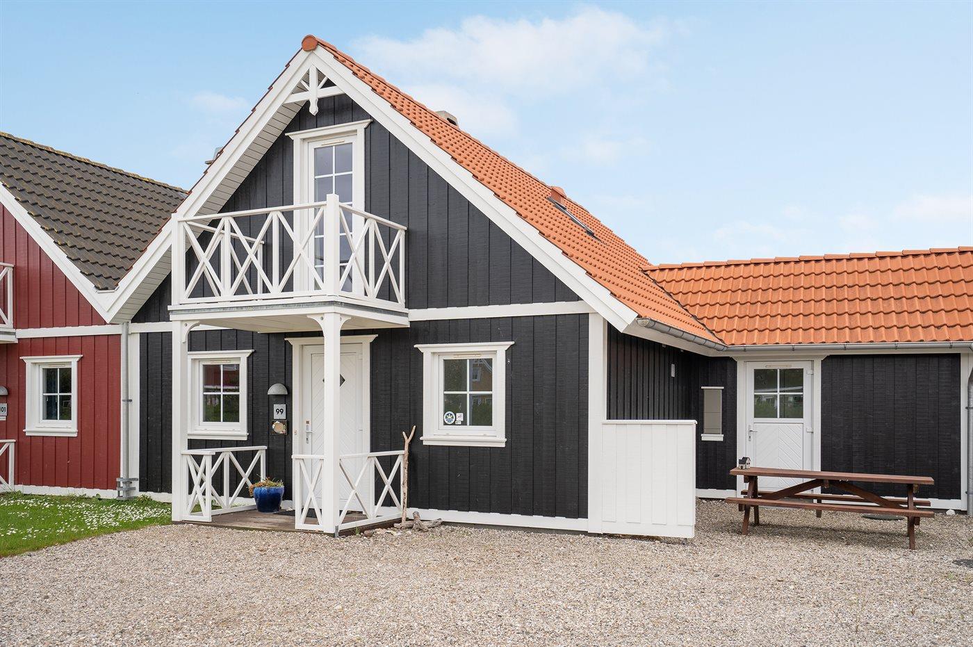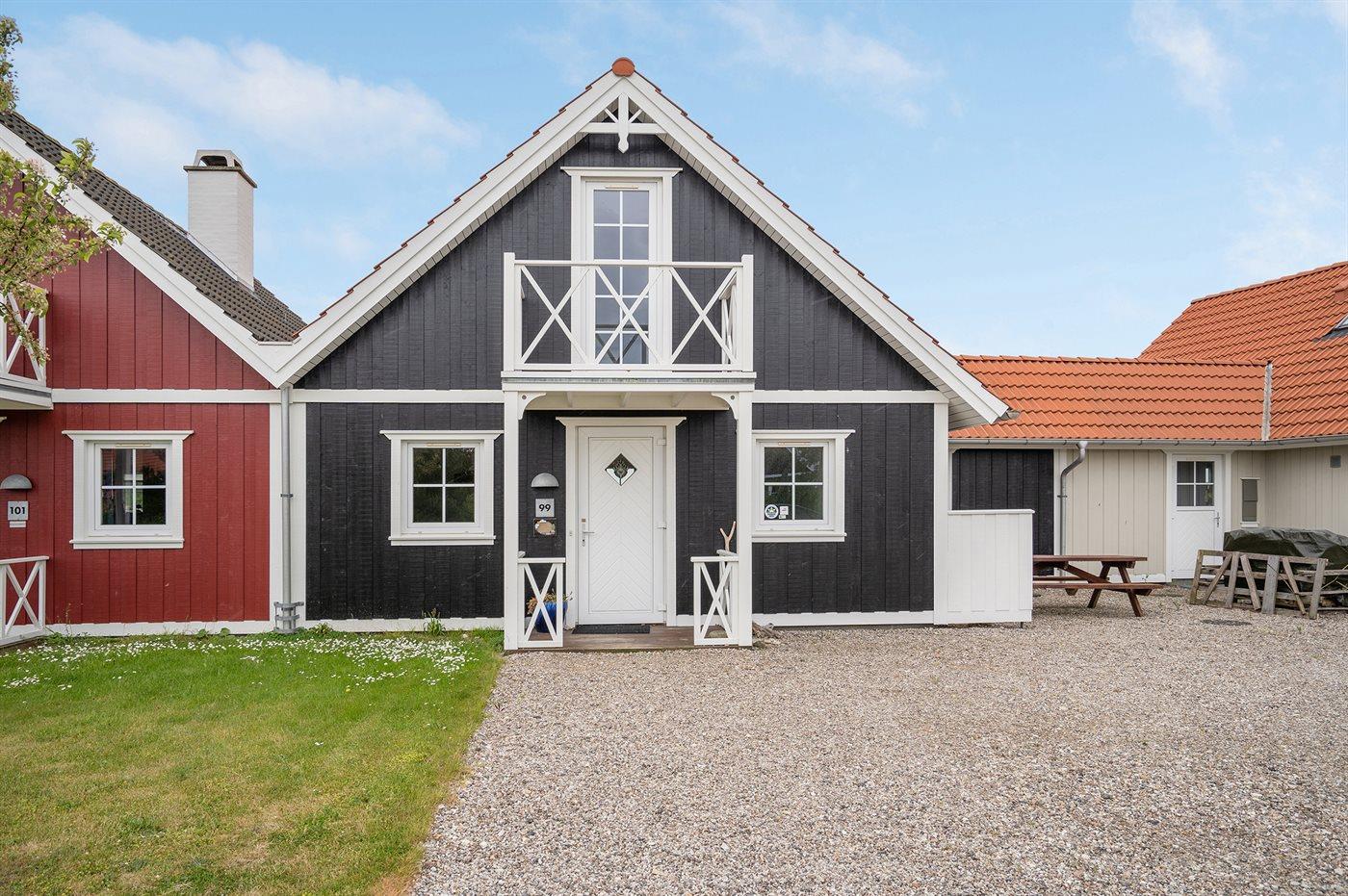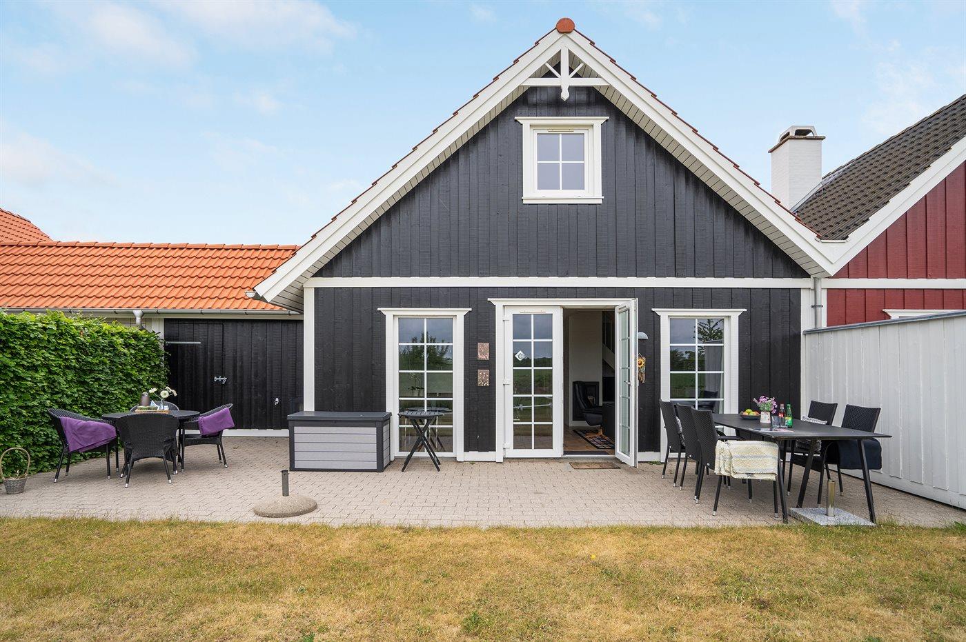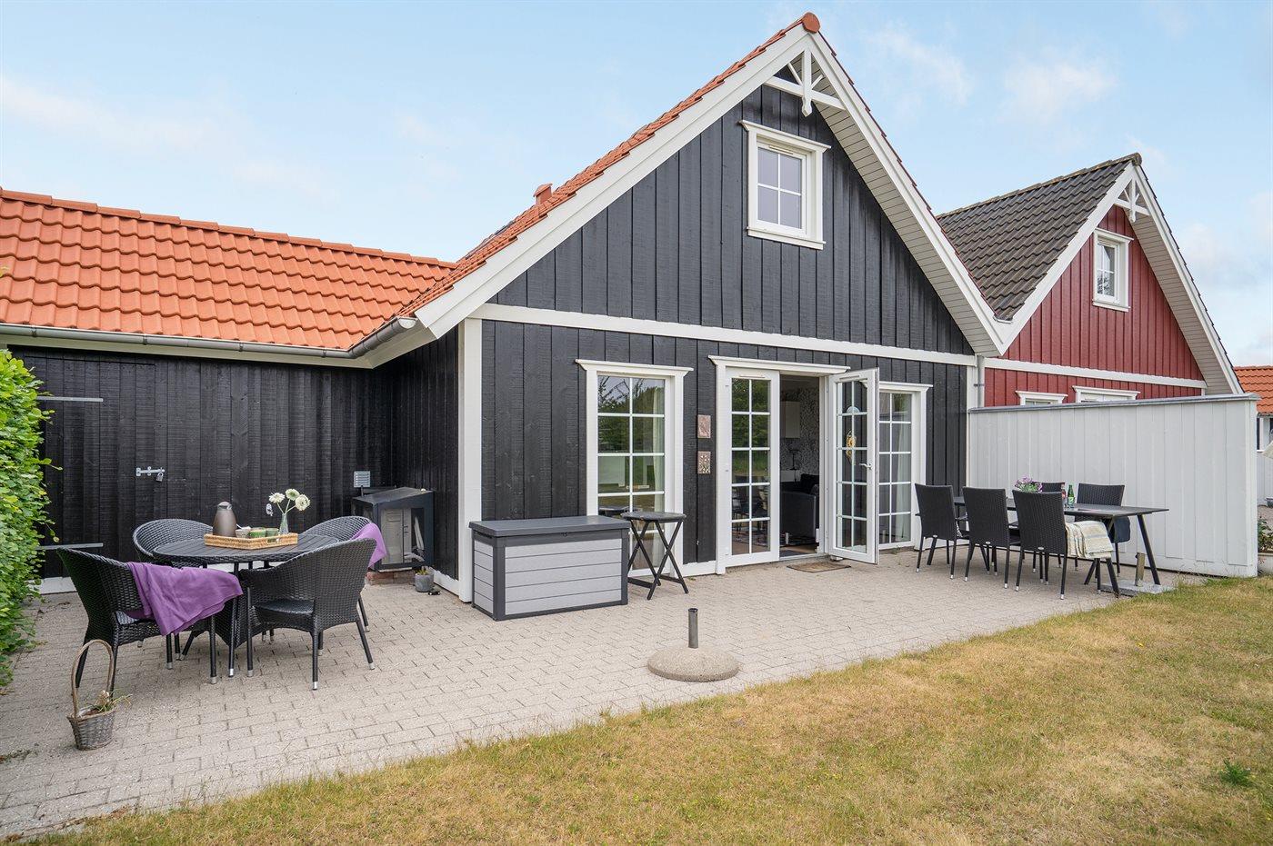 Von einem Architekten gezeichnetes Reihenhaus aus Holz in 2 Etagen, 2005 gebaut und 2013 modernisiert. Zum Haus gehört Terrasse mit Gartenmöbeln sowie Balkon im Obergeschoss. Innen gibt es helle Wände und Decken. Klinkerböden im Erdgeschoss, Teppichböden im Obergeschoss. Großes Badezimmer im Erdgeschoss mit Fußbodenheizung, Duschnische, 2-Pers. Whirlpool und Eingang zur Sauna. Gästetoilette im Obergeschoss. Die moderne Küche ist u. a. mit Geschirrspüler, Mikrowelle, Warmluftofen, Tiefkühlgerät und Herd mit Ceran-Feld ausgestattet. Das hübsch möblierte Wohnzimmer enthält Kaminofen, TV mit Gemeinschaftsantenne, Stereoanlage mit CD-Spieler sowie DVD-Spieler. Die Schlafplätze des Hauses verteilen sich auf 3 Schlafzimmer, alle mit Doppelbett. Ferner stehen kabellose Internetverbindung (eigener Computer muss mitgebracht werden), Waschmaschine, Wäschetrockner, Kinderbett und Kinderhochstuhl zur Verfügung. Das Haus liegt in einem Ferienhausgebiet mit guten Aktivitätsmöglichkeiten, u. a. gemeinsame Spielplätze, Petanque, Tennisplatz, Beach Volley Platz und Einkaufsmöglichkeiten.