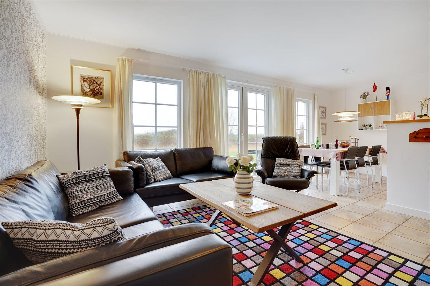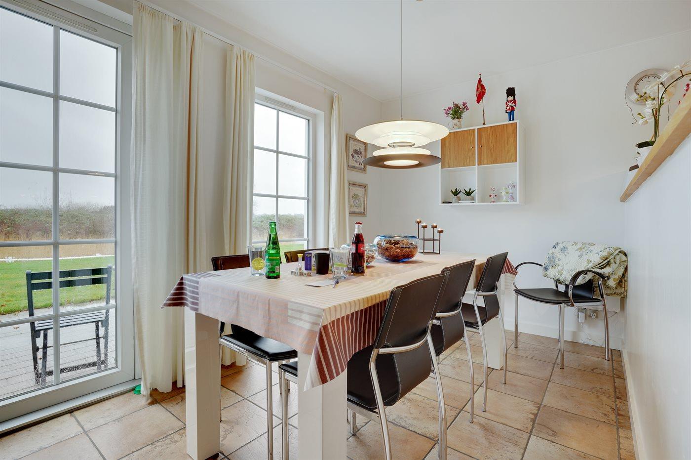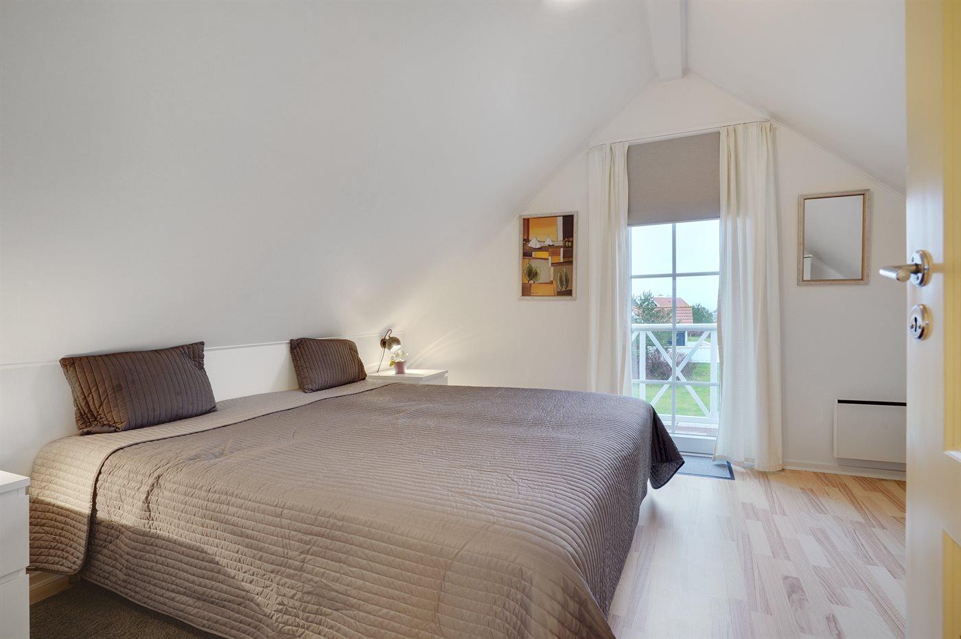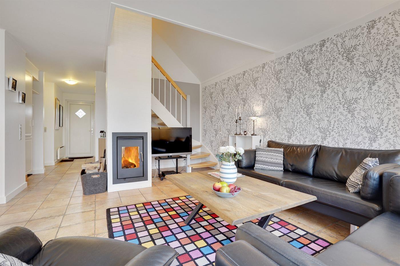 Von einem Architekten gezeichnetes Reihenhaus aus Holz in 2 Etagen, 2005 gebaut und 2013 modernisiert. Zum Haus gehört Terrasse mit Gartenmöbeln sowie Balkon im Obergeschoss. Innen gibt es helle Wände und Decken. Klinkerböden im Erdgeschoss, Teppichböden im Obergeschoss. Großes Badezimmer im Erdgeschoss mit Fußbodenheizung, Duschnische, 2-Pers. Whirlpool und Eingang zur Sauna. Gästetoilette im Obergeschoss. Die moderne Küche ist u. a. mit Geschirrspüler, Mikrowelle, Warmluftofen, Tiefkühlgerät und Herd mit Ceran-Feld ausgestattet. Das hübsch möblierte Wohnzimmer enthält Kaminofen, TV mit Gemeinschaftsantenne, Stereoanlage mit CD-Spieler sowie DVD-Spieler. Die Schlafplätze des Hauses verteilen sich auf 3 Schlafzimmer, alle mit Doppelbett. Ferner stehen kabellose Internetverbindung (eigener Computer muss mitgebracht werden), Waschmaschine, Wäschetrockner, Kinderbett und Kinderhochstuhl zur Verfügung. Das Haus liegt in einem Ferienhausgebiet mit guten Aktivitätsmöglichkeiten, u. a. gemeinsame Spielplätze, Petanque, Tennisplatz, Beach Volley Platz und Einkaufsmöglichkeiten.