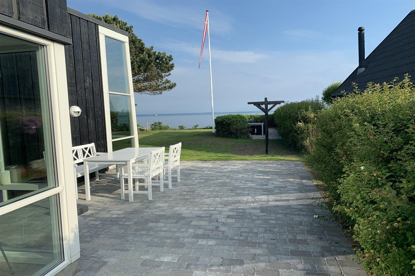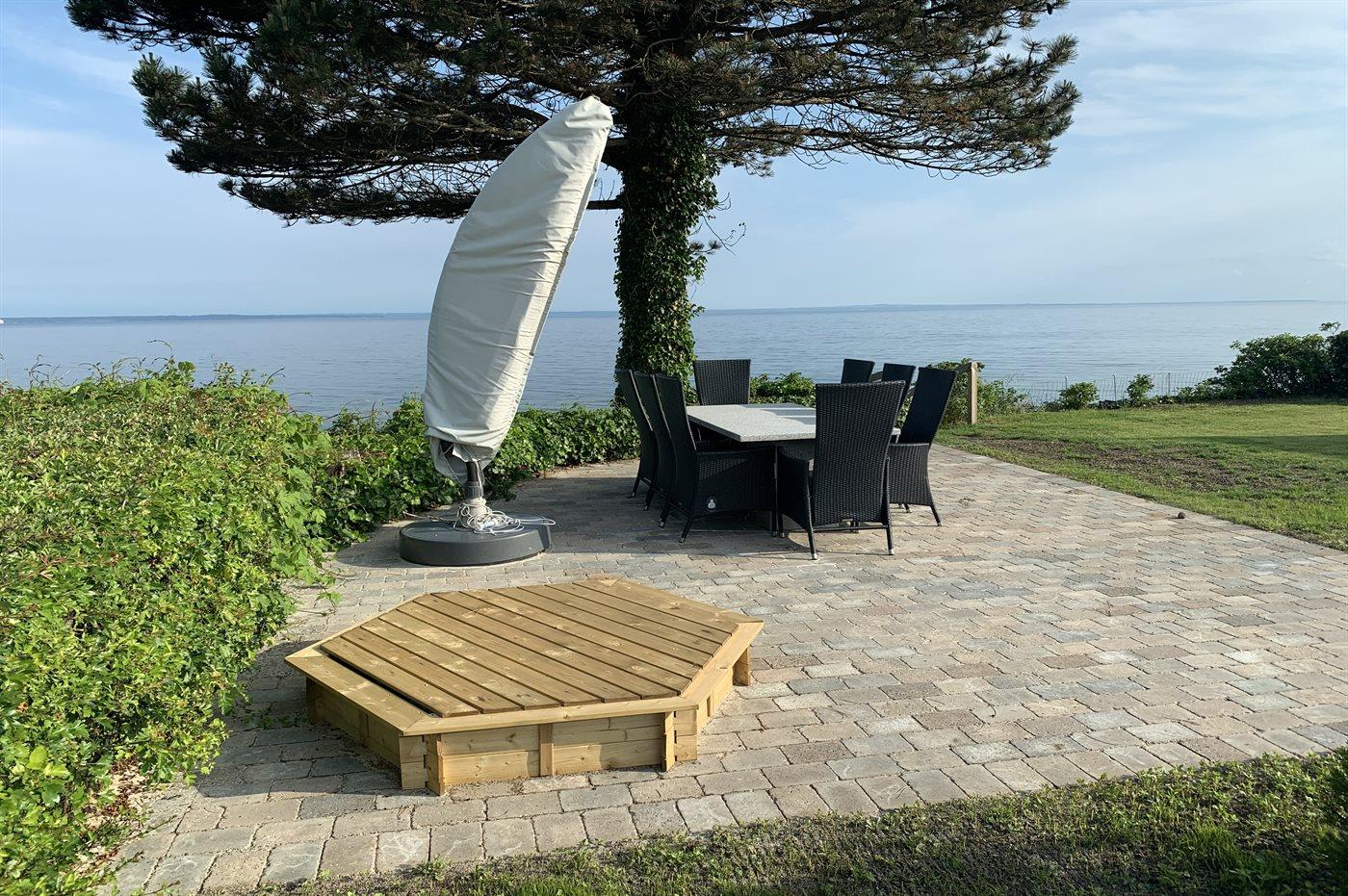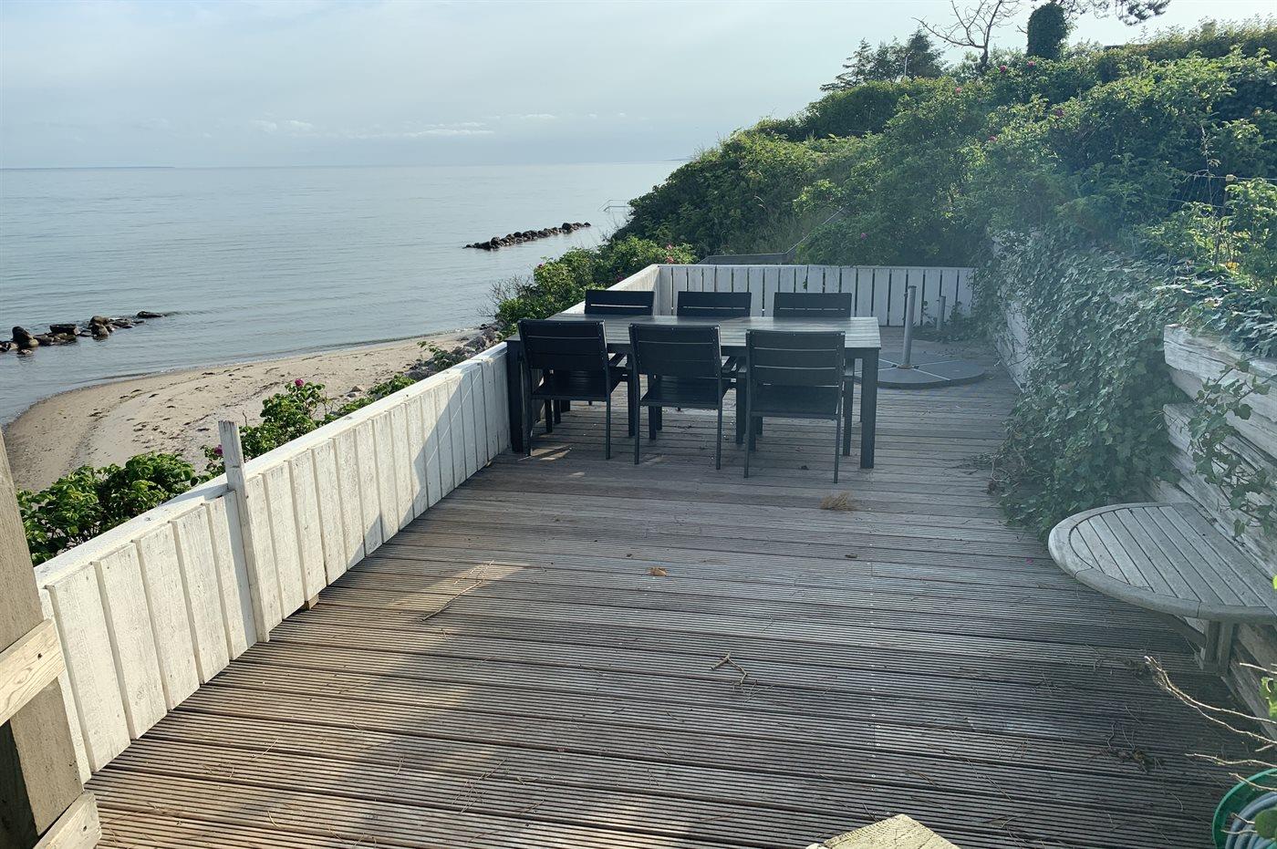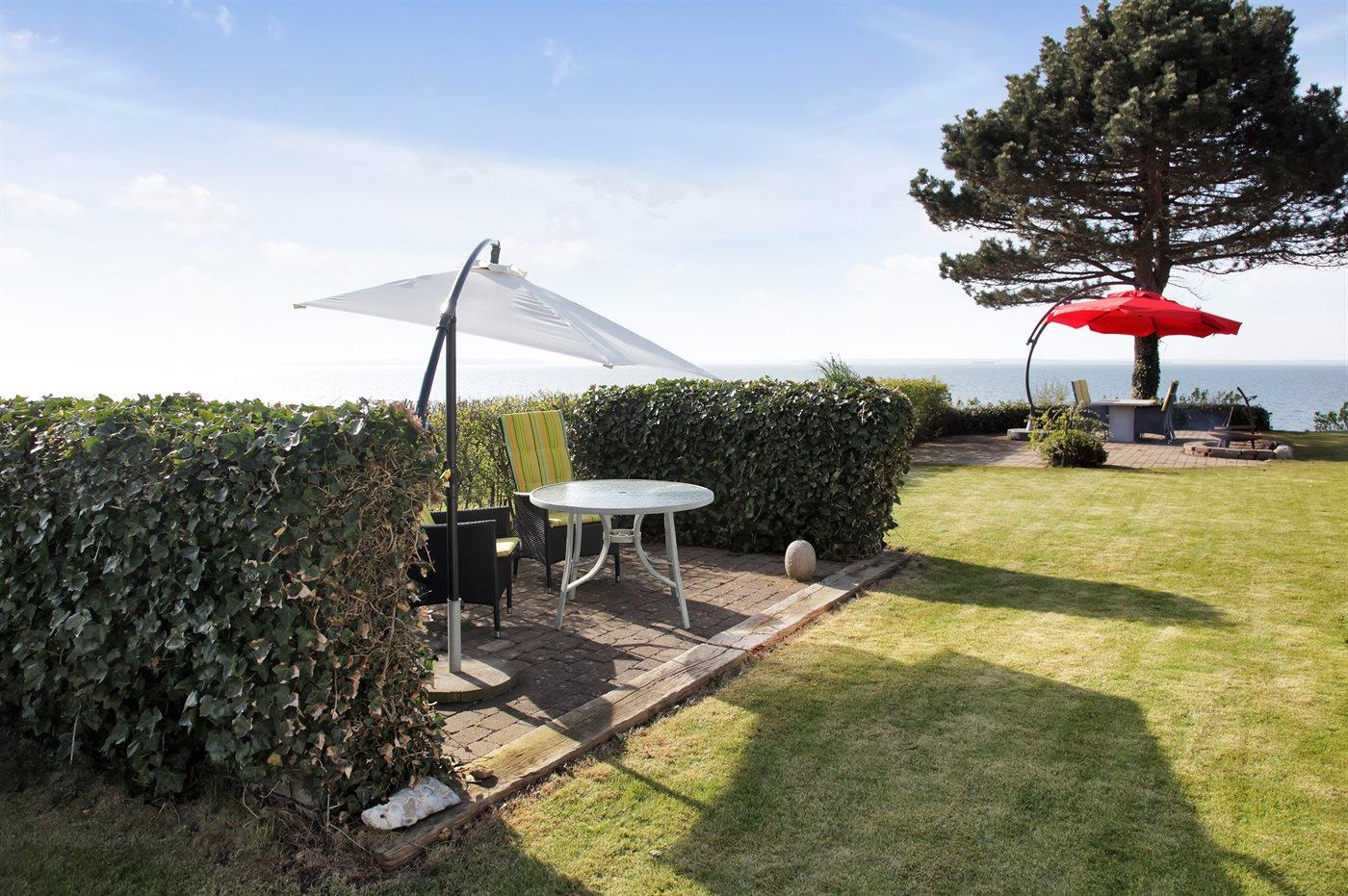 Dieses einmalige Ferienhaus mit Meeresblick liegt auf einem schönen, eingezäunten Grundstück - in erster Reihe zum Meer hinaus. Zum Haus gehören mehrere Terrassen mit Gartenmöbeln.