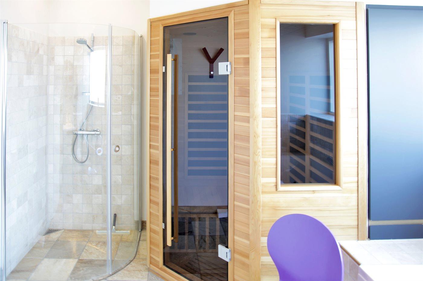 Es gibt 2 Badezimmer mit Duschnische und 2 Toiletten. Fußbodenheizung in 2 Badezimmern. In der infraroten Sauna können Sie sich so richtig entspannen.