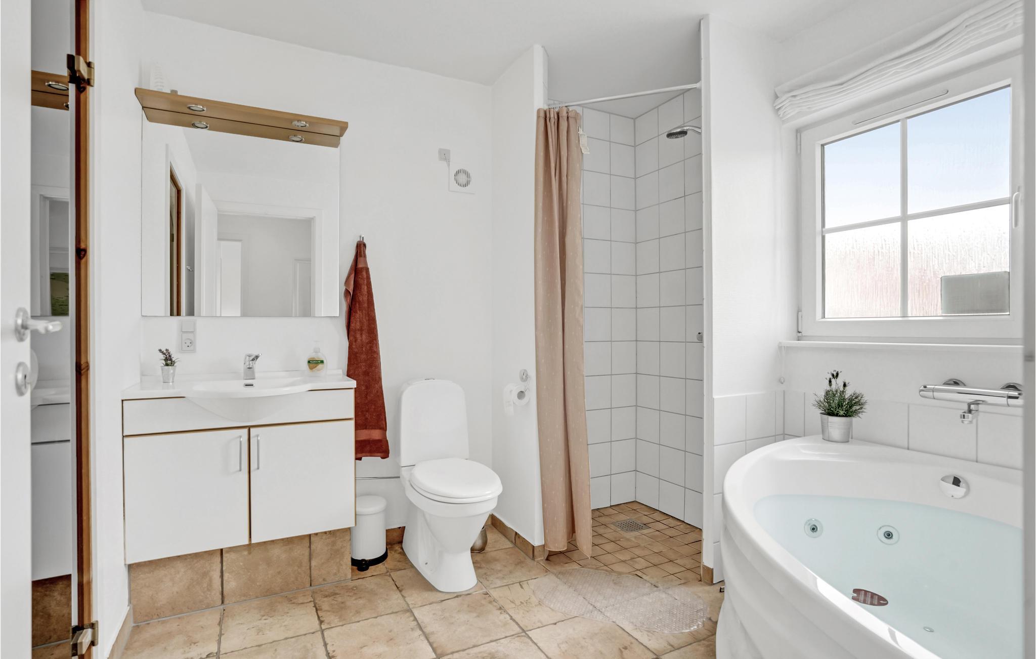 Dieses Ferienhaus befindet sich in einem schönen Ferienhausgebiet nicht weit vom Strand entfernt und bietet mit seinen drei Schlafzimmern und einem Badezimmer Platz für eine größere Familie. Ihnen stehen im Haus außerdem ein großer Wohnbereich mit offener Küche, Sofa- und Essecke zur Verfügung. Entspannen Sie hier abends vor dem Kamin oder kochen Sie zusammen leckere Mahlzeiten in der Küche. Nach einem langen Urlaubstag laden der Whirlpool und die Sauna zu entspannenden Wellness-Momenten ein.
