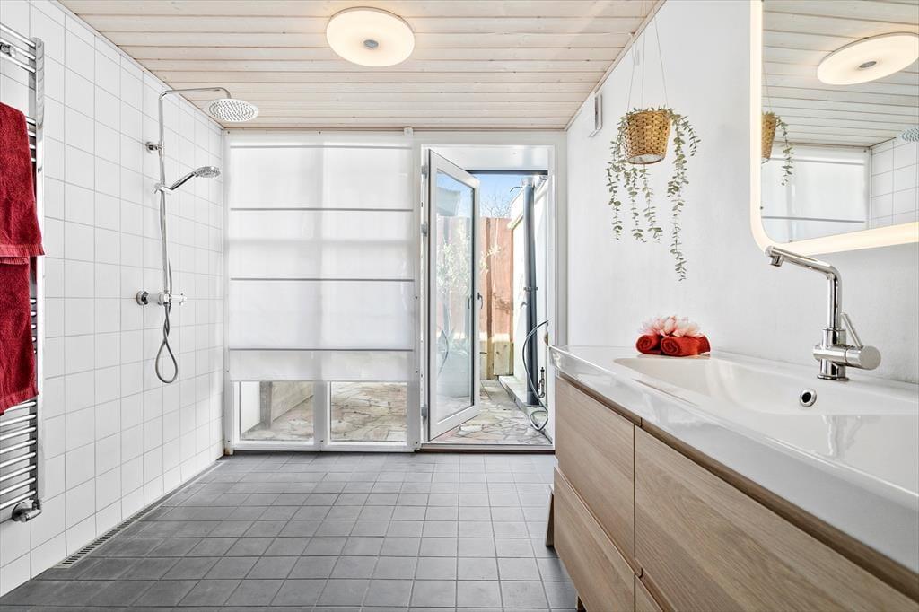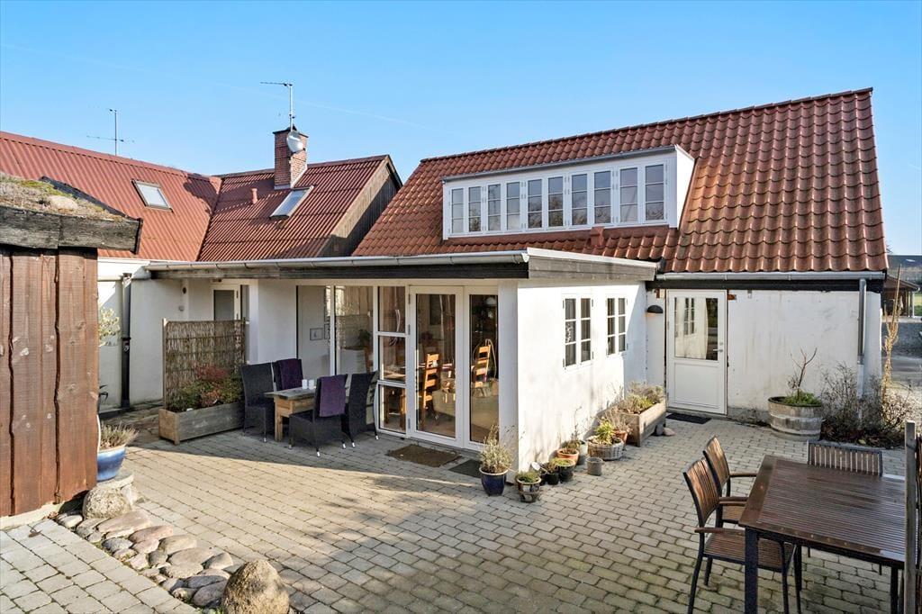 Mehrere gemütliche Eckchen laden zu friedvollen, entspannten Momenten ein. An das Haus schmiegt sich eine schöne, nach Westen gerichtete Steinterrasse, die vom Küchen- und Essbereich aus zugänglich ist und sich dank der Holzgartenmöbel sehr gut für gemeinsame Mahlzeiten unter freiem Himmel anbietet. Obwohl Sie mitten in Brundby wohnen, geht es auf der hinter dem Ferienhaus liegenden Terrasse angenehm ruhig und beschaulich zu.
