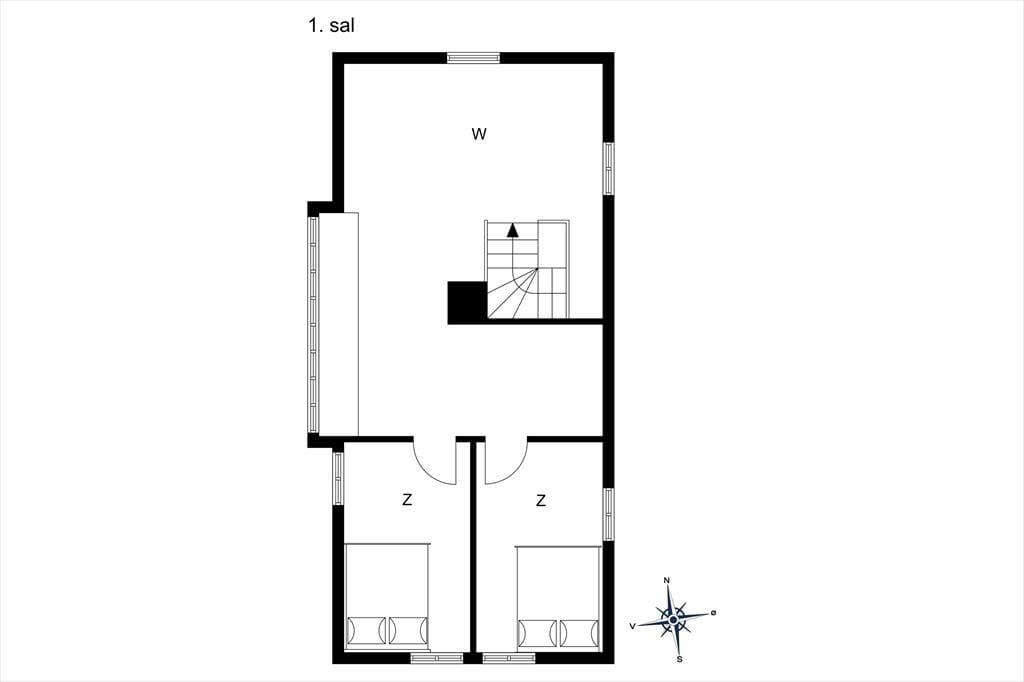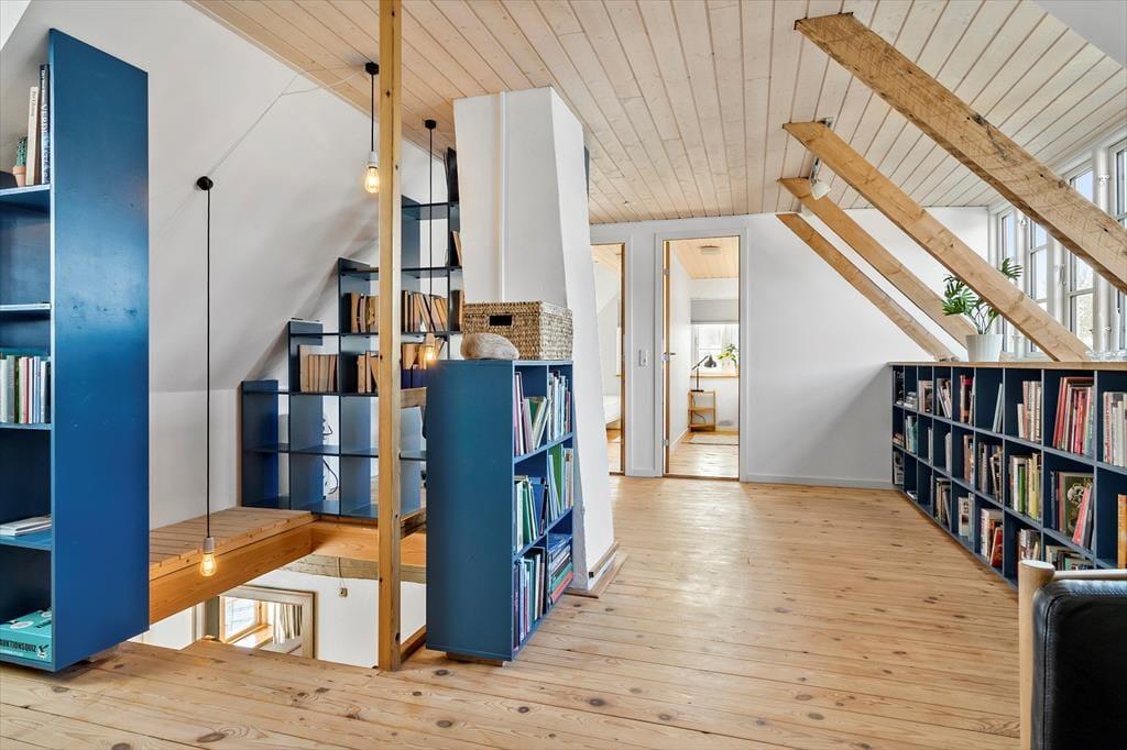 Eine steile Treppe führt Sie in das Obergeschoss, in dem zwei weitere Schlafräume und ein gemütlicher Treppenvorraum für Sie bereit stehen. Im Treppenvorraum laden Sofas und ein Fernseher zu entspannten Stunden ein. Ein gut gefülltes Bücherregal ist ebenfalls vorhanden. Dieser Teil des Hauses fungiert als gemütlicher Sammelpunkt aller Mitreisenden. Durch das schöne Fenster blicken Sie in den Garten.
