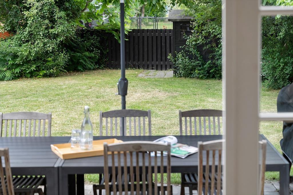 Das Dorfhaus liegt mitten in Brundby auf einem schönen Grundstück mit Garten hinter dem Haus. Der Garten ist eingezäunt, sodass Sie – unter Aufsicht – die Kinder unbeschwert spielen lassen können. Den ganzen Tag über können Sie die Sonne auf dem Rasen genießen oder dort spielen. Das Haus verfügt über eine schöne, nach Westen ausgerichtete Terrasse mit Steinplatten und Holzmöbeln, die direkt vom Wohn-/Essbereich aus zugänglich ist – ideal, um die Mahlzeiten im Freien zu genießen. Auf der Terrasse hinter dem Haus herrscht völlige Ruhe, obwohl das Haus mitten in Brundby liegt.