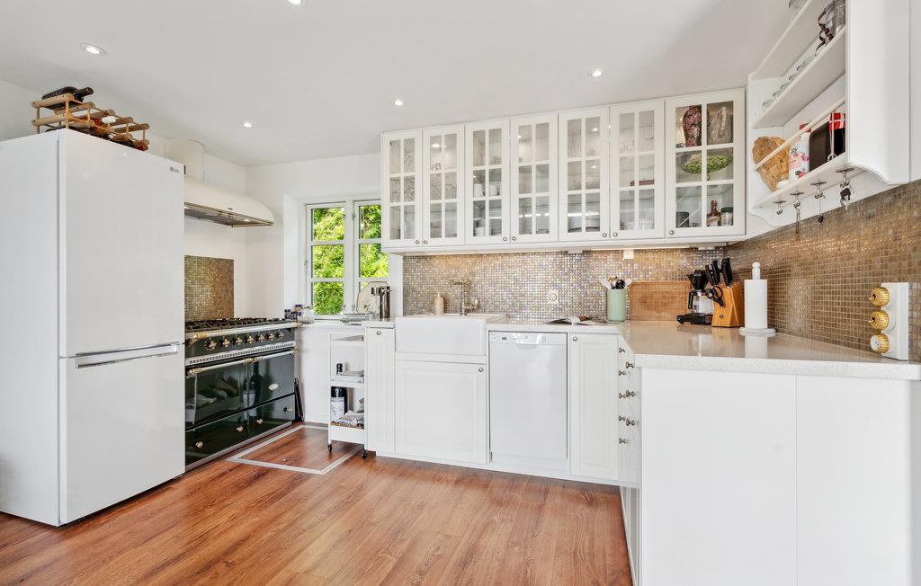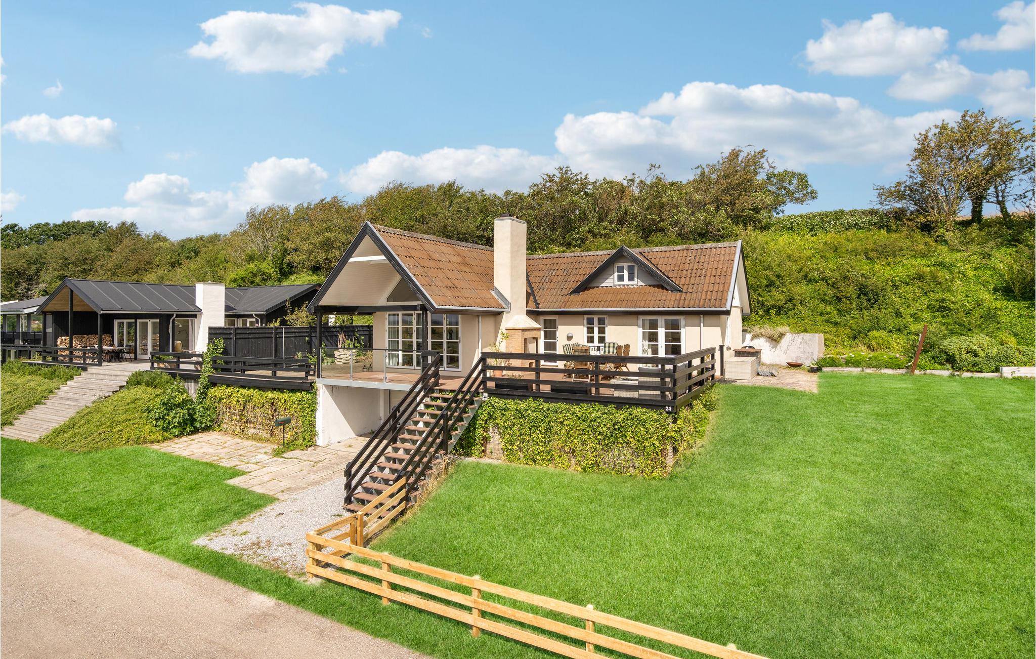 In reizender Lage am Strand von Brydegård begrüßt Sie dieses wunderschöne Ferienhaus. Im Innenraum erwartet Sie ein hochwertiges Interieur, das einen geschmackvollen Eindruck macht und zum Wohlfühlen einlädt. Verbringen Sie gemütliche Stunden mit Ihren Lieben in der hellen, rustikalen Atmosphäre des Wohnraumes, der sich zur Terrasse hin öffnet. Ob Sie vorm Kamin bequem sitzen oder auf der Terrasse entspannen, können Sie die fantastische Aussicht genießen. Versammeln Sie sich an lauen Sommerabenden um den Gartentisch zu leckeren Mahlzeiten und erleben Sie großartige Sonnenuntergänge.