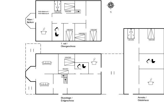 Übrigens: 4 der Schlafplätze verteilen sich auf 2 Schlafcouchen, die jeweils im Wohnzimmer des Nebengebäudes und im Aktivitätsraum stehen.