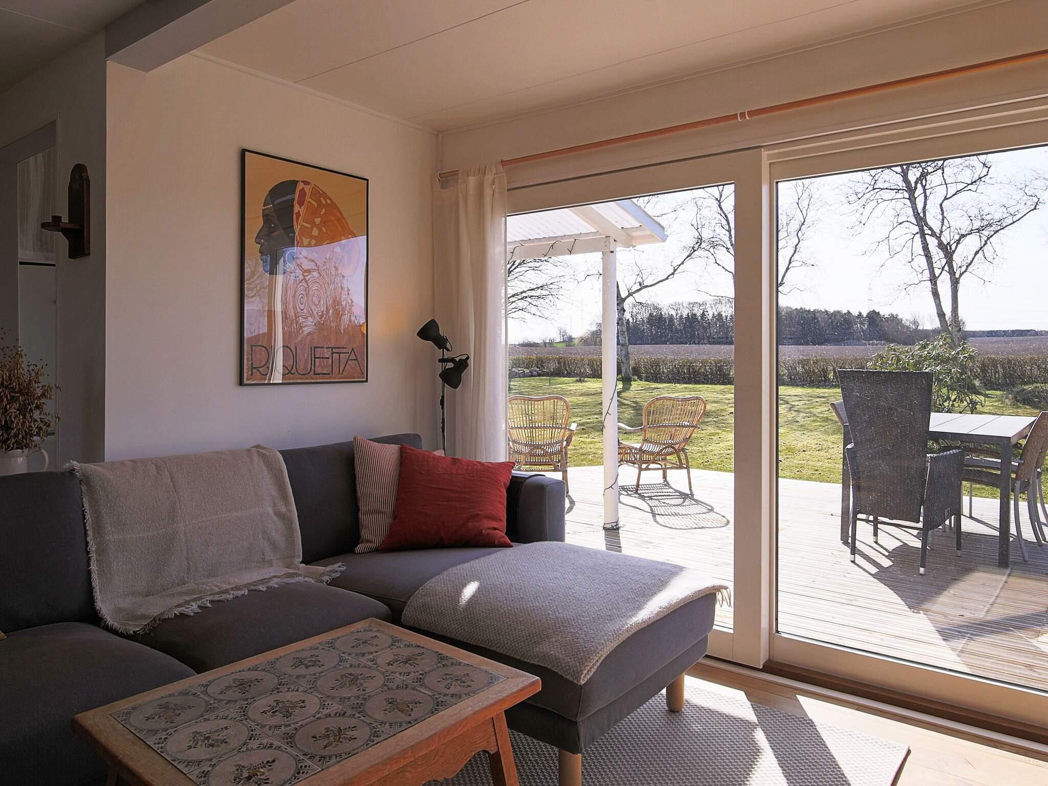 Das Haus empfängt Sie mit einem praktischen Eingangsbereich, von dem aus Sie in zwei Schlafzimmer gelangen: eines mit einem Doppelbett und das zweite mit zwei Einzelbetten – ideal für Familien oder kleine Gruppen. Ein helles und modernes Badezimmer ist ebenfalls vorhanden. Das Herzstück des Hauses ist der offene Küchen- und Wohnbereich, dessen Ess- und Sitzecke eine gemütliche Atmosphäre für gemeinsame Mahlzeiten und Abende schaffen. Von hier aus haben Sie direkten Zugang zur großen Holzterrasse – ein wunderbarer Ort, um tagsüber Sonne zu tanken oder abends beim Grillen den Blick über die weiten Felder zu genießen.