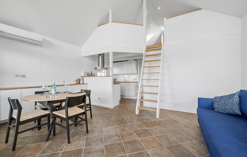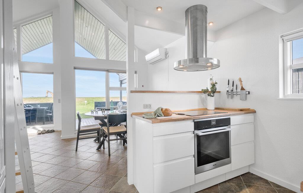Im Inneren des Hauses erwartet Sie ein offener Wohnbereich mit hohen Decken und großen Fenstern, die viel Licht hereinlassen und einen weiten Blick auf die Umgebung ermöglichen. Machen Sie es sich auf dem Sofa am Kaminofen bequem und lassen Sie die entspannte Atmosphäre auf sich wirken. Die moderne Küche bietet alles, was Sie für die Zubereitung leckerer Mahlzeiten benötigen.