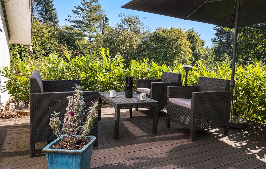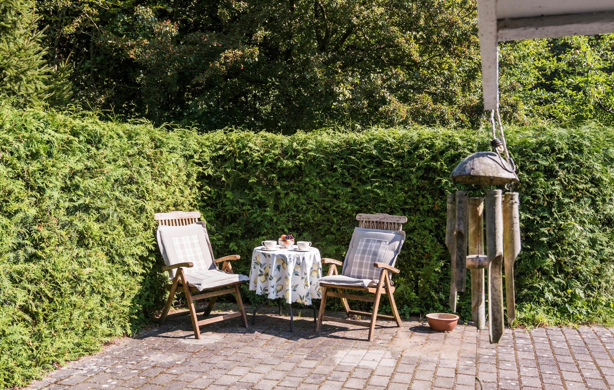 Treten Sie auf die Terrasse mit schönem Blick in den grünen Garten und genießen Sie an langen Sommerabenden eine ganz besondere Ruhe, wenn die Vögel in den Baumwipfeln pfeifen und auf dem Grill köstliche Gerichte brutzeln.