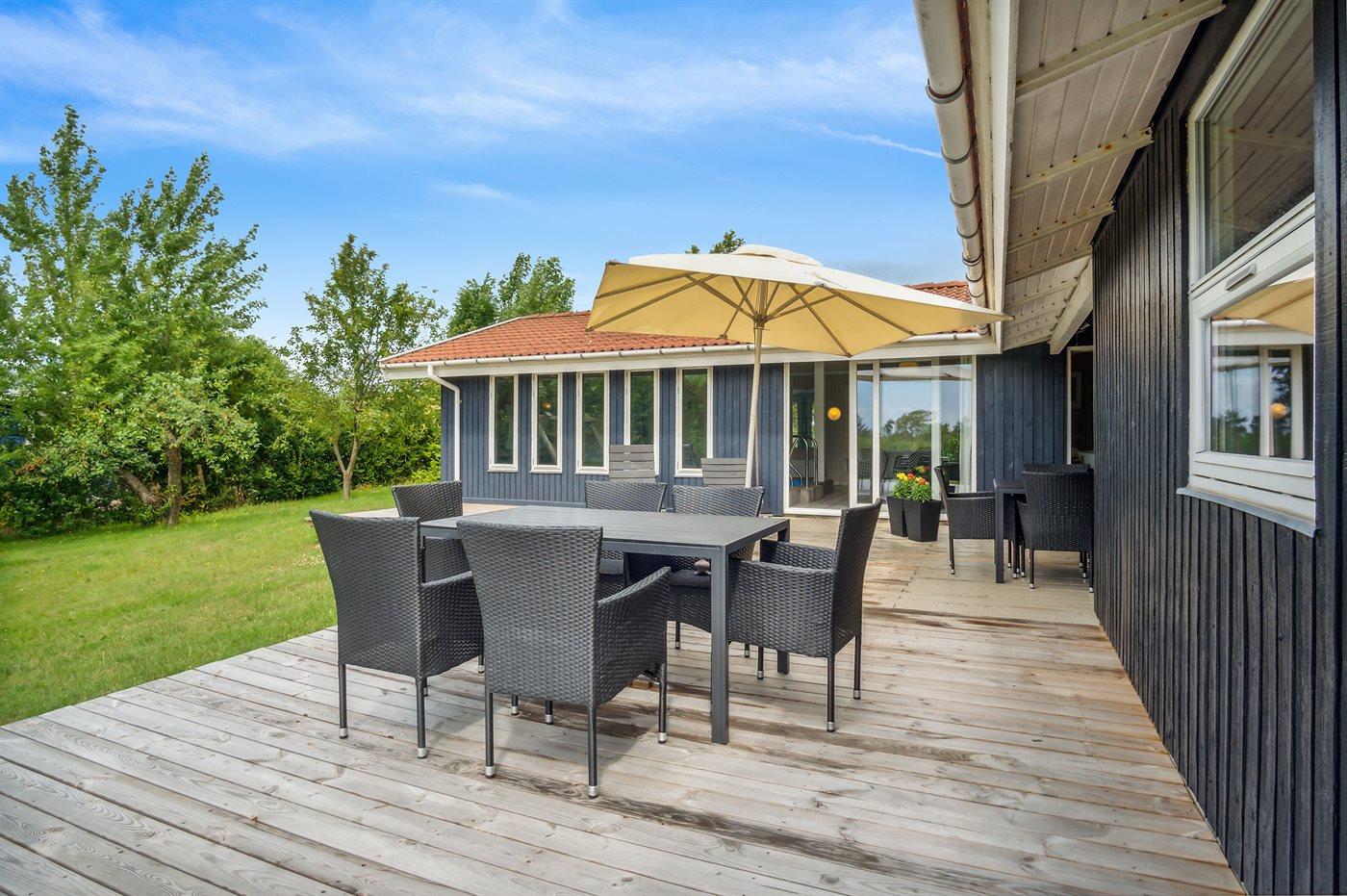 Es gibt insgesamt 5 Schlafzimmer mit jeweils 2 Schlafplätzen sowie 2 Badezimmer mit Duschnische und Fußbodenheizung. An drei Seiten des Hauses verläuft eine große Holzterrasse, die teilweise überdacht ist und dazu einlädt, die frische Luft zu genießen.