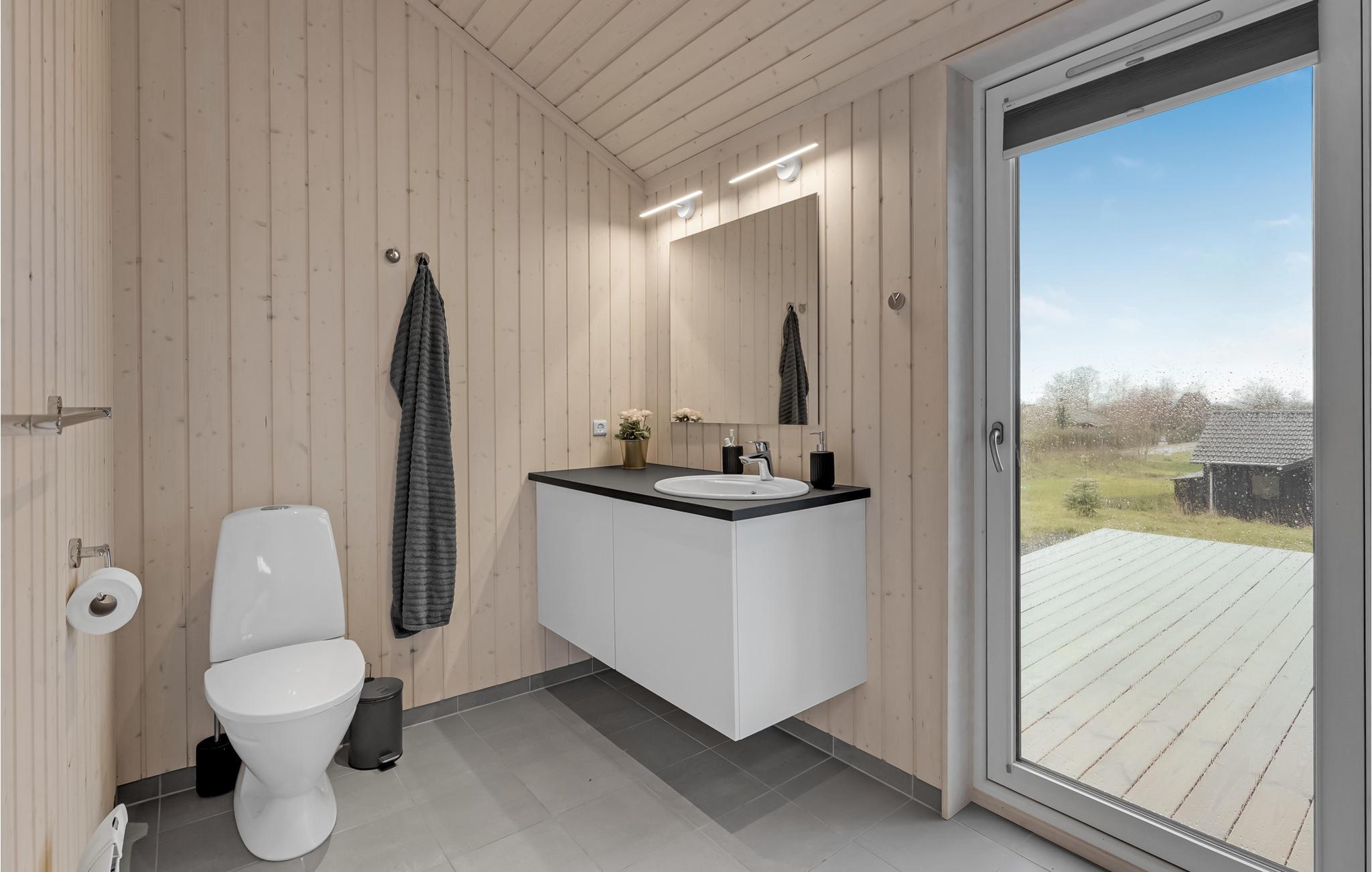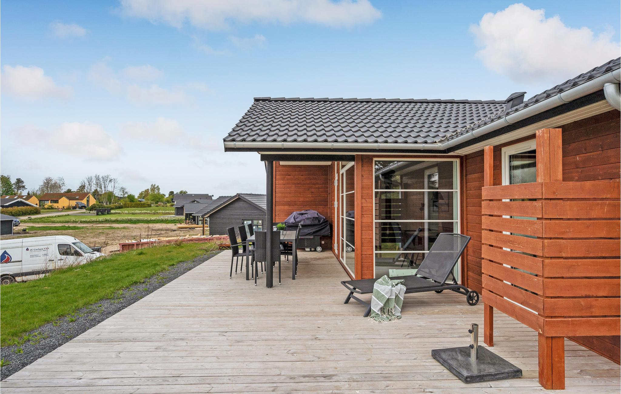 Dieses sehr schöne Ferienhaus hat eine offene Küche mit Blick auf das Ess- und Wohnzimmer mit Kaminofen. Das einladende Haus verfügt über 3 Schlafzimmer und einen Alkoven im Wohnzimmer sowie 2 Badezimmer, beide mit Dusche. Vom Wohnzimmer kommen Sie zur offenen und überdachten Terrasse. Wird es om Sommer zu heiß, können Sie sich unter der Außendusche im Garten abkühlen.