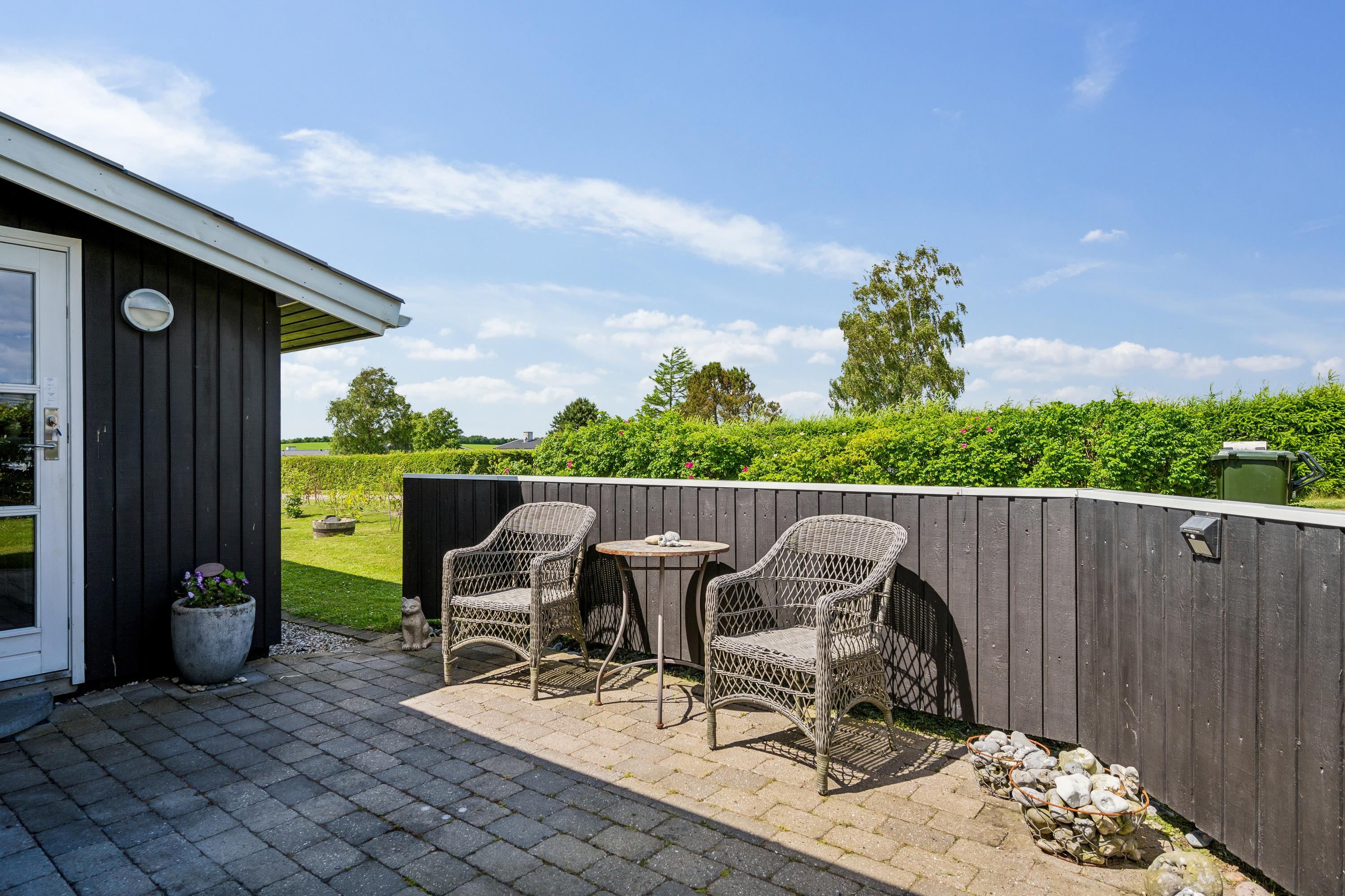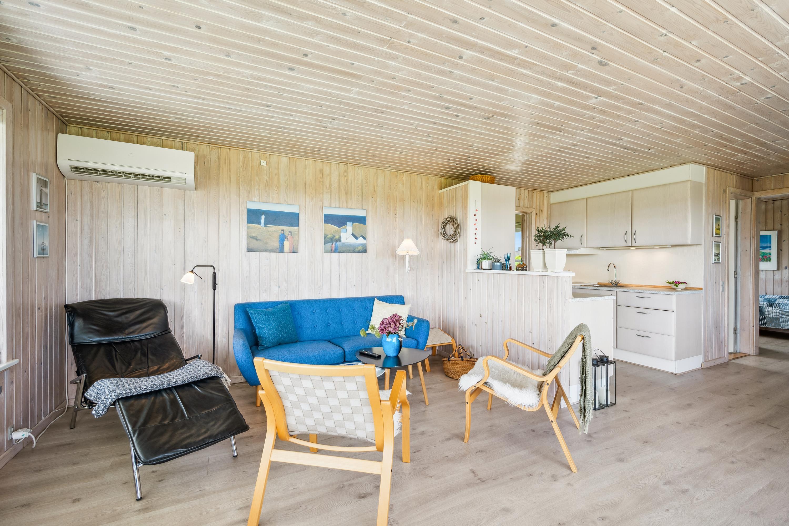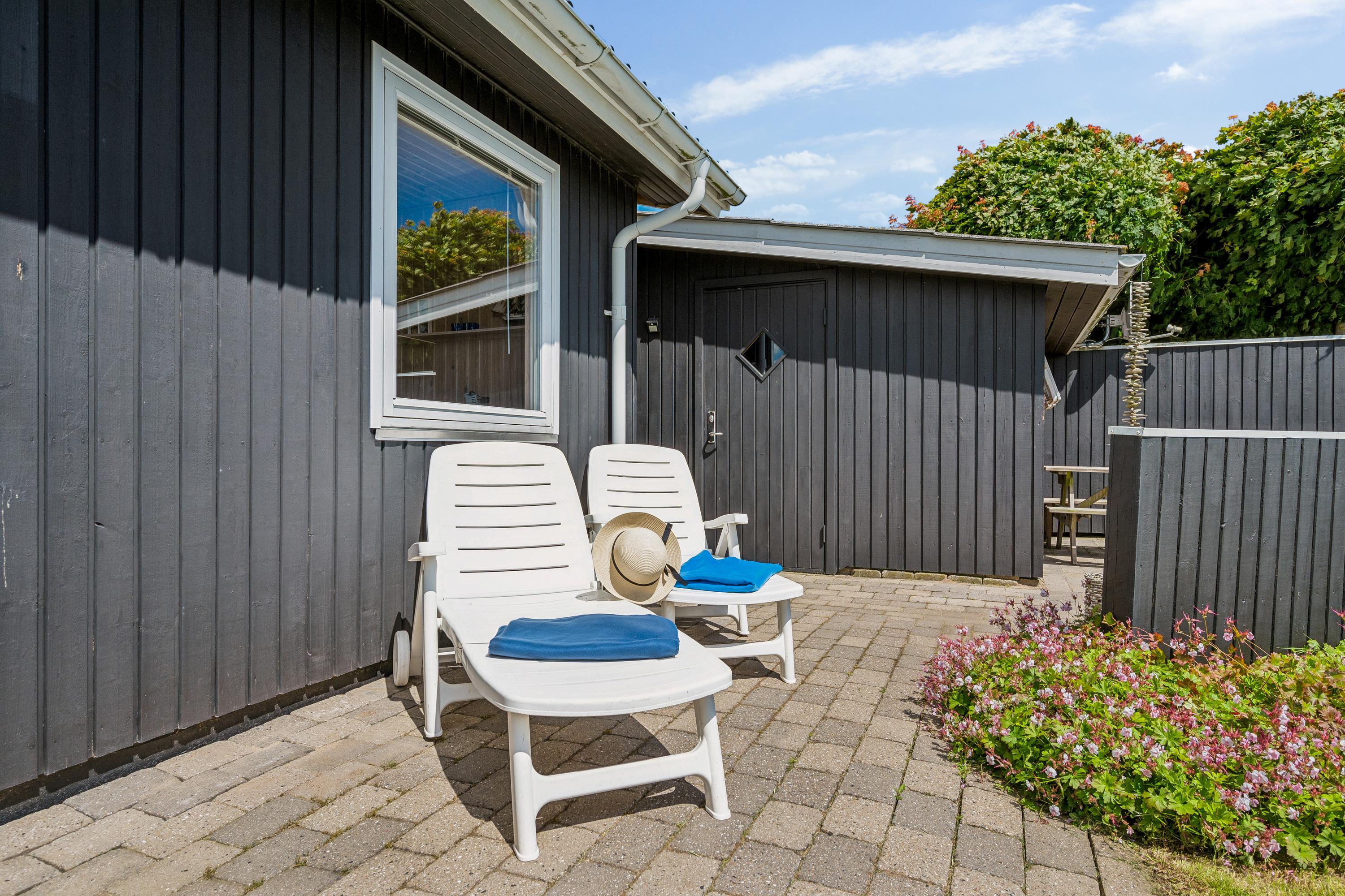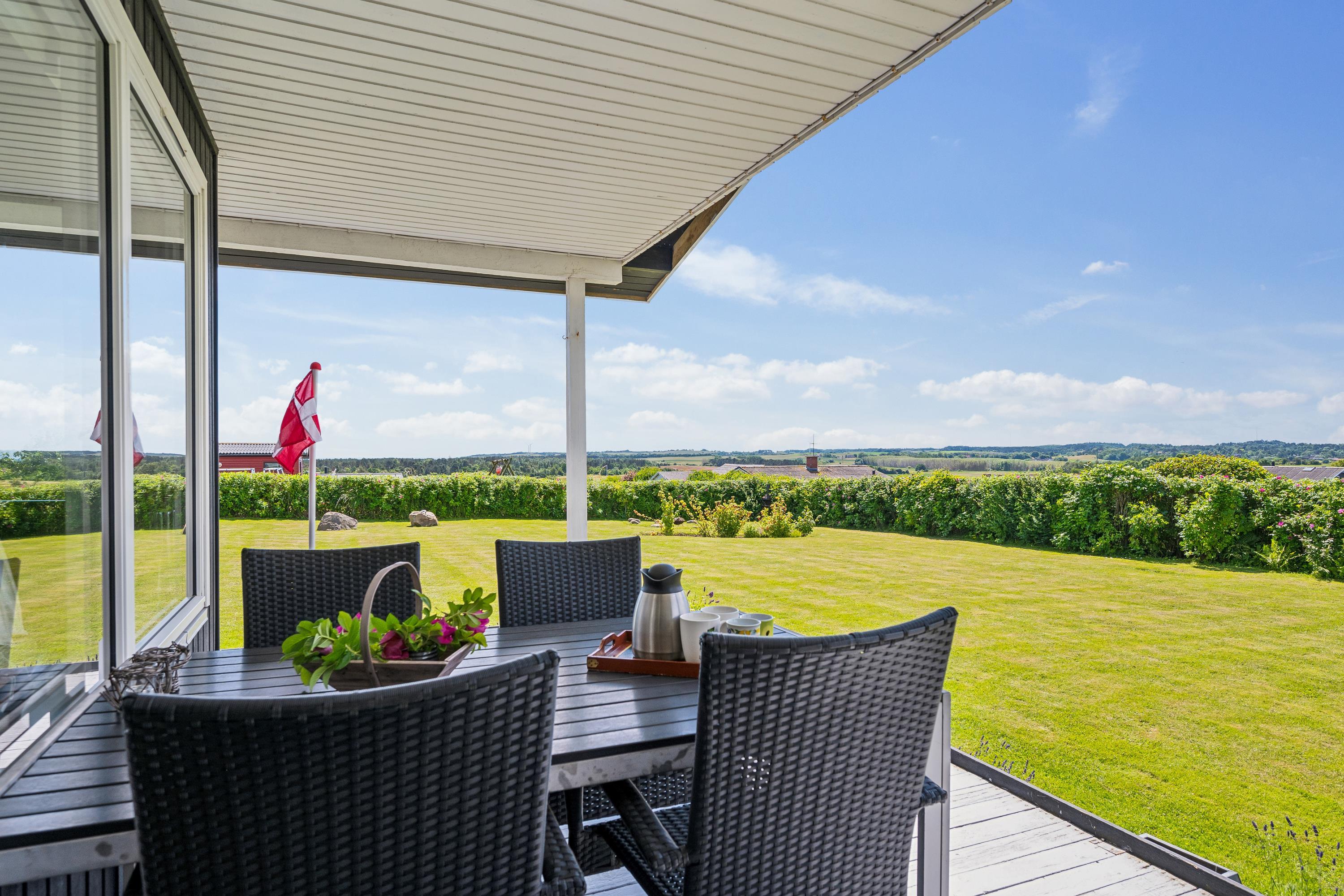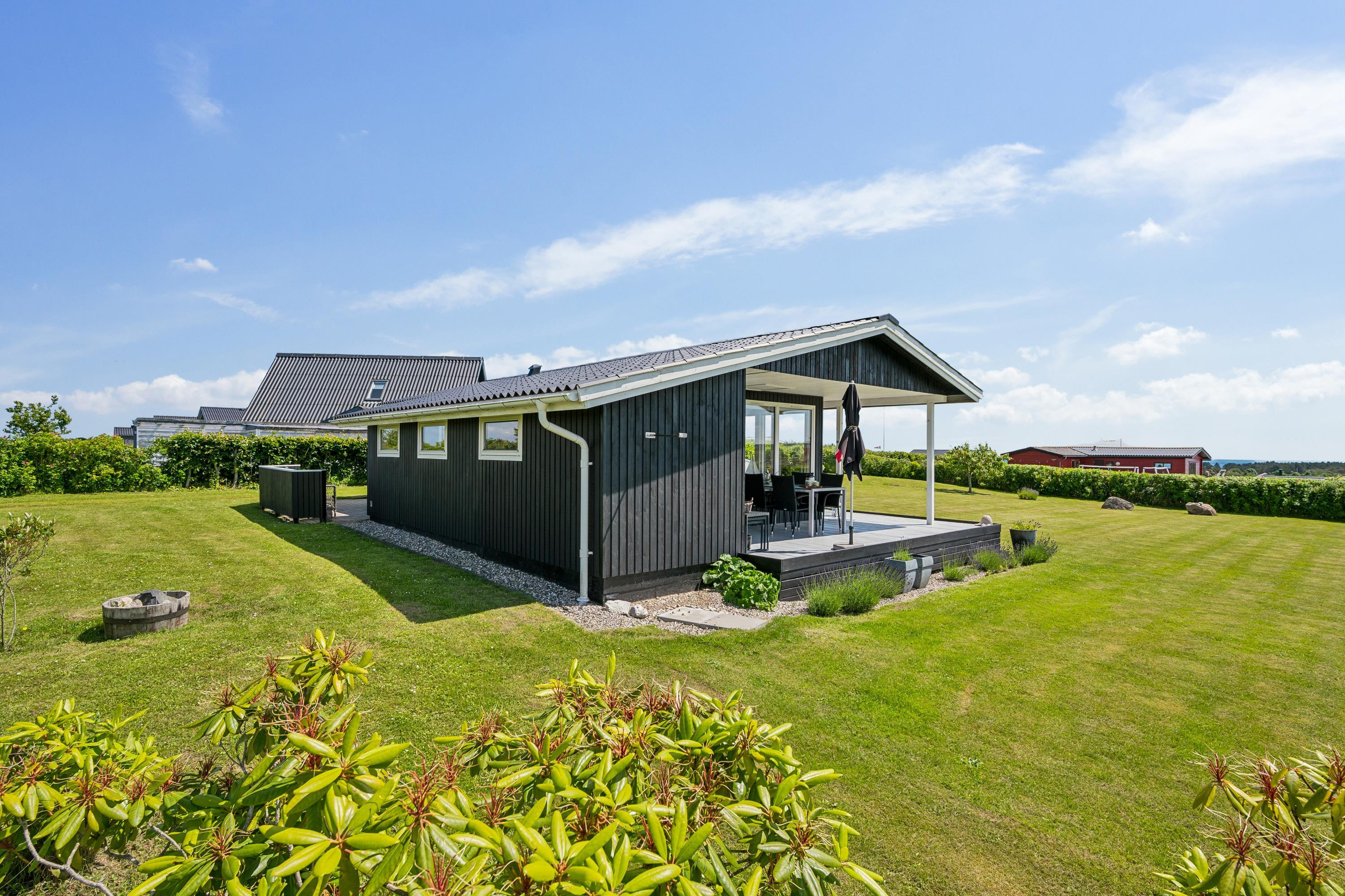 Älteres, modernisiertes und sehr gepflegtes Ferienhaus in der Nähe eines kinderfreundlichen Strandes und mit schöner Aussicht auf das Kattegat. Schöne, teilweise überdachte Süd-West-Terrasse aus Holz/Fliesen mit Gartenmöbeln, Sonnenliegen, Sonnenschirm und Außengrill. Außerdem gibt es auf dem Grundstück eine Lagerfeuerstelle, einen Sandkasten und Spielgeräte.