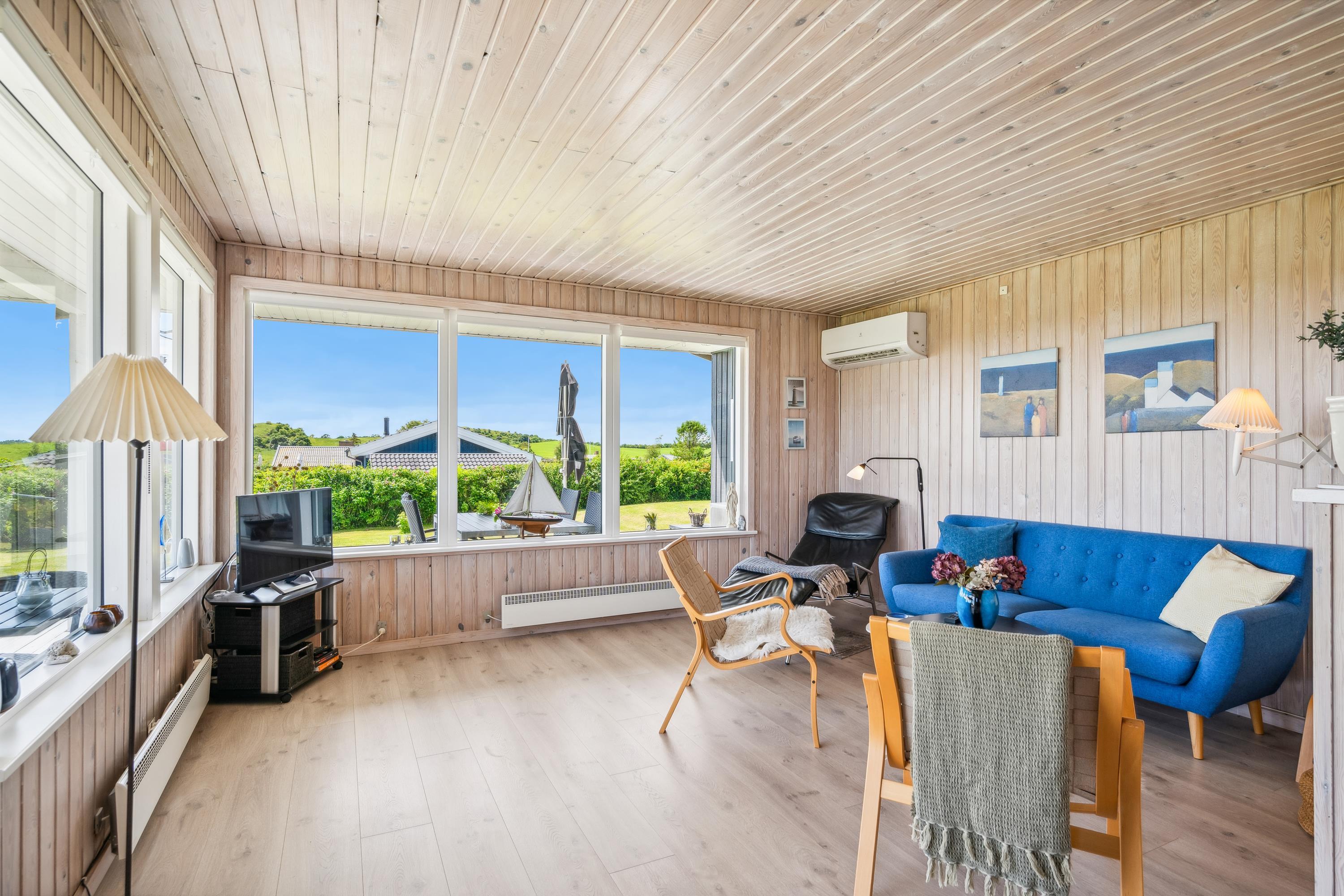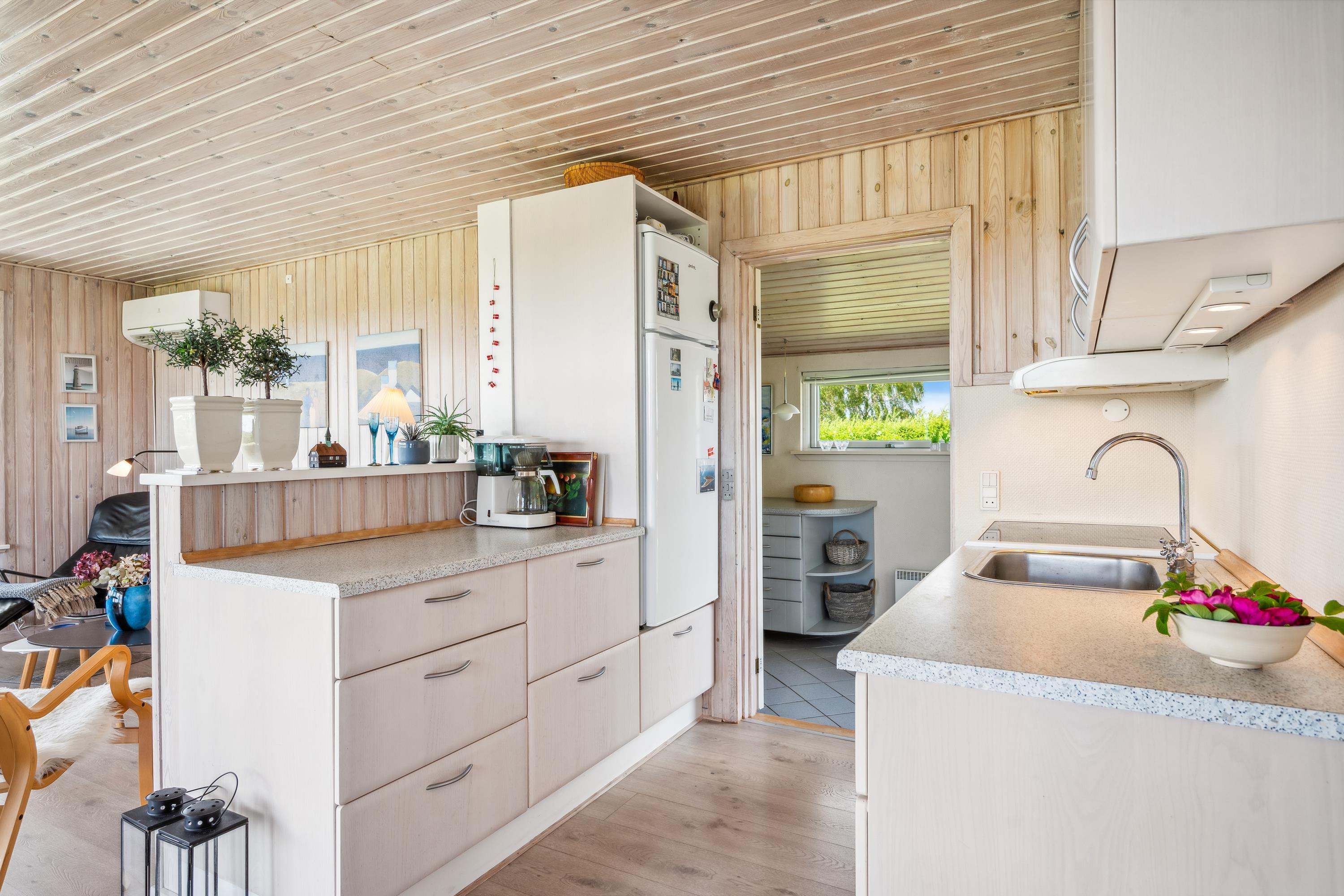 Gemütliches und gut eingerichtetes Wohnzimmer mit guter Essecke für 4 Personen, Fernseher mit dänischen und deutschen Sendern, Stereoanlage mit CD und Radio. In offener Verbindung mit dem Wohnzimmer befindet sich eine gute Küche mit Cerankochfeld mit Backofen, Mikrowelle und Kühlschrank mit kleinem separatem Gefrierfach. Neueres Badezimmer mit Dusche und Fußbodenheizung. Praktischer, großer Eingangsbereich mit Waschmaschine und Aufbewahrungsmöglichkeit für Schuhe und Oberbekleidung. Das Haus beherbergt 3 gute Schlafzimmer: 1 mit 2 Einzelbetten und 2 mit je 1 Einzelbett. Internet- Zugang vorhanden.