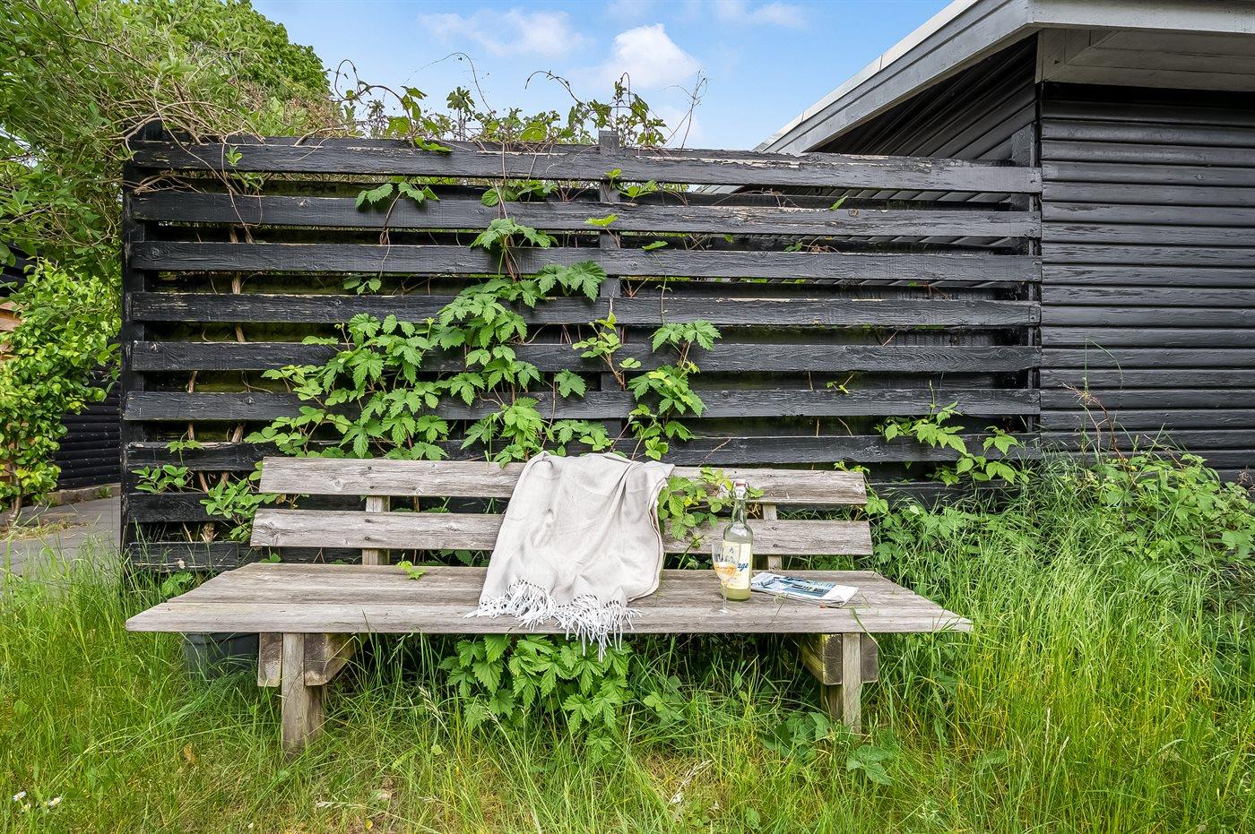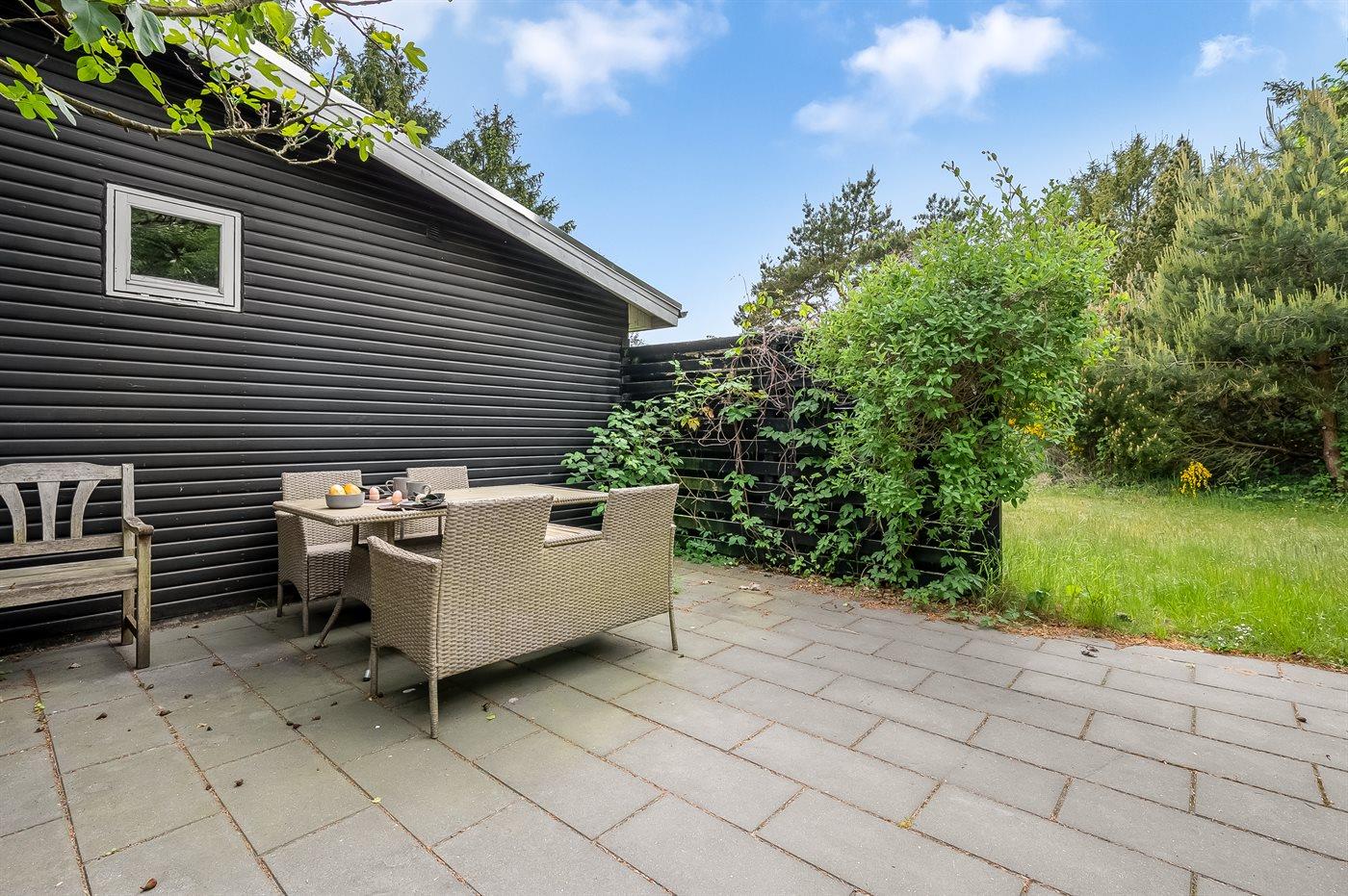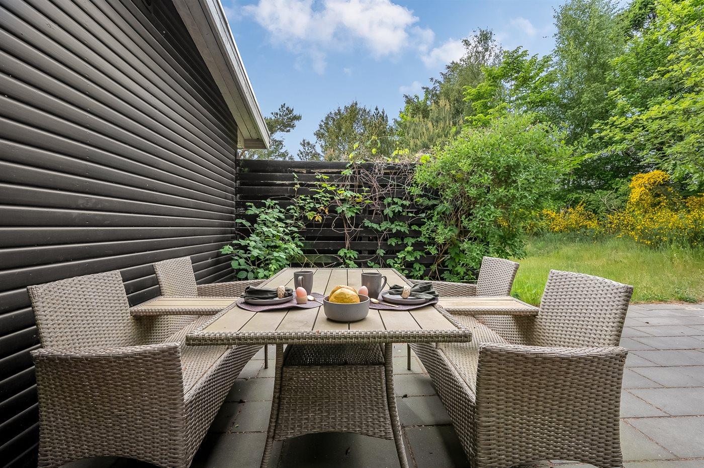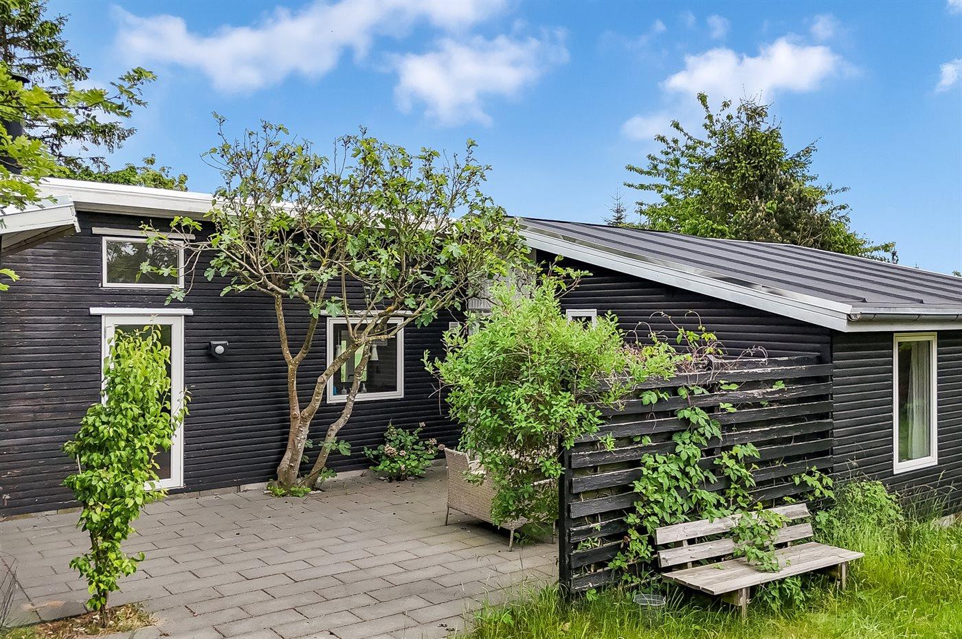 Das Haus verfügt über ein schönes und gut angelegtes Naturgrundstück mit mehreren lauschigen Ecken sowie Spielecken für die jüngsten Feriengäste. Genieße die erste Tasse Kaffee des Tages auf der abgeschirmten Terrasse im Schatten des Feigenbaums, wo du auch an warmen Sommerabenden leckere Mahlzeiten einnehmen kannst, und beende den Tag mit Blick auf die Felder, während die Sonne untergeht.