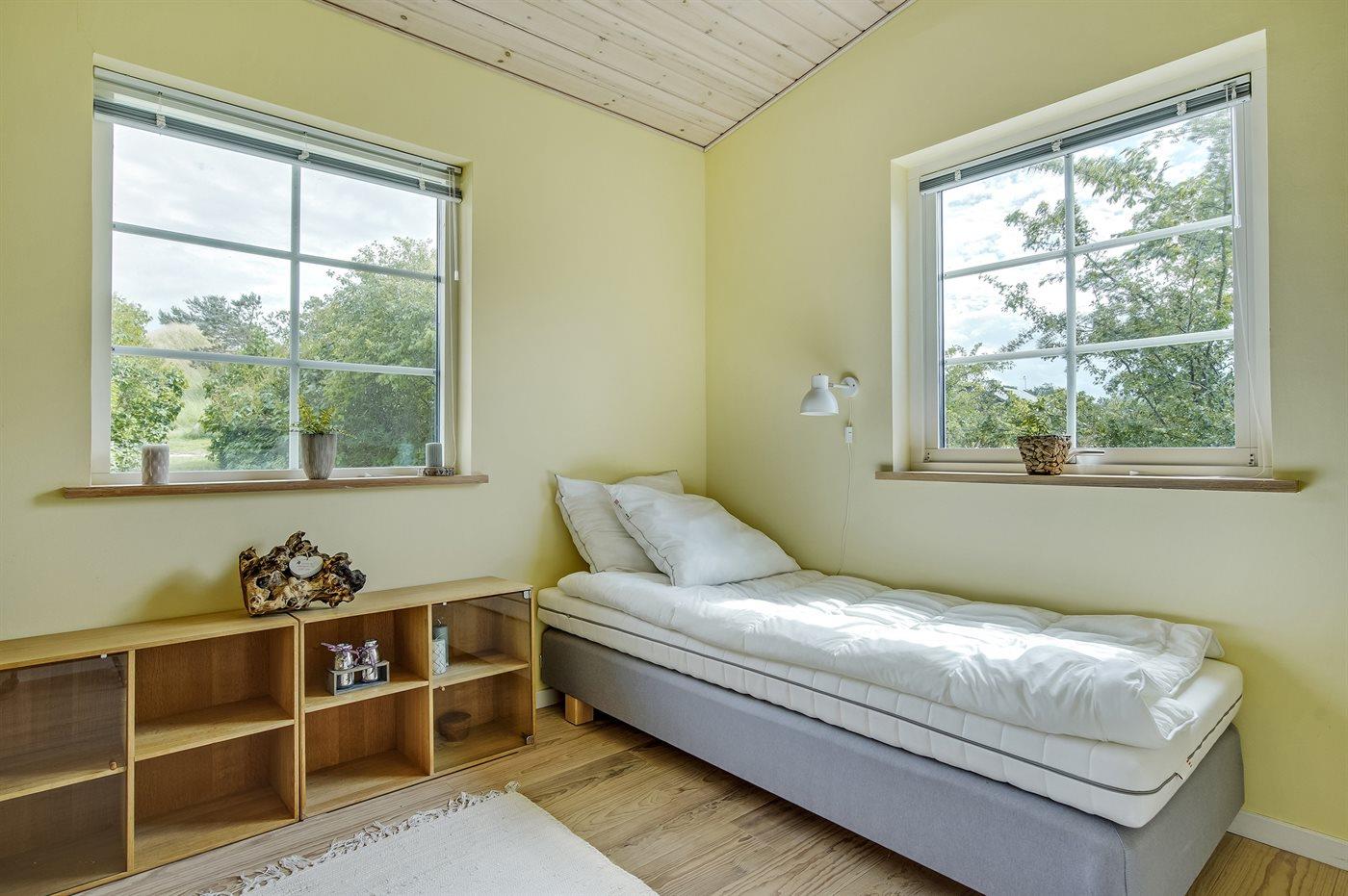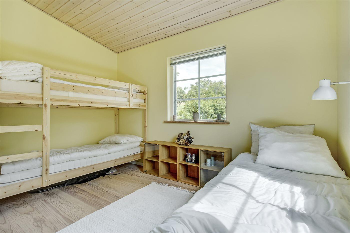 Die Schlafplätze verteilen sich auf 3 Schlafräume. 2 Schlafplätze in einem Doppelbett. 2 Schlafplätze in Einzelbetten. 2 Schlafplätze in einem Etagenbett. 1 Schlafplatz auf einer Matratze. 1 von diesen Schlafplätzen befindet sich im offenen Obergeschoss.