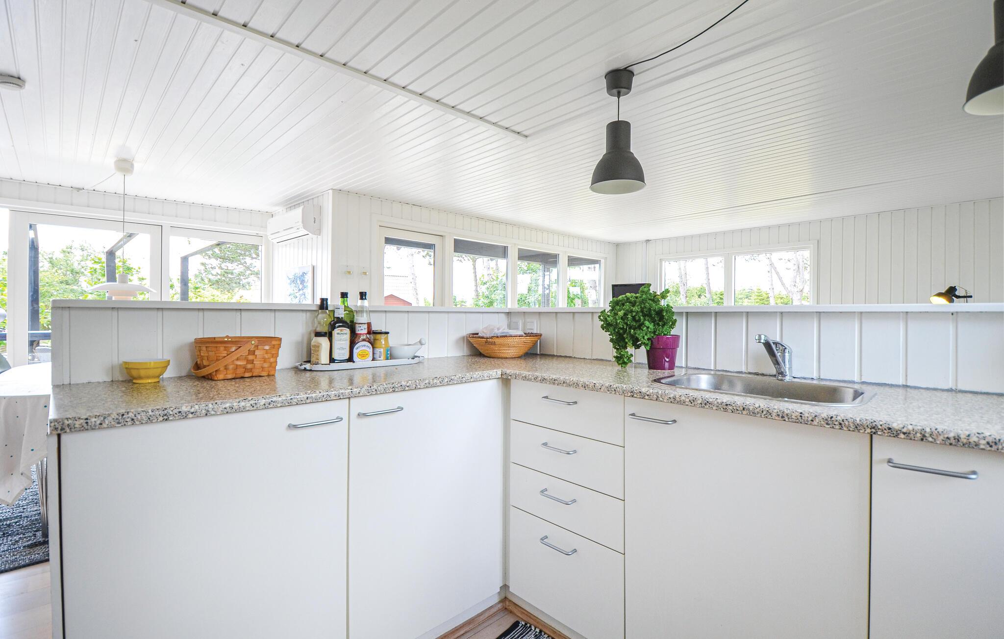 Verbringen Sie Ihren Urlaub in der 2. Reihe zum Meer mit einer fantastischen Aussicht über das Wasser von der großen Holzterrasse, mit der Insel Hjelmen in der Ferne.