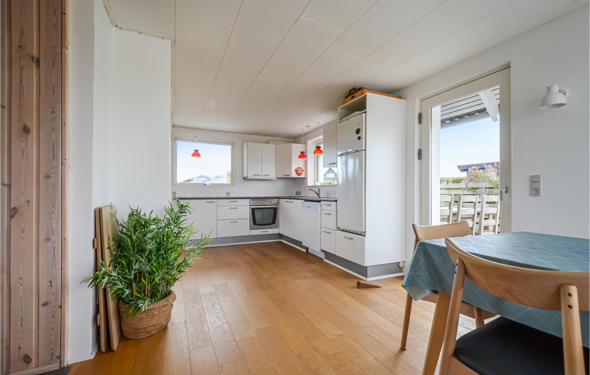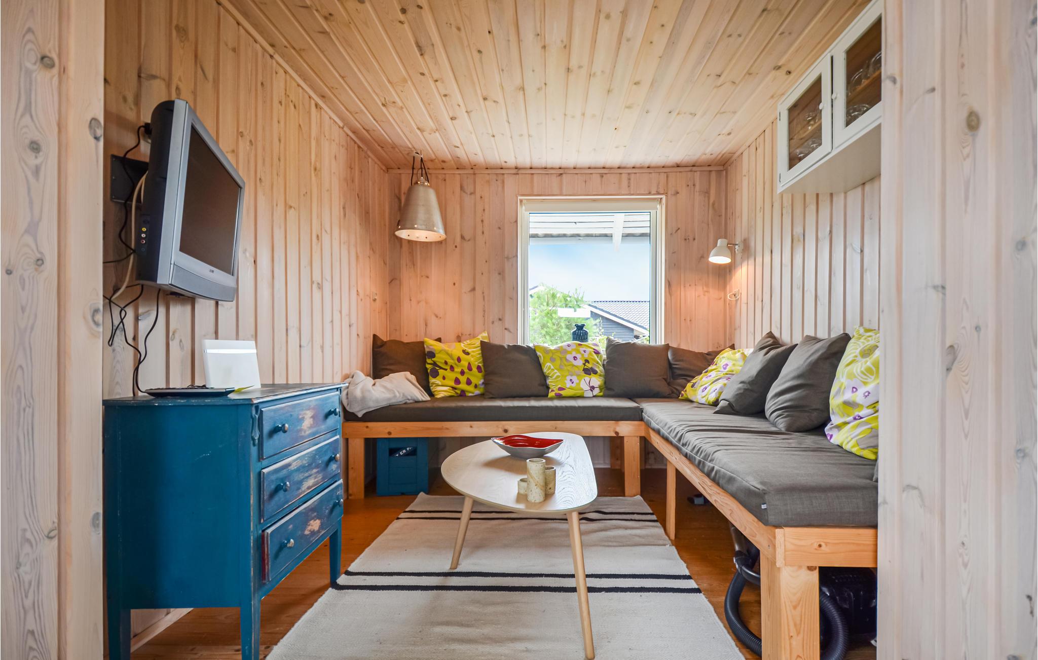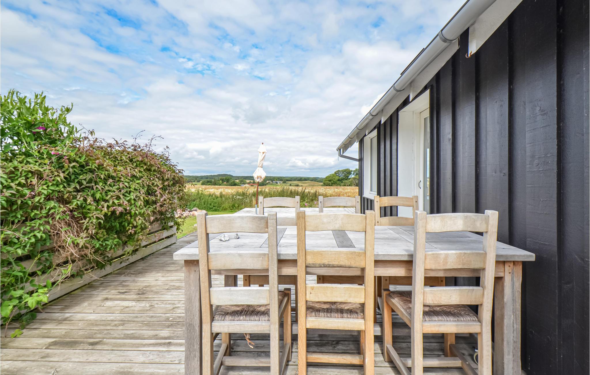 Das Ferienhaus auf zwei Ebenen befindet sich in der Nähe des Strandes von Dråby, der als gutes Angel- und Badegewässer bekannt ist. Im ersten Stock befinden sich zwei helle Räume mit Blick auf Felder, Meer und Jernhatten. Im Erdgeschoss befindet sich ein natürlicher Treffpunkt mit offener Verbindung zwischen Küche, Essbereich und kleiner TV-Lounge. Das große Giebelfenster lässt das Licht ins Innere und bietet Meerblick und Blick auf die wunderschöne Natur, die sich in der klassischen Hügellandschaft schlängelt. Der charmante Holzofen verbreitet Wärme und Gemütlichkeit.