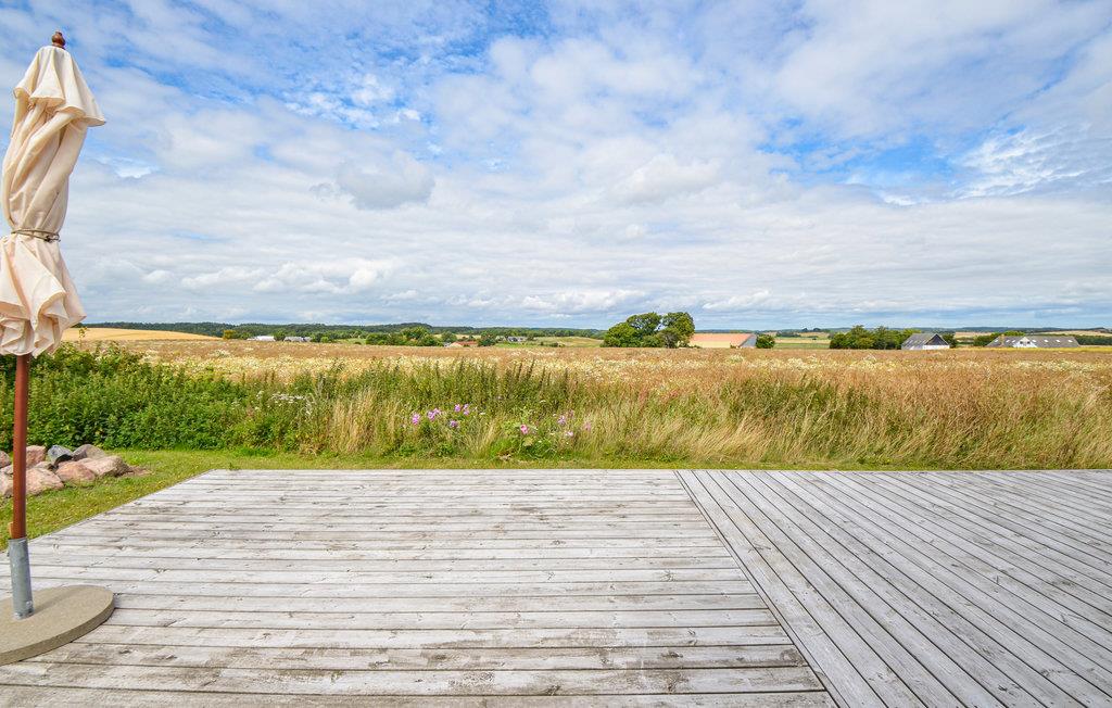 Charmantes Ferienhaus nahe Dråby Strand mit Meerblick, Holzofen und großer Terrasse für erholsame Urlaubstage.
