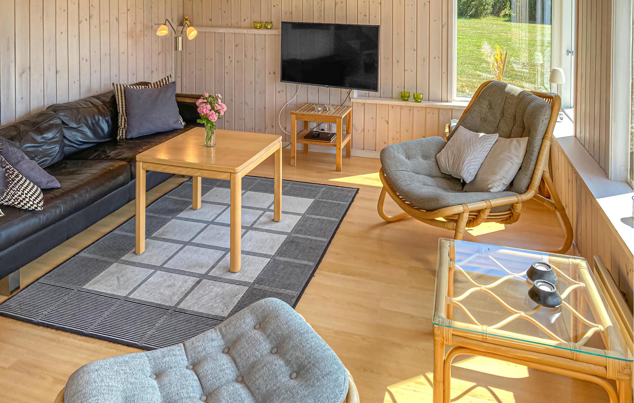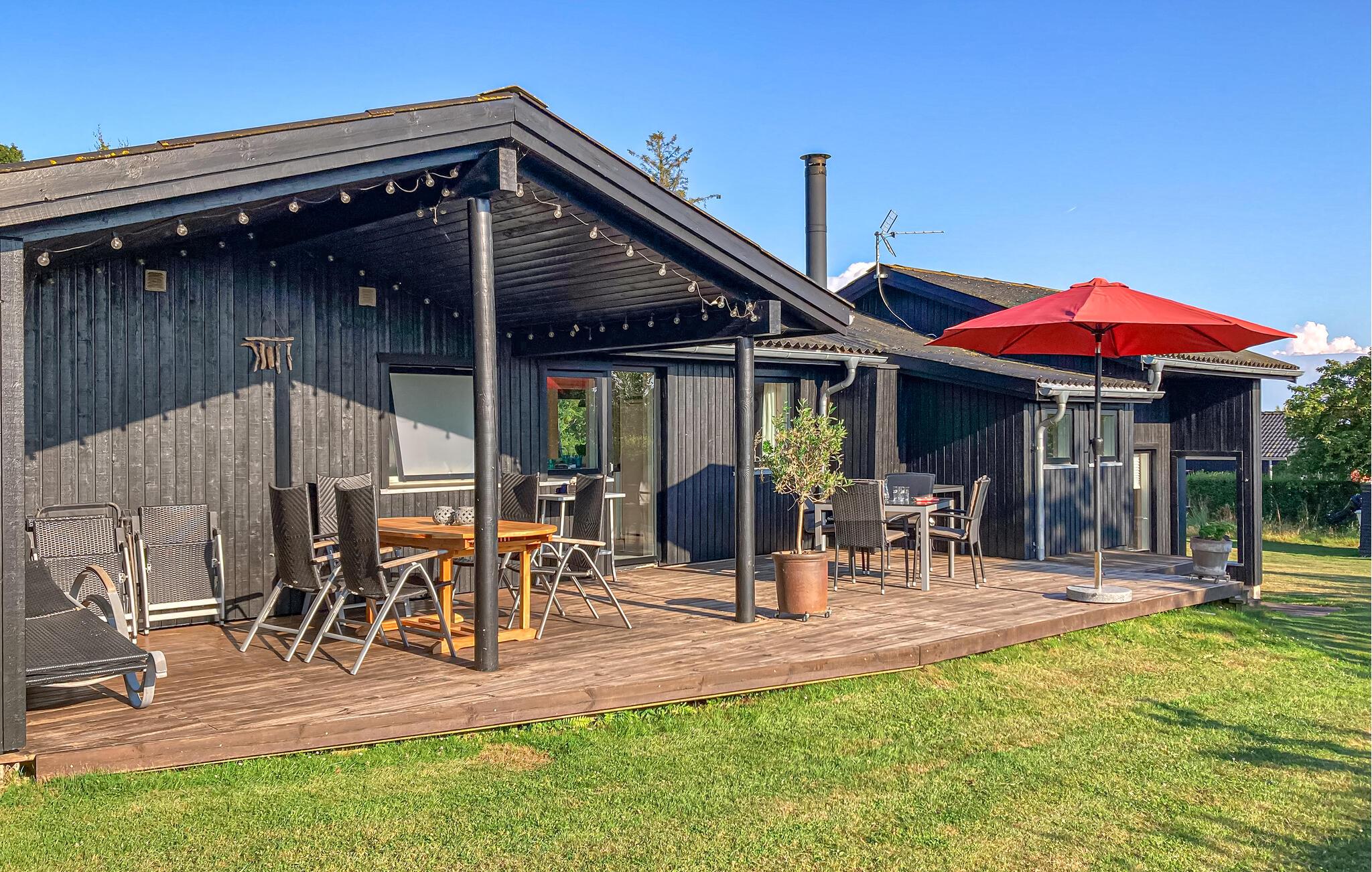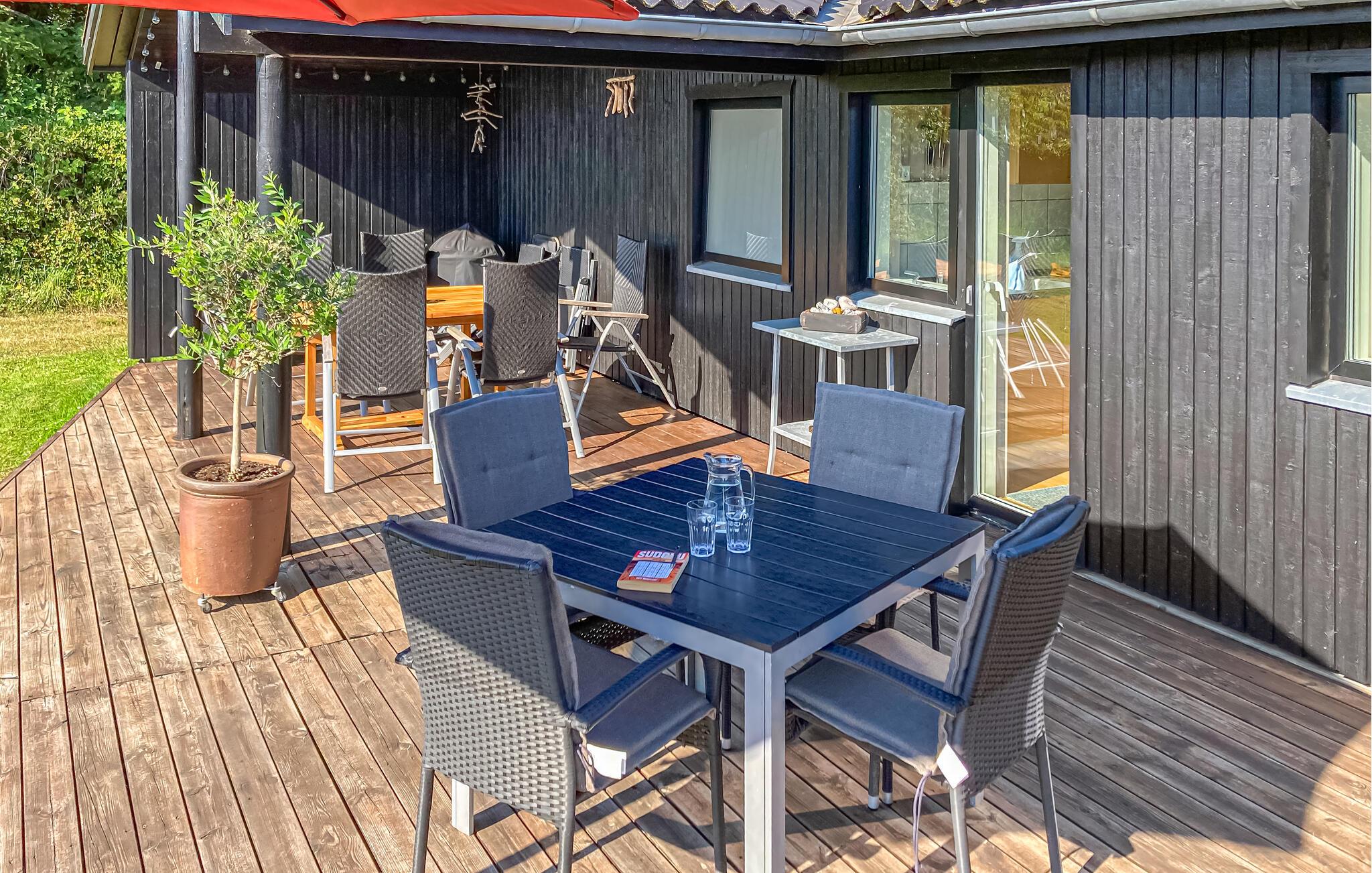 Komplett renoviertes Ferienhaus mit Aussicht auf die Insel Hjelm. Das schöne Grundstück liegt nur 300 m vom herrlichen Bade- und Angelstrand. Auch eine gute Slipstelle für das eigene Boot ist angelegt. Beim Ferienhaus gibt es einen Fischreinigungsplatz. Wohnzimmer ist auf 2 Niveaus angelegt und deshalb können Sie hier gut Ihre Freizeit gestalten. Sie finden immer eine stille Ecke oder einen Platz für ein Brettspiel. Sie können auch auf den großen hölzernen Terrassen um das ganze Haus herum das Außenleben genießen. Auf der Terrasse ist eine Hängematte. Das Grundstück ist groß und eignet sich auch zum Fußballspielen. Es gibt einen deutschen TV-Kanal. Im Garten haben Sie von mehreren beschaulichen Ecken Aussicht auf den Garten.