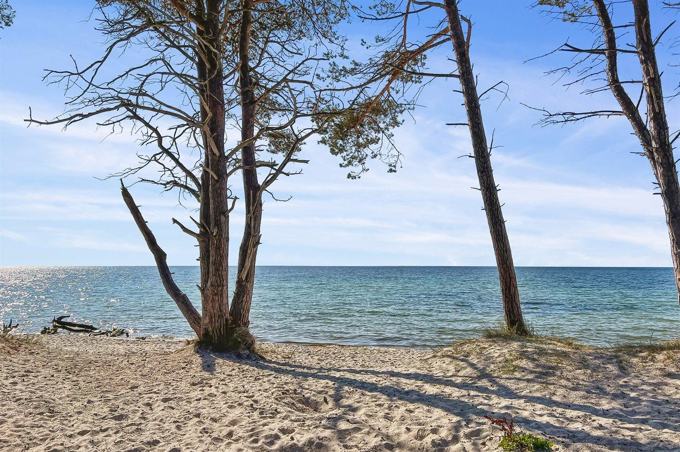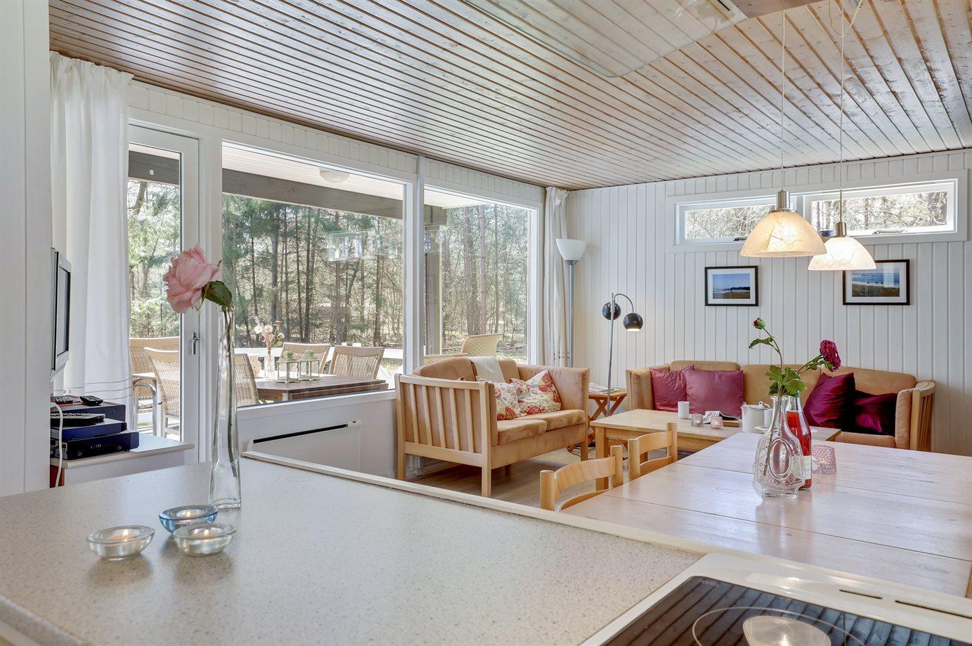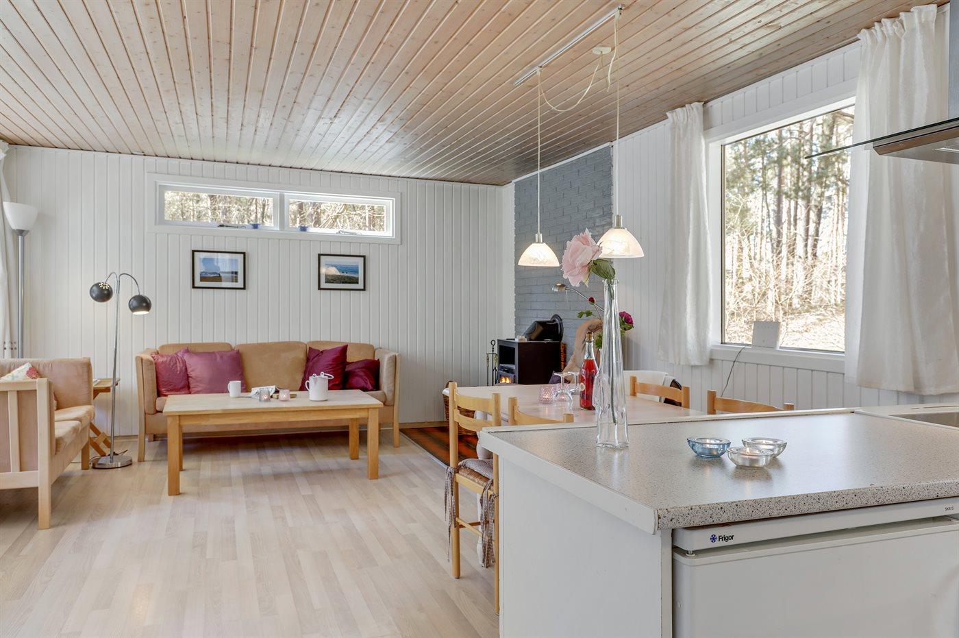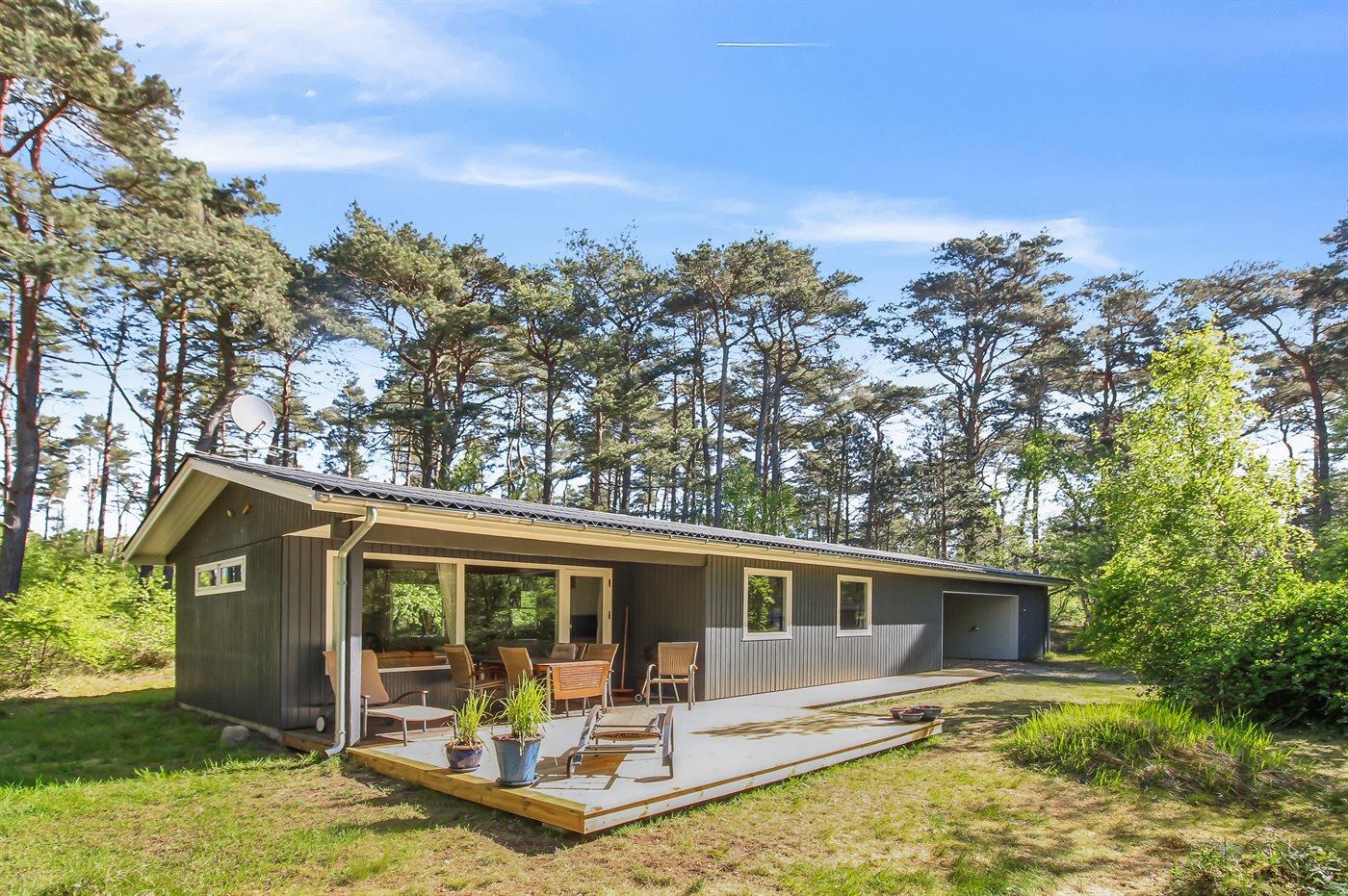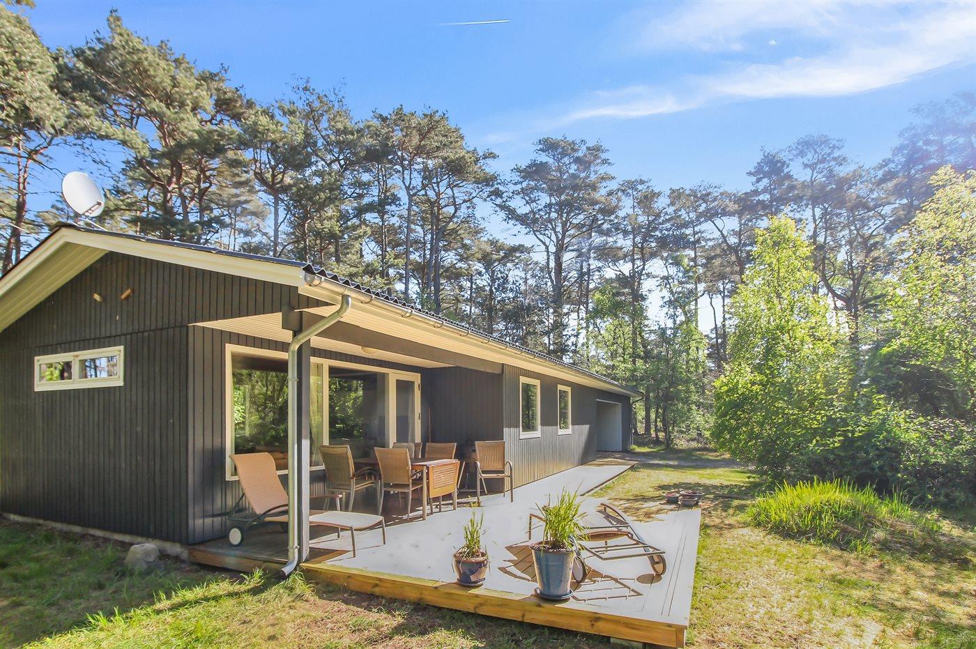 Gepflegtes und hübsch eingerichtetes Ferienhaus auf einem sehr großen Grundstück in einem attraktiven Ferienhausgebiet. Ein 18-Loch-Golfplatz und ein schöner Sandstrand befinden sich ganz in der Nähe. Vom Haus aus hat man Blick auf die dicht bewachsene grüne Umgebung mit hohen Fichten.