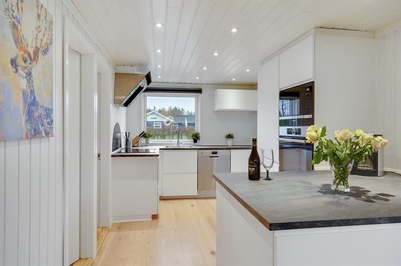 Die Küche ist mit Kühlschrank ausgestattet. Außerdem gibt es 4 Induktions-Kochzonen, Umluftofen, Mikrowelle sowie Geschirrspüler.