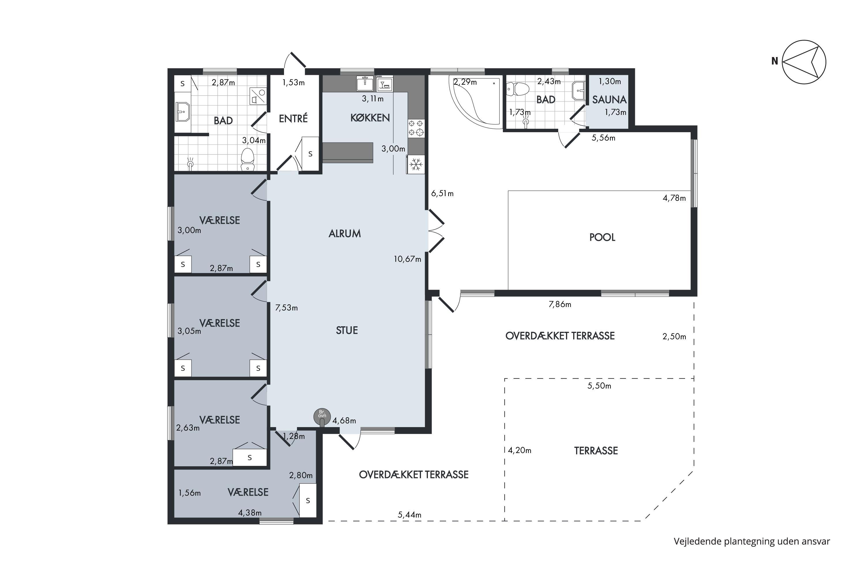 Schönes Ferienhaus mit Swimmingpool, Whirlpool und Sauna in Egsmark, zentral gelegen zu fast allen Sehenswürdigkeiten der Gegend. Strand und Wald sind zu Fuß erreichbar und das malerische Städtchen Ebeltoft liegt nur 5 Autominuten vom Haus entfernt. Herzstück des Hauses ist der 15 m2 große Poolraum mit Whirlpool und Sauna. Die Küche liegt in offener Verbindung zum kombinierten Wohn-/Esszimmer mit Kaminofen. TV mit dänischen Programmen. Internetzugang. Vier Schlafzimmer, davon zwei mit sehr guten Doppelbetten, eines mit einem Etagenbett und eines mit vier Schlafplätzen in Form von zwei Etagenbetten. Die beiden Badezimmer sind mit Fußbodenheizung ausgestattet. Schöne, geschlossene Terrasse mit fest installiertem Grill. Die Genvex-Lüftungsanlage sorgt für ein gutes Raumklima im Haus. Außerdem sind zwei Wärmepumpen installiert.