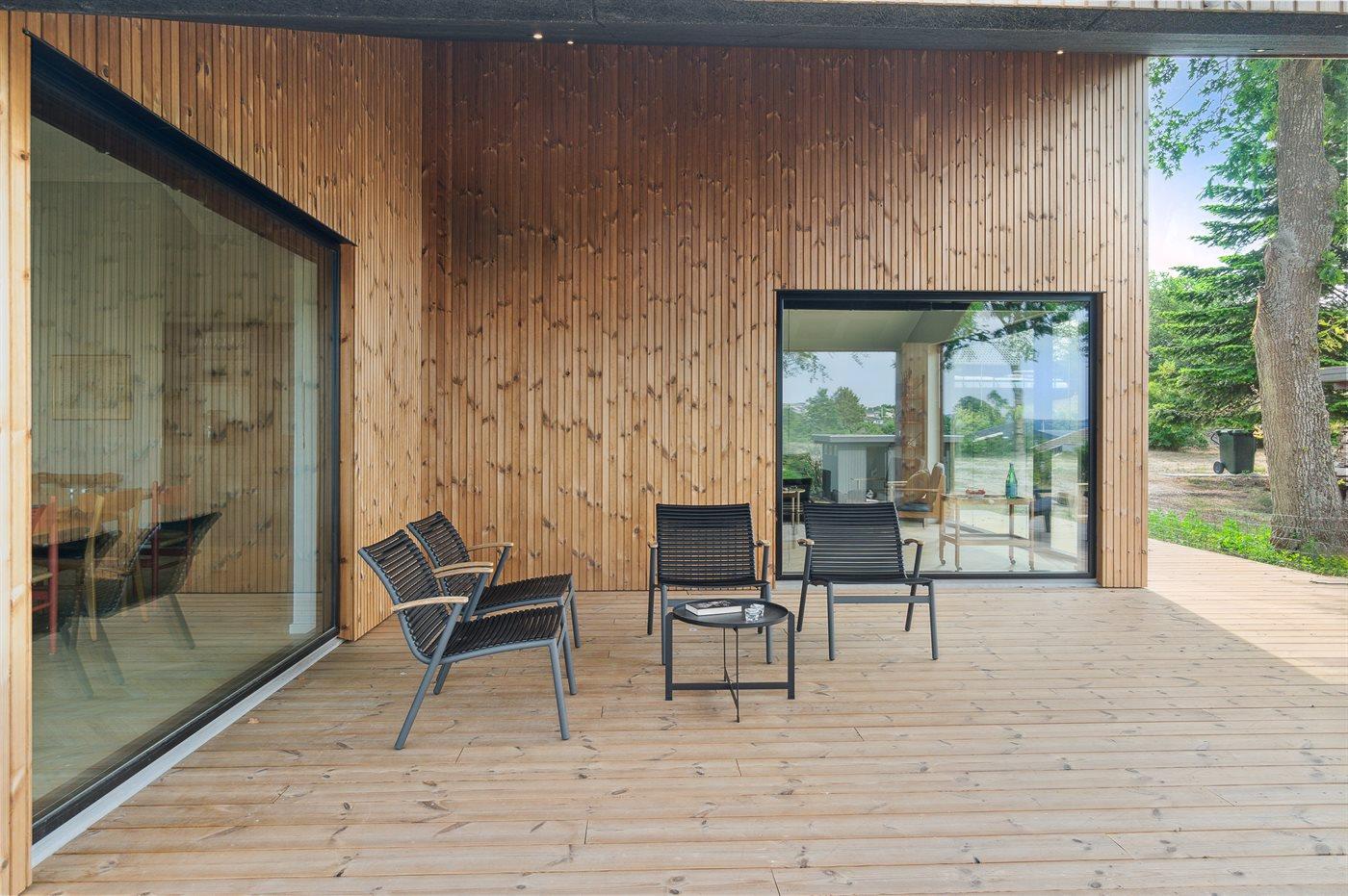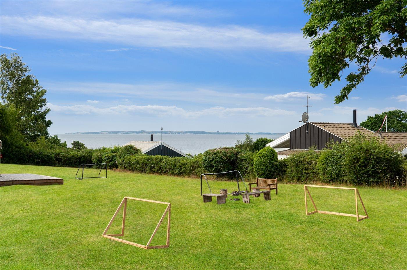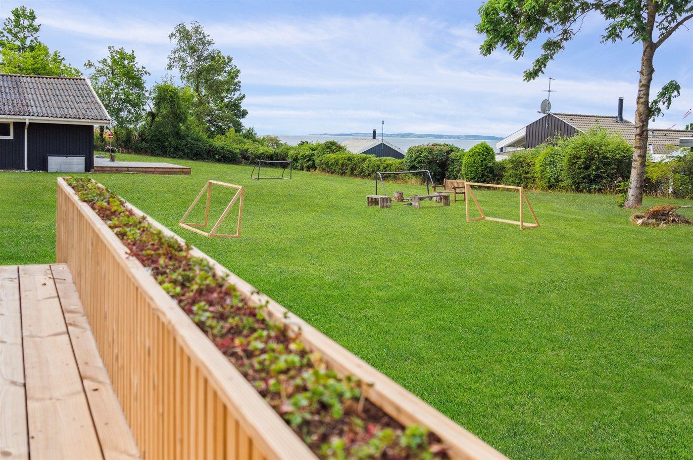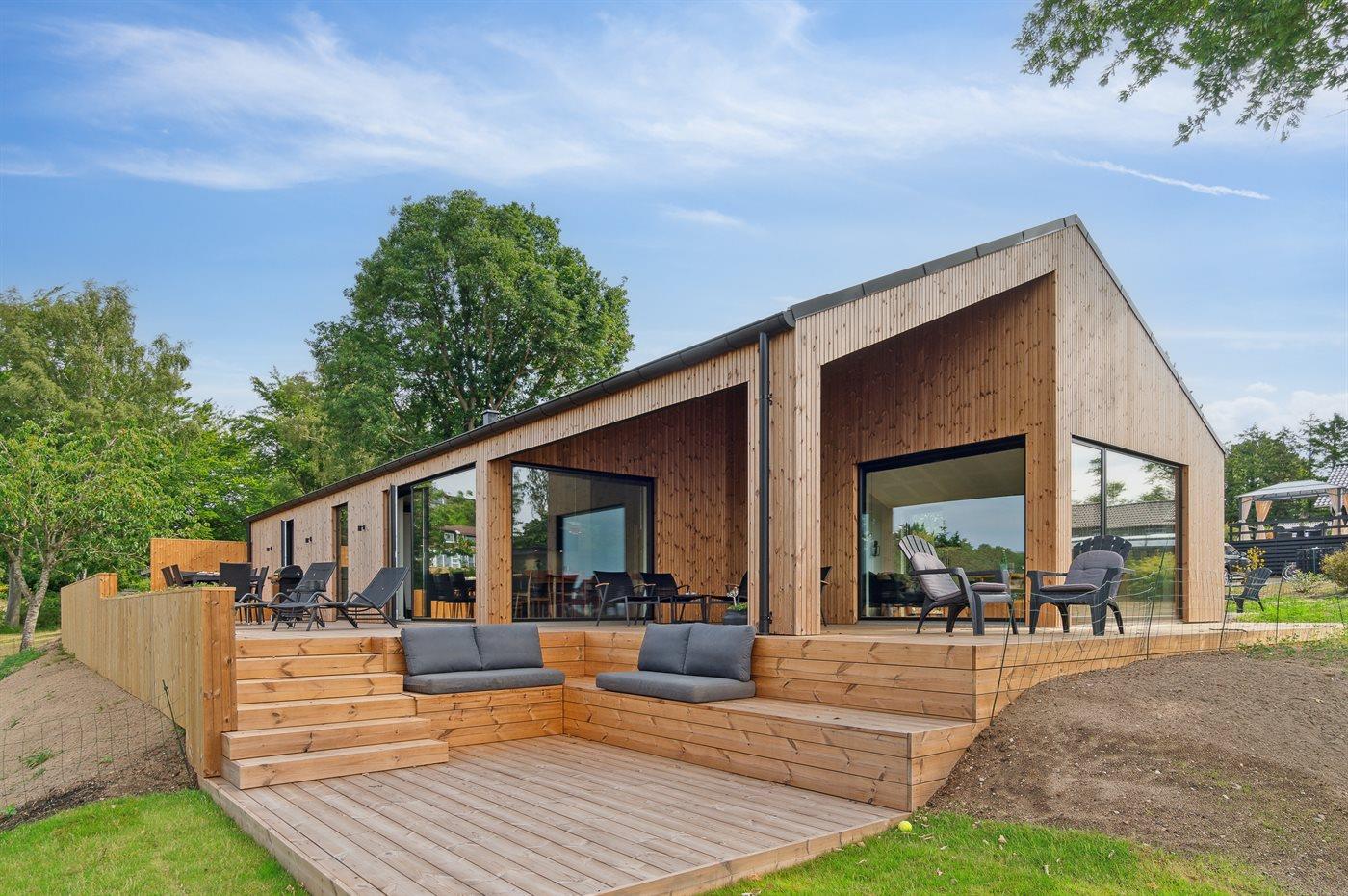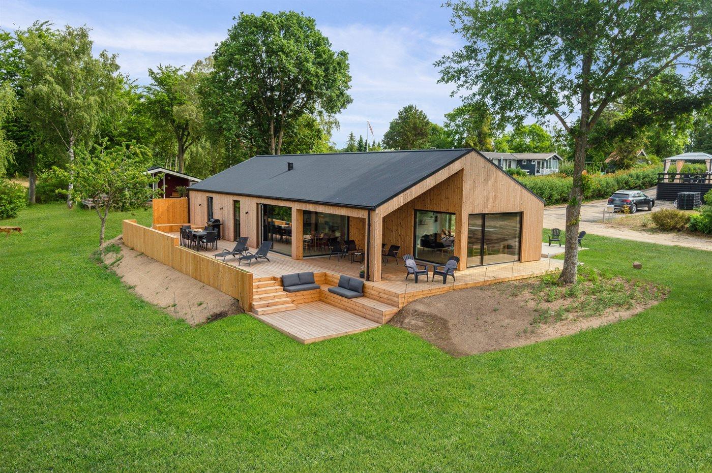 Modernes Ferienhaus mit Meerblick und großem Garten nahe Ebeltoft, ideal für Familien und Erholungssuchende.