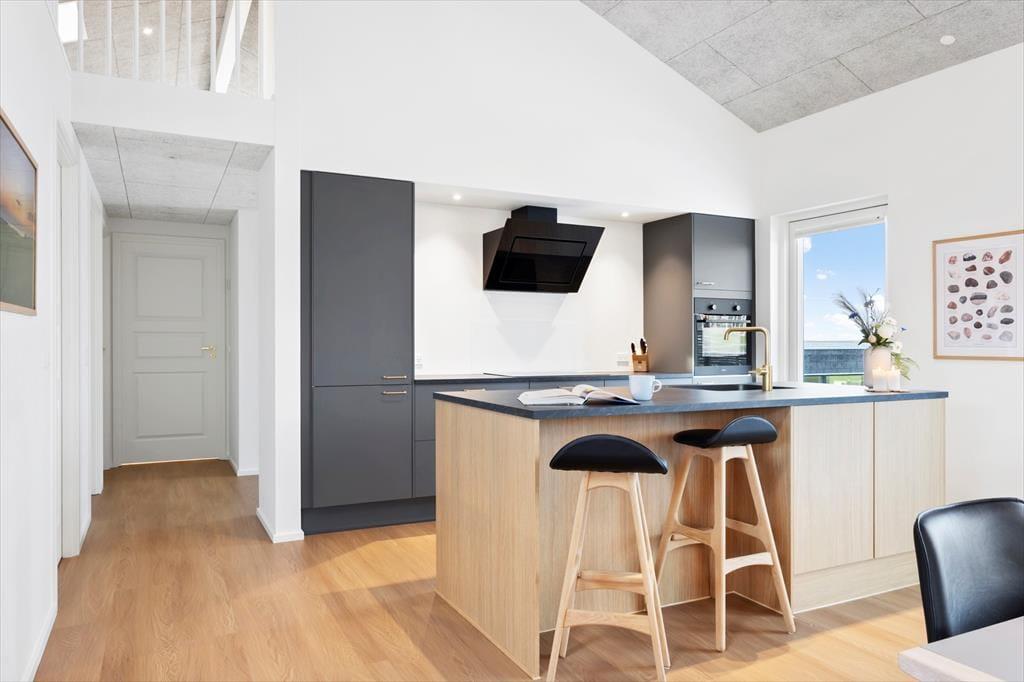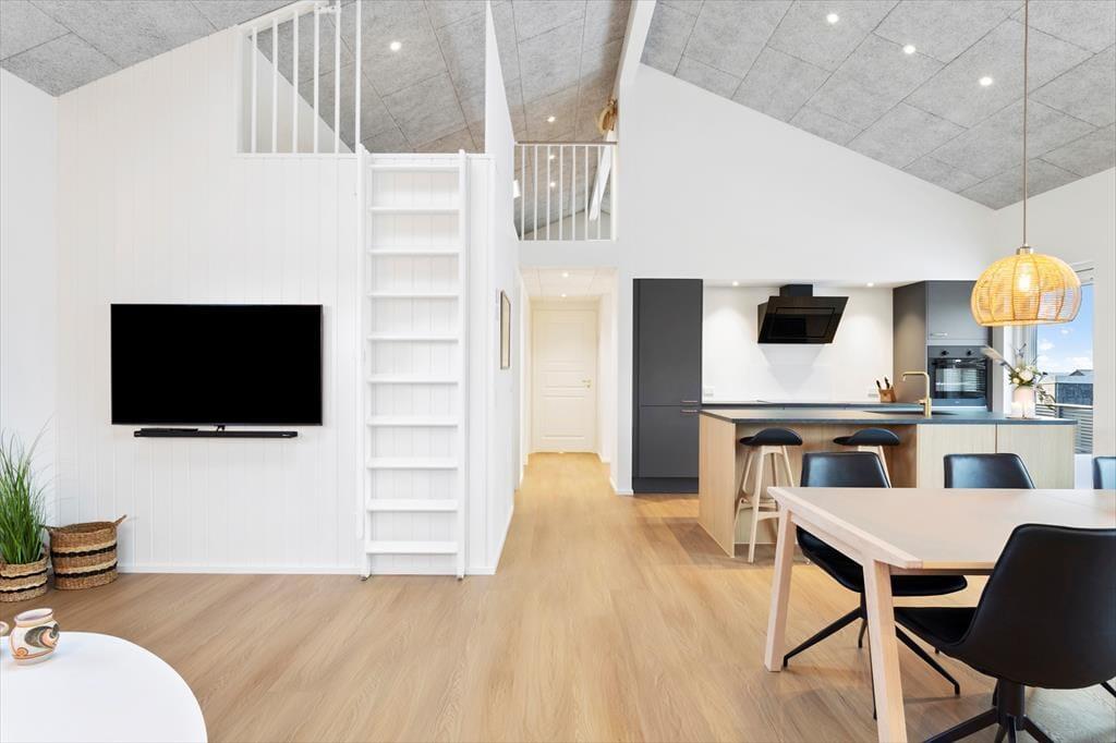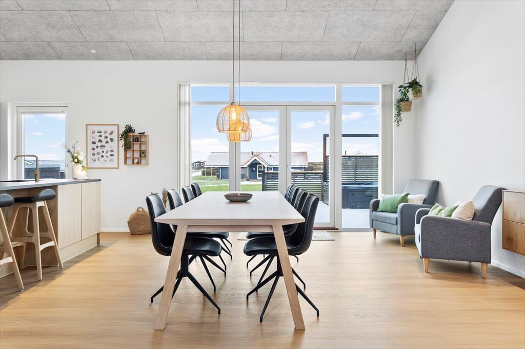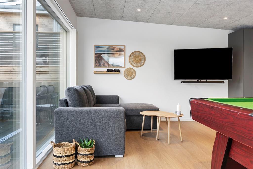 Im Inneren empfängt dich ein hell und modern eingerichtetes Ferienhaus, in dem große Fenster viel Tageslicht hereinlassen und zugleich den Blick auf den Fjord direkt in die Wohnräume holen. Die Stimmung ist ruhig und entspannt, sodass man sich sofort wohlfühlt – ganz gleich, ob der Urlaub mit Brettspielen am Esstisch, einer stillen Auszeit auf dem Sofa oder gemütlichen Abenden mit Gesprächen und Lachen verbracht wird. Die Platzierung des Schlafbodens verleiht dem Haus eine zusätzliche Dimension und bietet Kindern einen idealen Rückzugsort, während der Aktivitätsraum schnell zum Treffpunkt für Groß und Klein wird, wenn Billard oder Tischtennis auf dem Programm stehen. Hier ist Raum für gemeinsames Urlaubsleben ebenso wie für ruhige Momente ganz für sich.