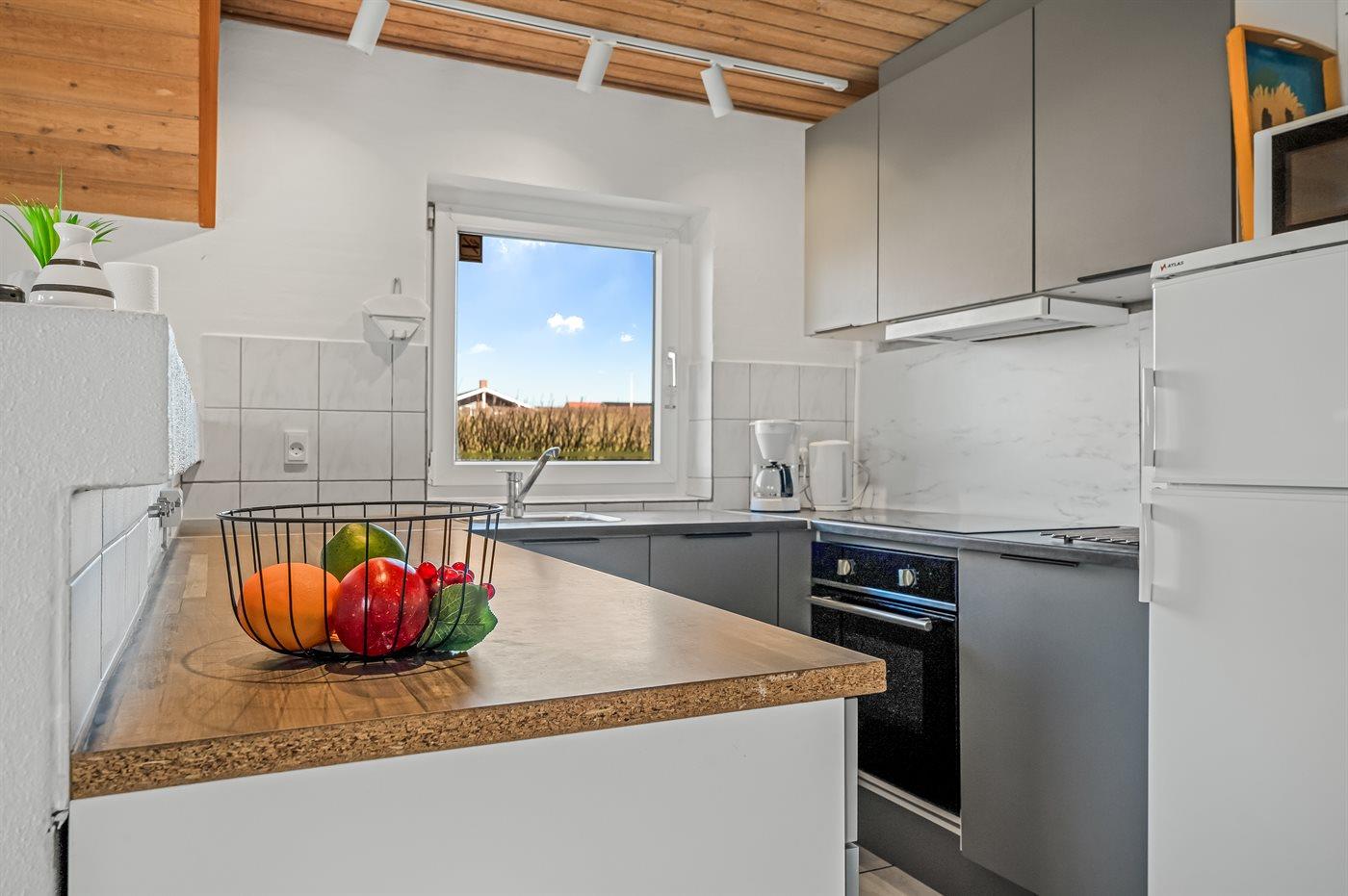 Die Küche ist mit Kühlschrank ausgestattet. Außerdem gibt es 4 elektrische Kochplatten, Backofen, Mikrowelle sowie Geschirrspüler.