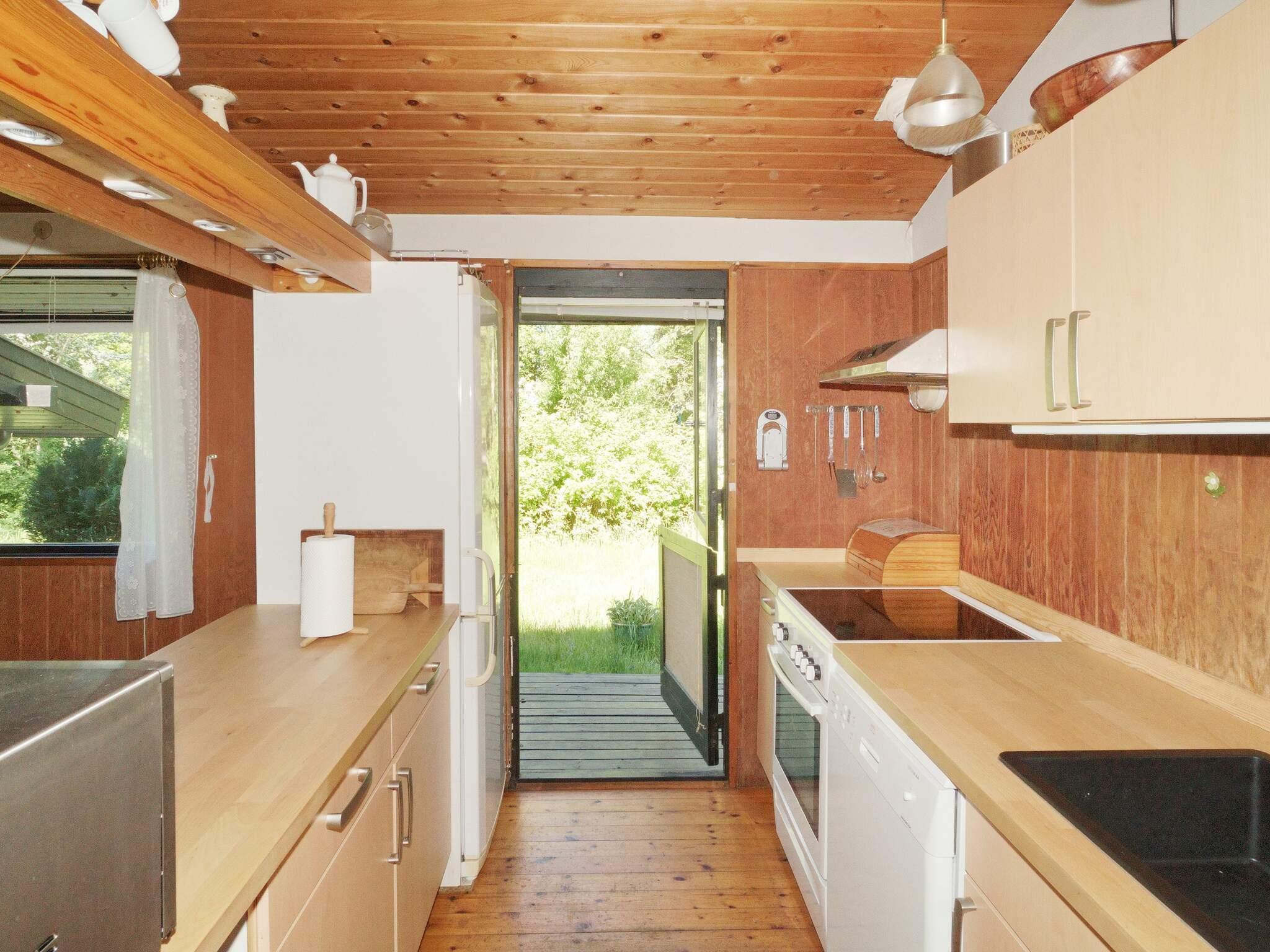 Traditionelles Ferienhaus in einem ruhigen Ferienhausgebiet bei Ellinge Lyng. Im Haus gibt es einen offenen Küchen-/Wohnbereich mit zwei Sofas und Zugang zur 30 m2 großen, überdachten Terrasse. Außerdem im Haus ein Schlafzimmer mit Doppelbett und zwei Zimmer mit jeweils einem 90x200 cm großen Etagenbett. Kein TV im Haus.