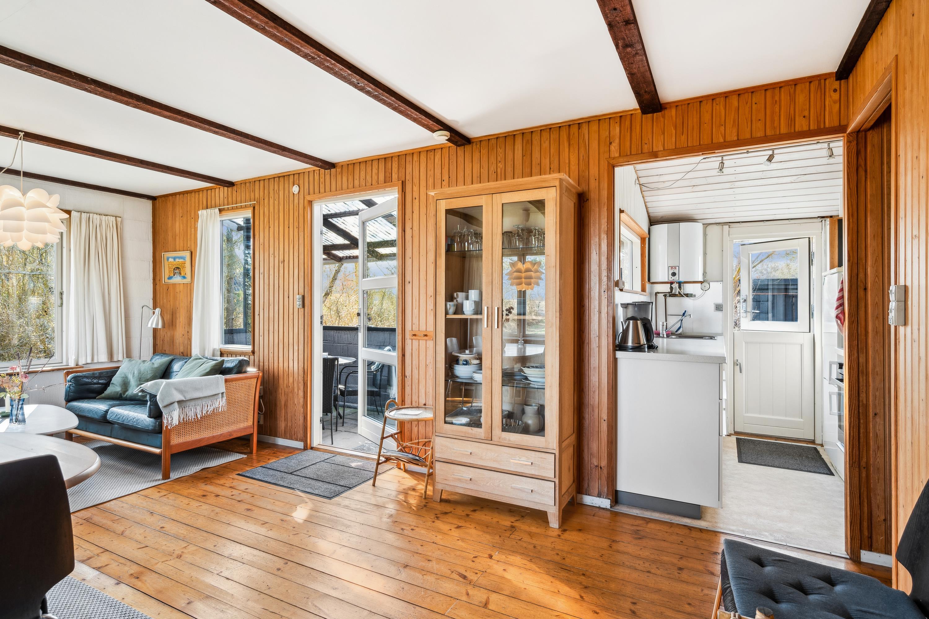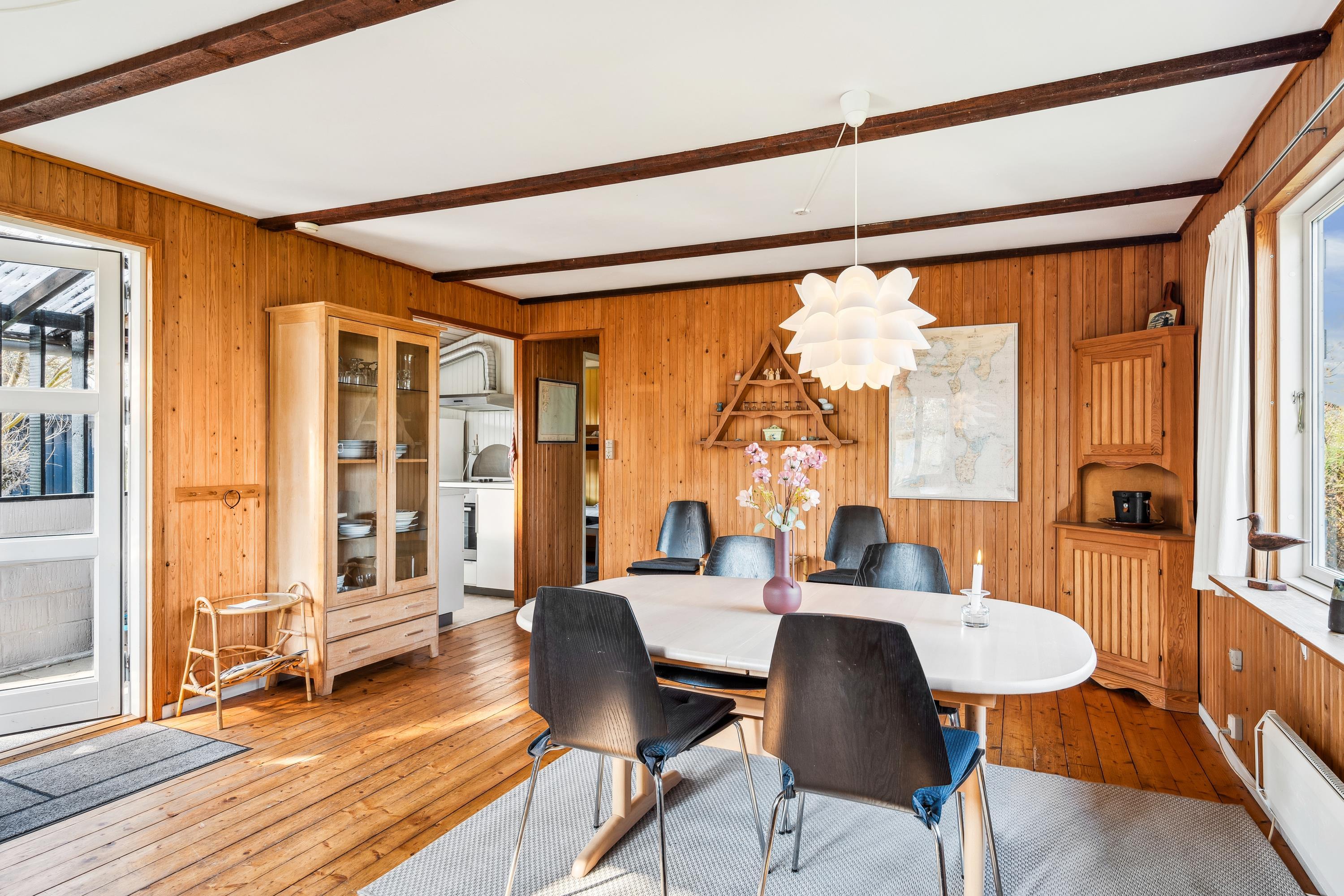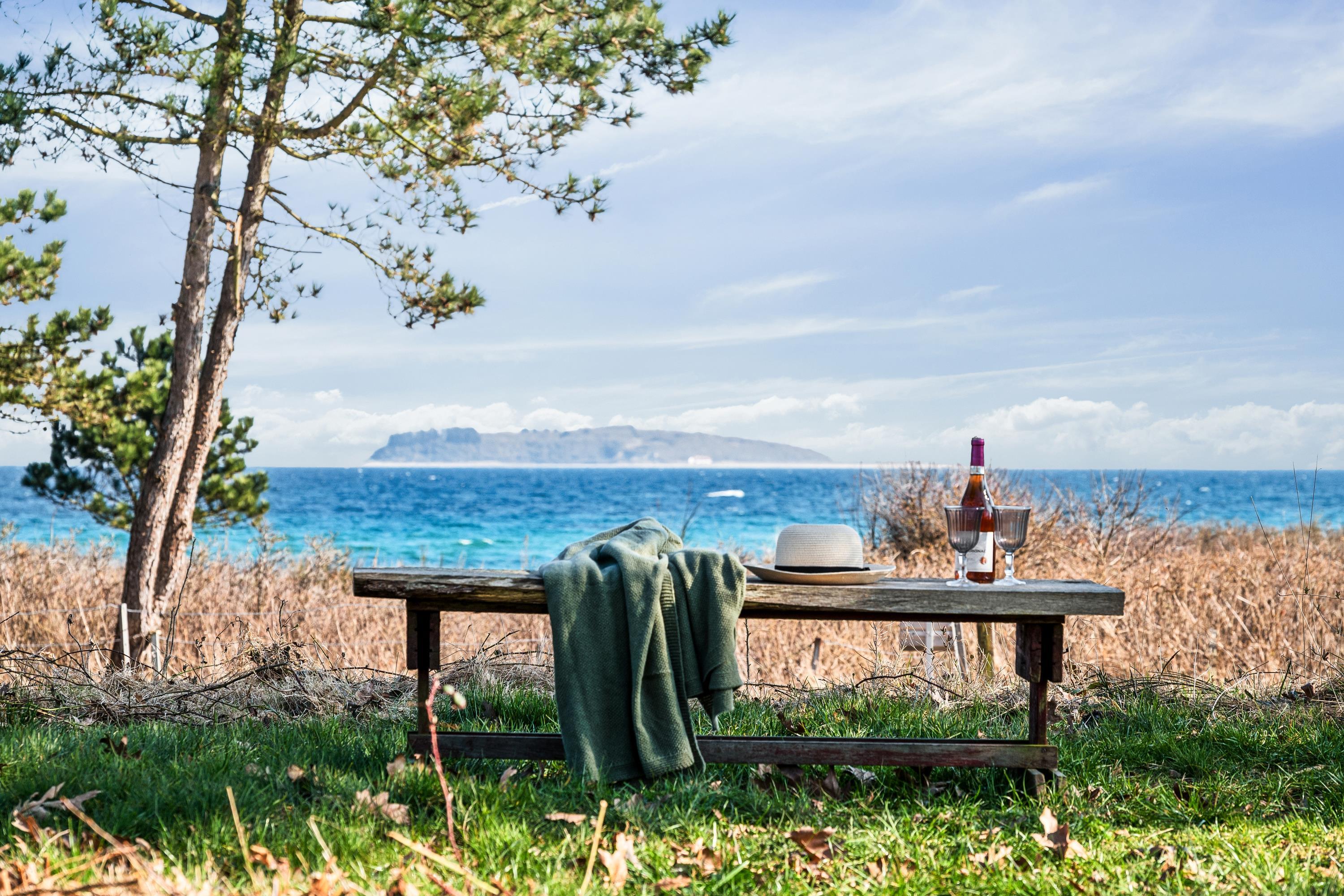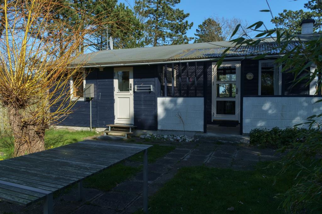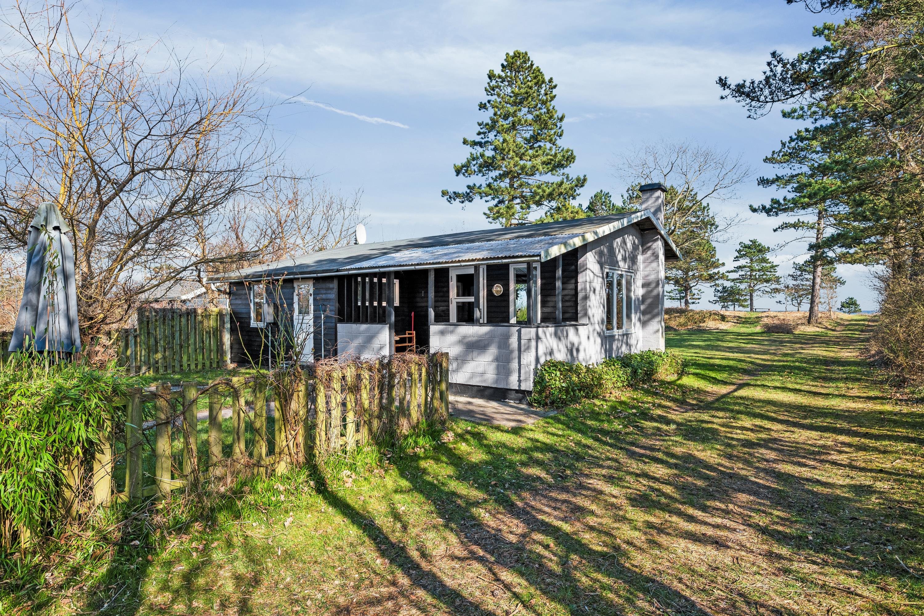 Kleines, älteres und gepflegtes Ferienhaus auf einem großen Naturgrundstück mit fantastischem Blick über das Kattegat und nach Hjelm. Westseitige und teilweise überdachte geflieste Terrasse mit Gartenmöbeln, Sonnenliegen, Sonnenschirm und Außengrill. Es gibt eine Fischreinigungsstelle im Freien, und auf dem Grundstück gibt es auch einen abschließbaren Schuppen.