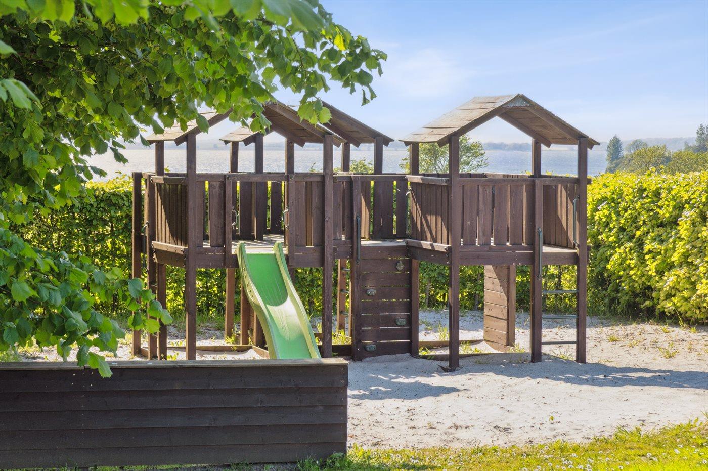 Auf dem Gemeinschaftsgelände gibt es einen großen Spielplatz, und im Sommer gibt es einen gemeinsamen Badesteg am Strand.