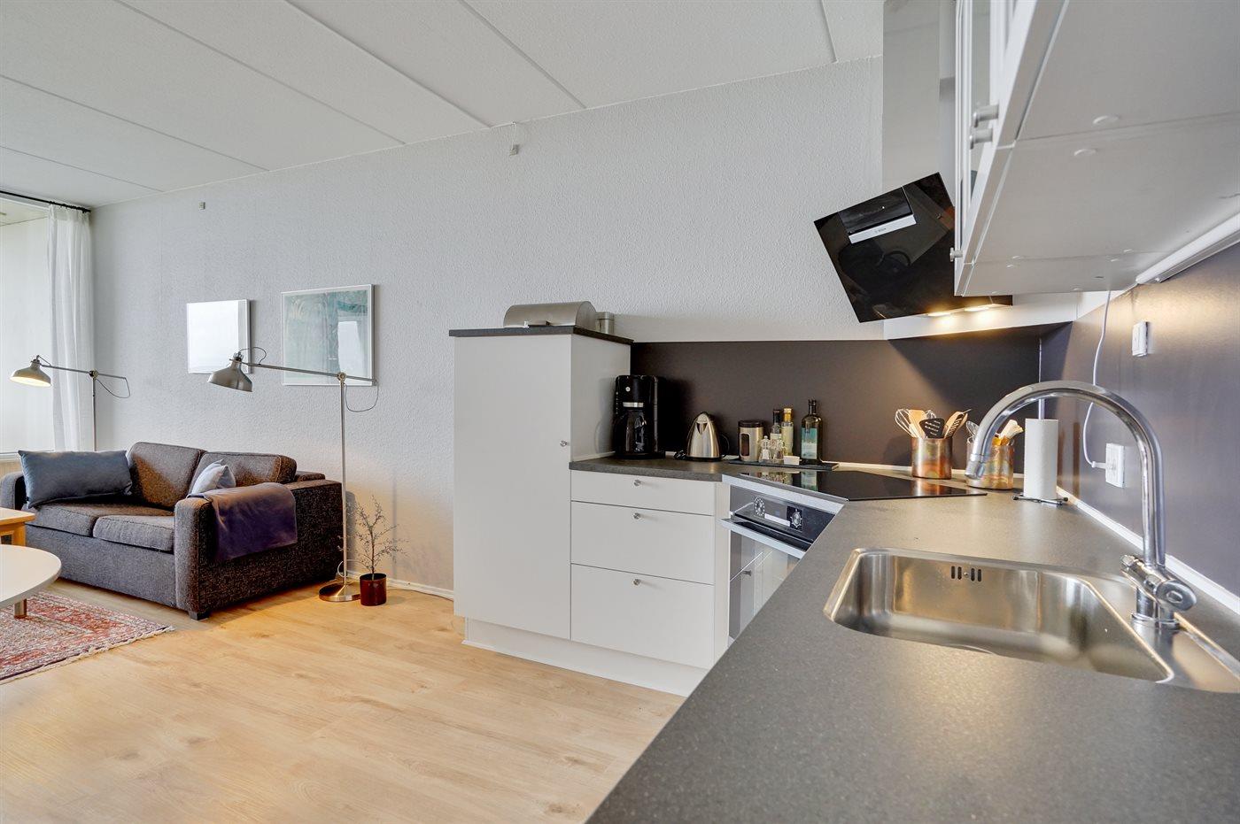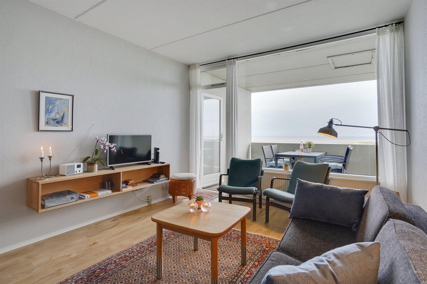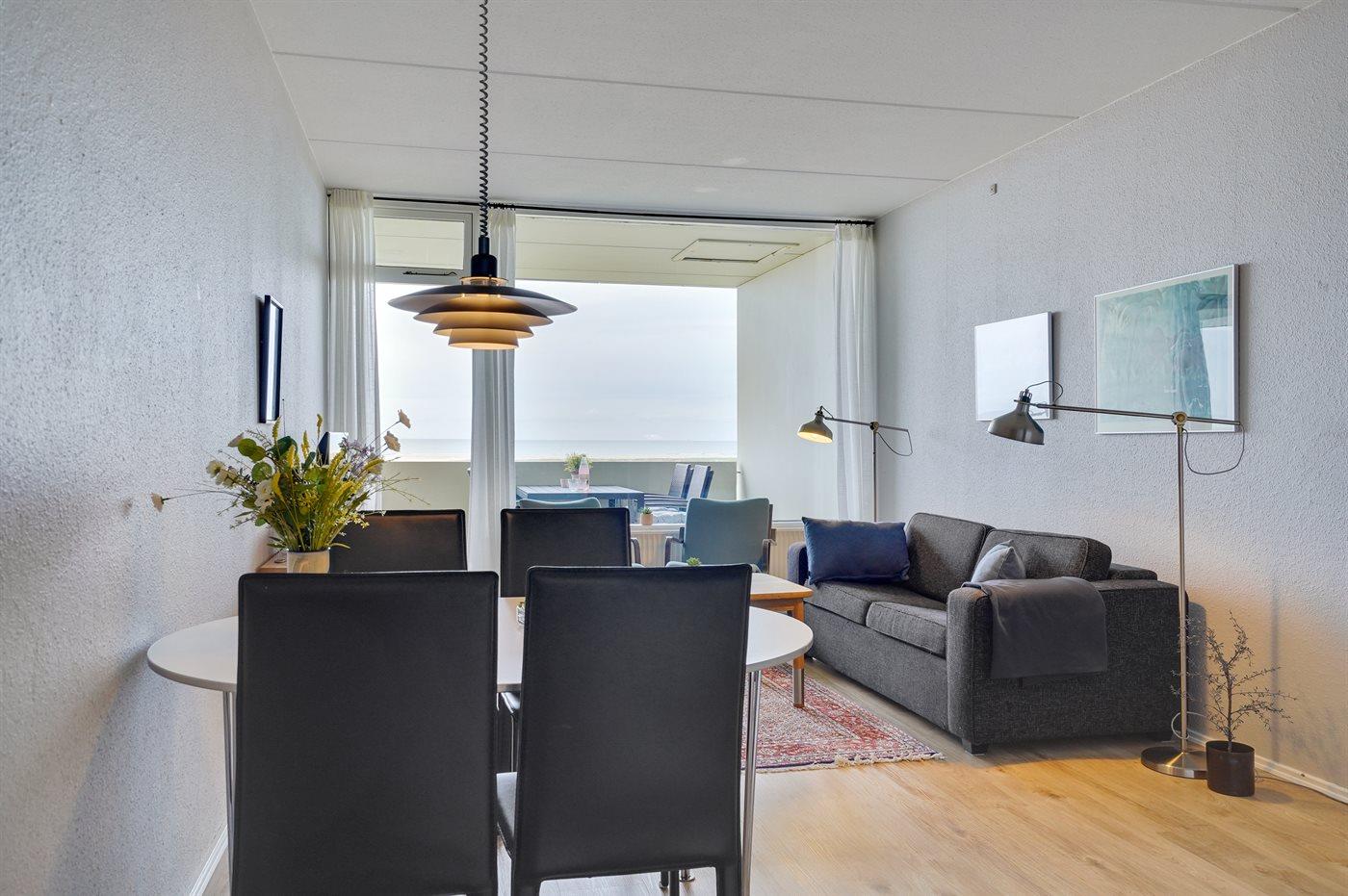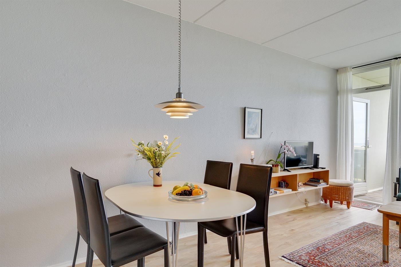 Eine gemütlich eingerichtete Ferienwohnung mit einer phantastischen Aussicht auf den schönen Strand. In der Ferienanlage gibt es gute Aktivitätsmöglichkeiten für die ganze Familie wie z. B. Außenswimmingpool mit Solarheizung, Swimmingpool mit Kinderbecken, Sauna, Waschküche mit Trockner und Bügeleisen, gratis Internet, Hobbyraum mit u. a. Tischtennis, Air-Hockey, Spielzimmer. Schöne Außenanlage mit Grillplätzen, Picknick - Tischen, Bänken, Petanque. Der Außenswimmingpool steht im Zeitraum vom 01.07 bis 31.08 zur Verfügung. Eine schöne Ferienwohnung für die kleine Familie – wo sich die Schlafplätze auf ein Schlafzimmer und 2 Schlafplätze im Wohnzimmer verteilen.