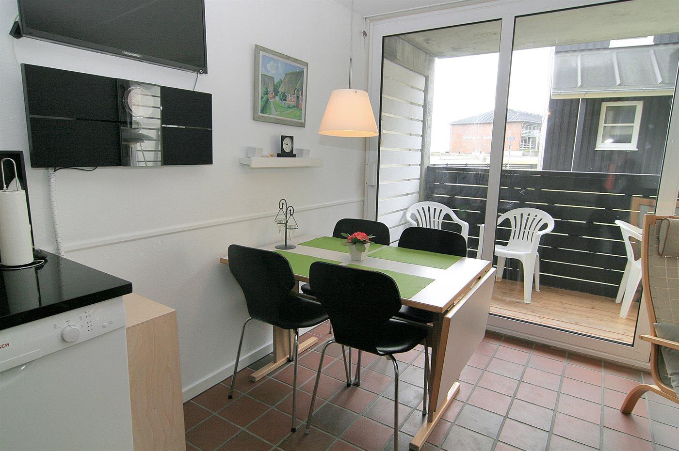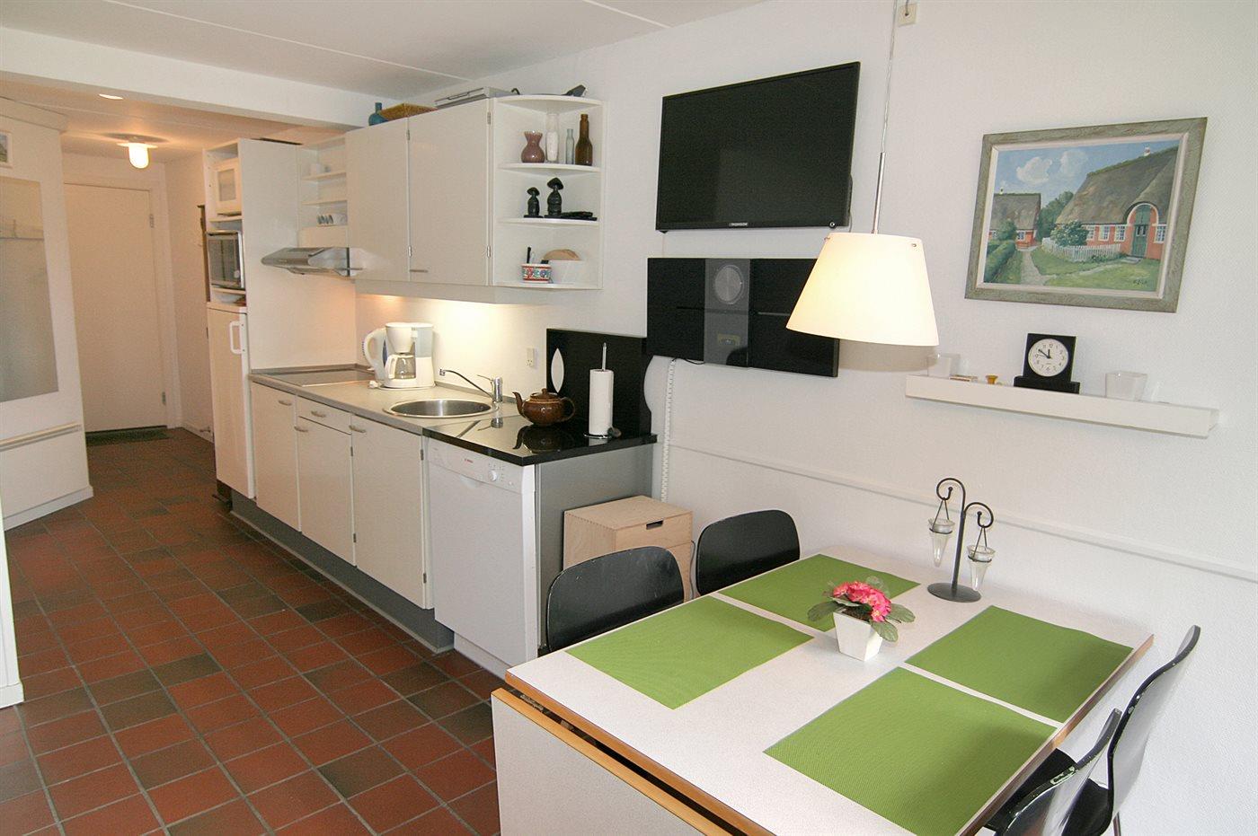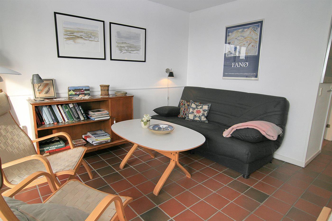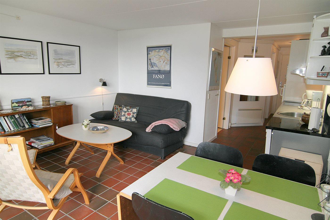 Attraktive Wohnung zentral in Fanø Bad gelegen, nahe am Golf, Tennis und Restaurants. Platz für 4 Personen - ein Schlafzimmer mit Doppelbett und eine Schlafcouch im Wohnzimmer. Terrasse mit Blick auf Fano Bad. Kleinere Wohnung, aber mit großem Geschirrspüler, Mikrowelle.