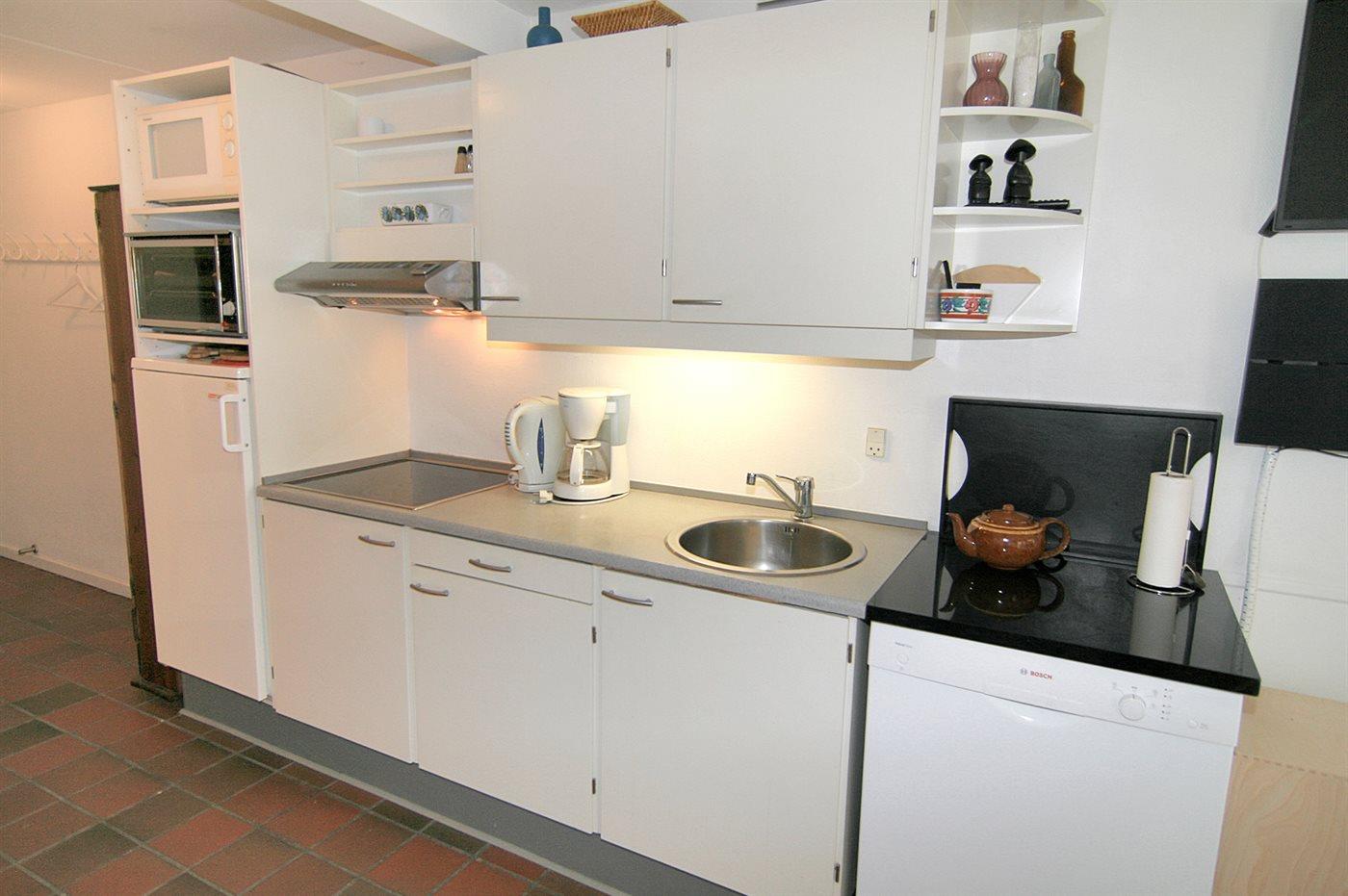 Die Küche ist mit Kühlschrank ausgestattet. Außerdem gibt es 2 Keramik-Kochfelder, Minibackofen, Mikrowelle sowie Geschirrspüler.