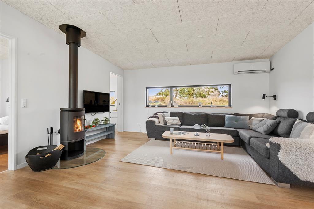 Wir könnten eine lange Liste von Informationen darüber aufzählen, dass es sich um ein Niedrigenergiehaus mit Fußbodenheizung, guten Akustikdecken und stilvollem Interieur handelt . Aber hier bei Fanø sind wir vor allem von der wunderbaren Atmosphäre von Ruhe und Frieden beeindruckt, die über dem Haus liegt. Wenn du also das Bedürfnis verspürst, einmal richtig abzuschalten und die Seele baumeln zu lassen, dann ist dieses Haus die perfekte Wahl. Vielleicht hast du sogar das Glück, einen Fasan oder andere wilde Tiere draußen zu sehen, während du drinnen bei einer Tasse Kaffee entspannst. Es ist einfach ein Glücksgefühl, so eng mit der Natur verbunden zu sein! Besonders im großen Wohnbereich, wo Küche und Wohnzimmer vereint sind, fällt das schöne Licht ein, und für die dunklen Abende gibt es einen Kaminofen. Diese ganze Pracht kannst du übrigens gerne mit vielen teilen, denn es gibt drei Schlafzimmer und ein Badezimmer im Haupthaus, während das dazugehörige Nebengebäude sowohl ein Schlafzimmer als auch ein zusätzliches Bad hat.