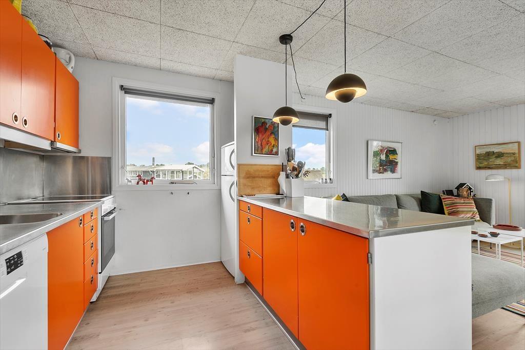 Im Haus stehen dir drei gemütliche Schlafzimmer zur Verfügung, sodass sowohl Familie als auch Freunde eine erholsame Nachtruhe finden. Das einfache Badezimmer mit Dusche ist in hellen Farbtönen gehalten, ebenso wie das Wohnzimmer, das durch das retrosmarte Küchen-Design und andere Interieurdetails farbenfrohe Akzente setzt. Das Wohnzimmer ist darauf ausgelegt, gemütliche Stunden zu verbringen, sei es bei Brettspielen und guten Gesprächen oder beim Entspannen mit einem Buch oder Podcast.