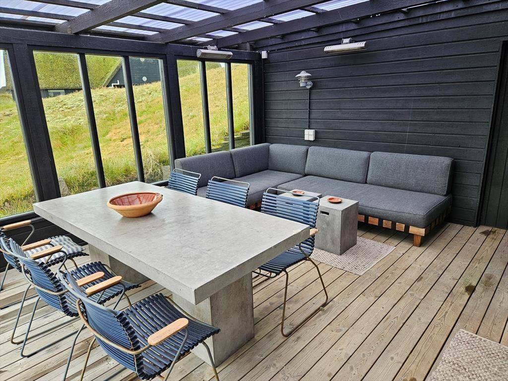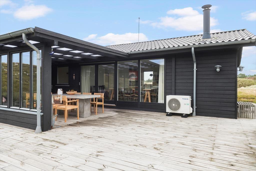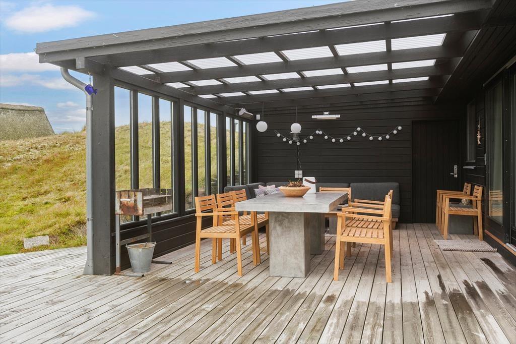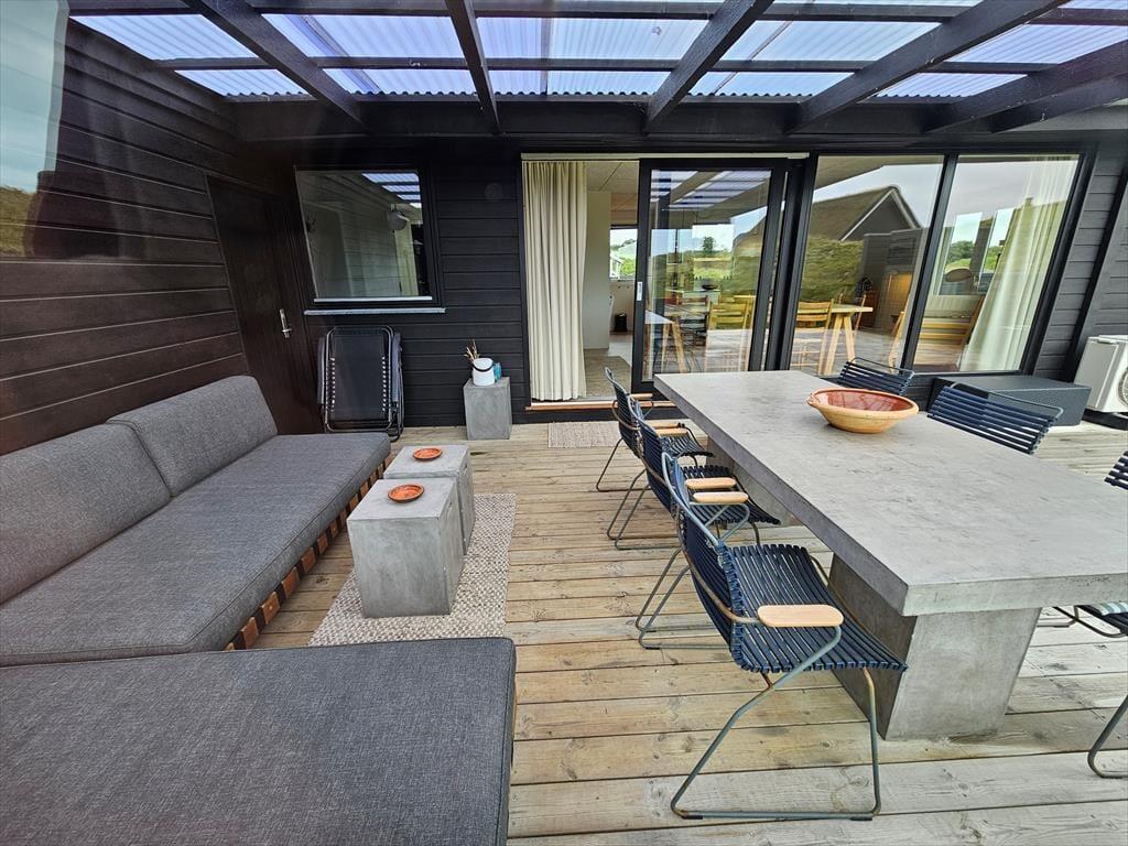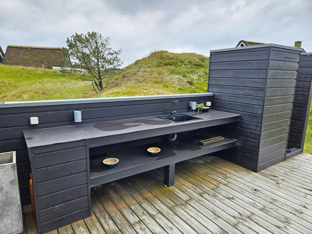 Die moderne Terrassenlandschaft des Ferienhauses erstreckt sich über 120 m² und bietet dir zahlreiche Möglichkeiten, das Sommerleben bei fast jedem Wetter zu genießen. Viele Sonnenplätze und gut geschützte Aufenthaltsbereiche stehen zur Auswahl, und wenn ein kleiner Regenschauer vorbeizieht, ist es herrlich, auf der überdachten Terrasse mit Loungemöbeln und Gartentisch zu sitzen. Der Blick auf die Dünen ist beeindruckend – sowohl nach einer Dusche im Freien als auch beim Kochen mit lokalen Zutaten in der schicken Außenküche.