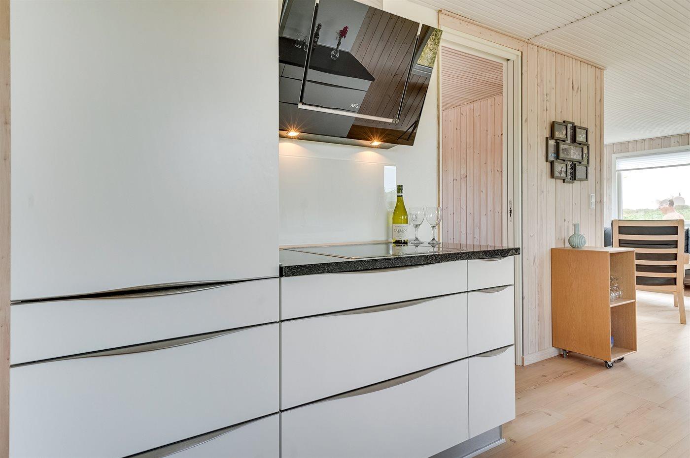 Die Küche ist mit Kühlschrank ausgestattet. Außerdem gibt es 4 Induktions-Kochzonen, Umluftofen, Mikrowelle sowie Geschirrspüler.