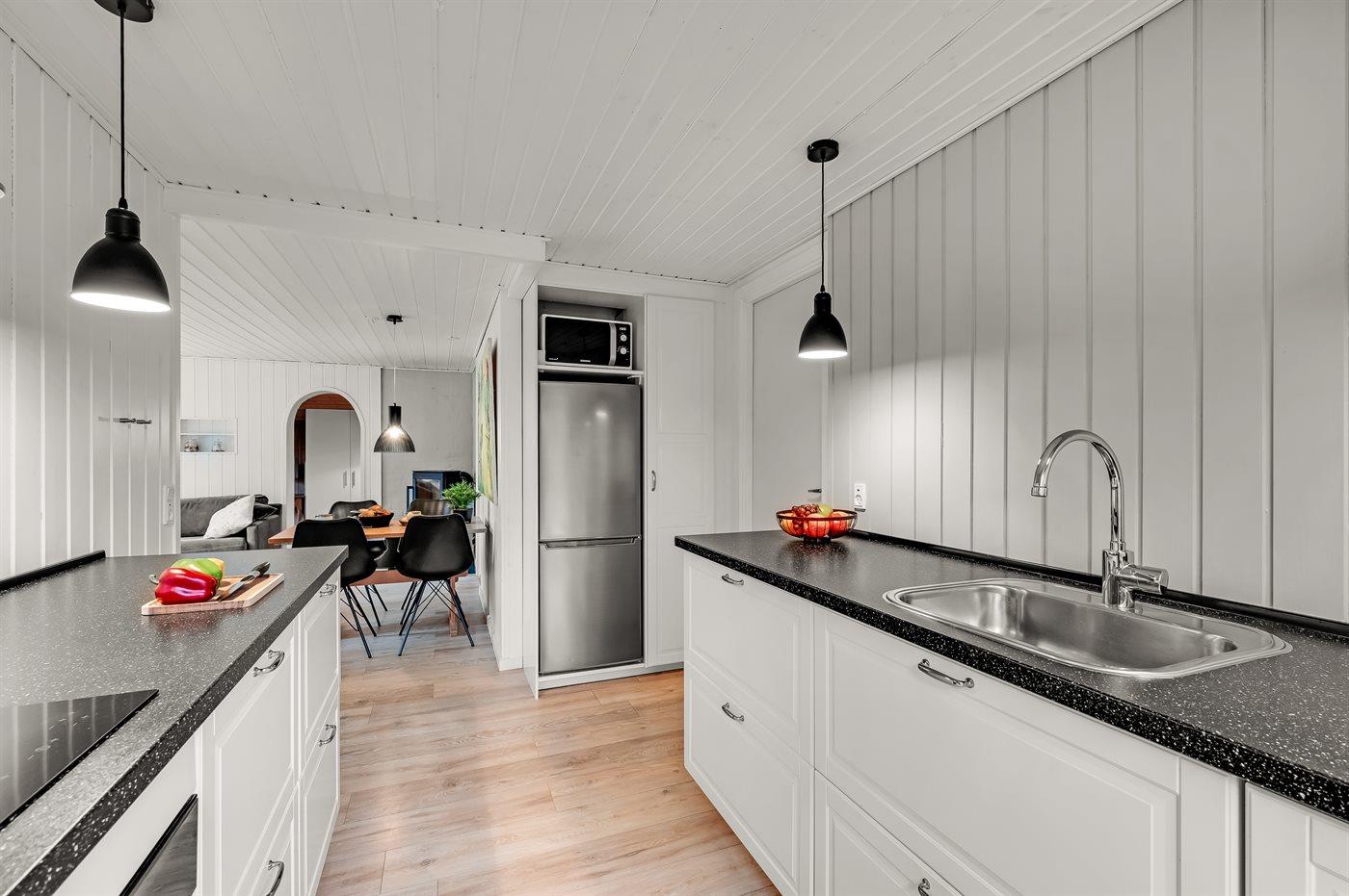 Die Küche ist mit Kühlschrank ausgestattet. Außerdem gibt es 4 Keramik-Kochfelder, Backofen, Mikrowelle sowie Geschirrspüler.
