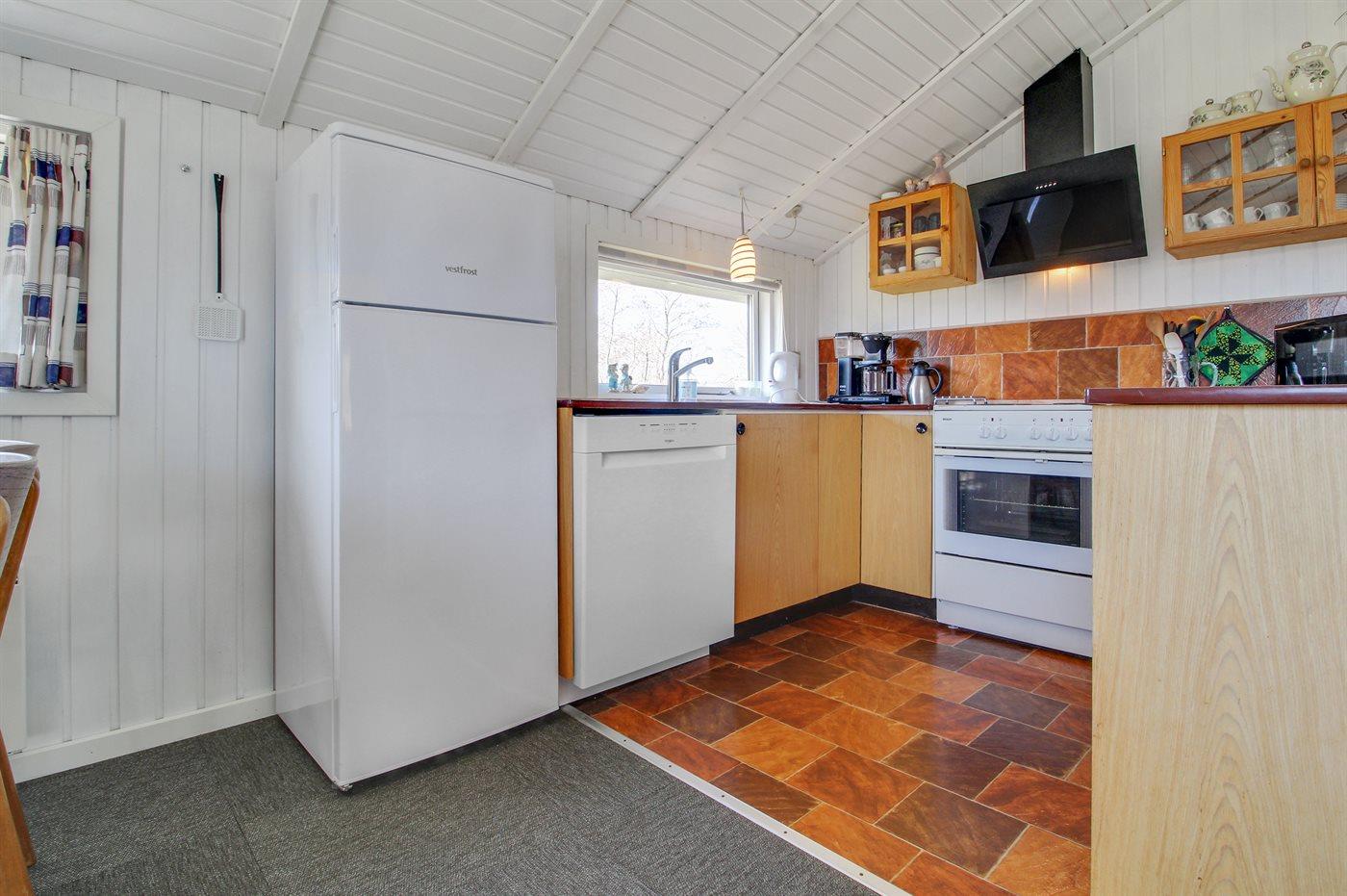 Die Küche ist mit Kühlschrank ausgestattet. Außerdem gibt es 4 elektrische Kochplatten, Backofen sowie Geschirrspüler.