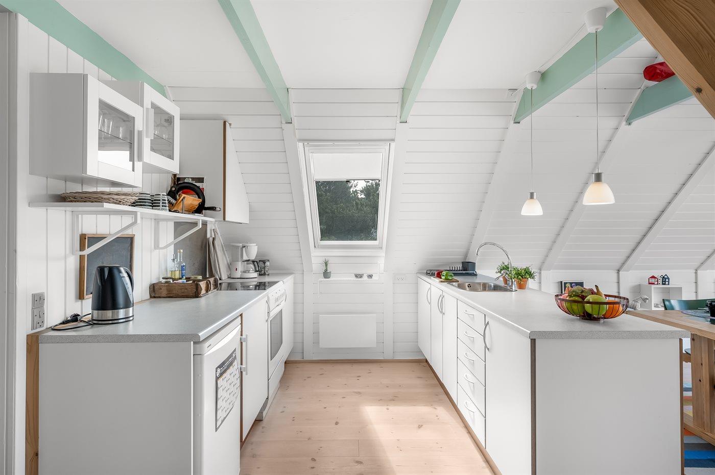 Die Küche ist mit Kühlschrank ausgestattet. Außerdem gibt es 4 Keramik-Kochfelder, Umluftofen, Mikrowelle.