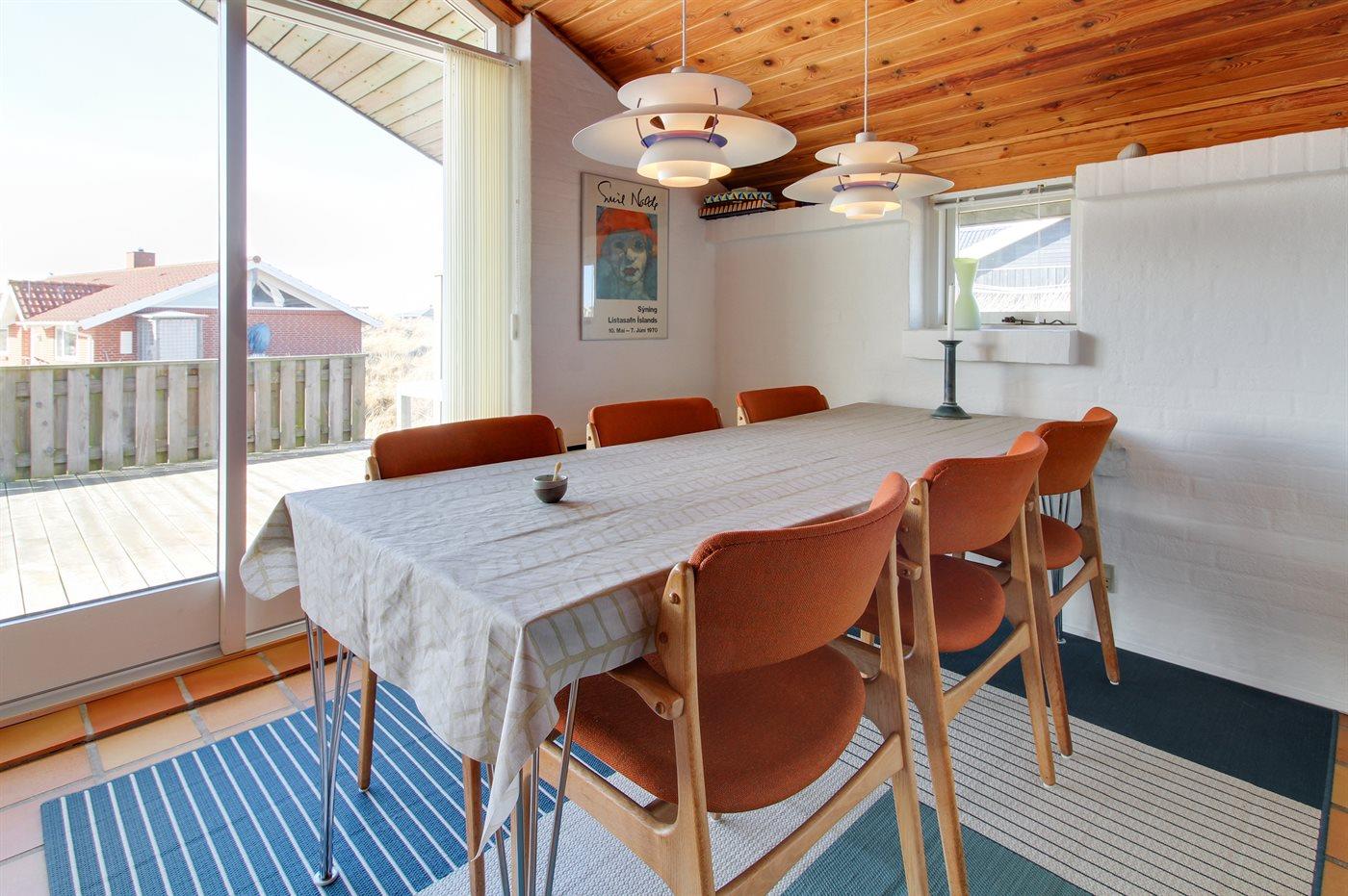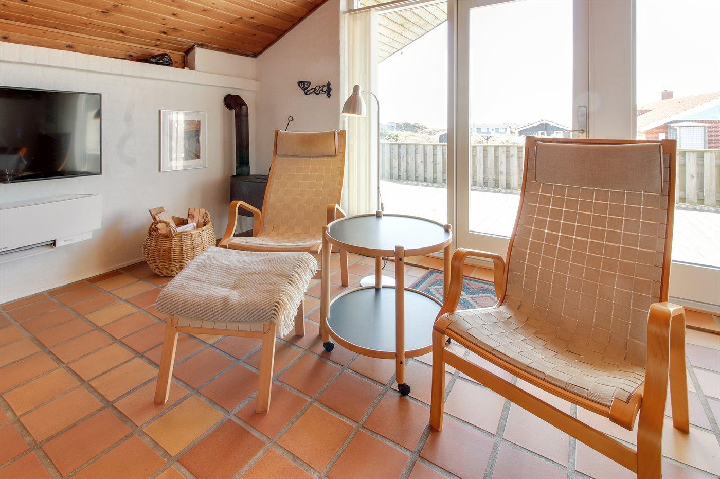 Schönes Ferienhaus mit herrlicher Lage dicht am Strand. Zum Haus gehören 3 Terrassen, in Richtung Osten, Westen und Süden gelegen. Die in Richtung Osten gelegene Terrasse ist zum Teil überdachte. Meeresblick von der Bank auf der Düne.