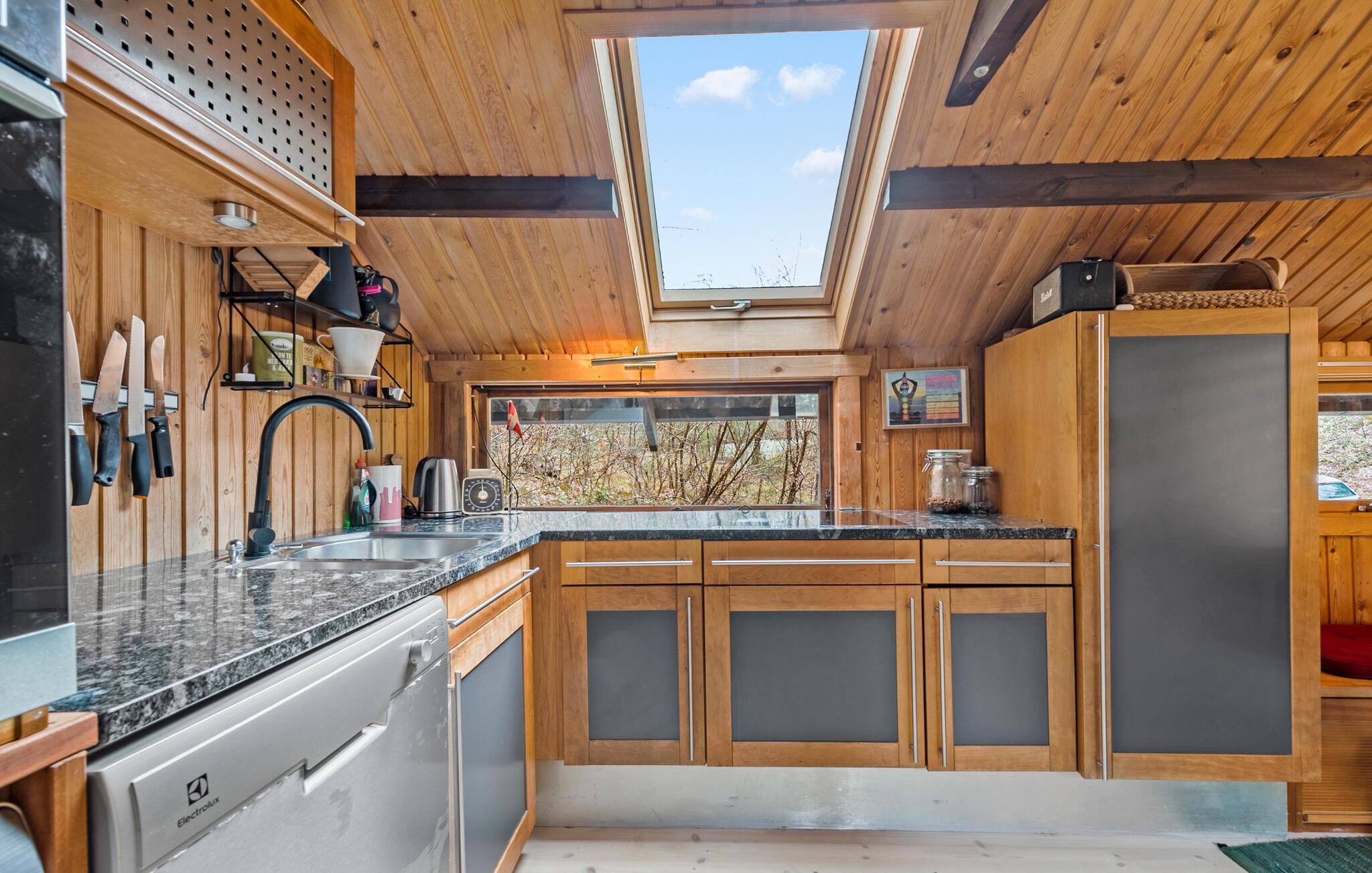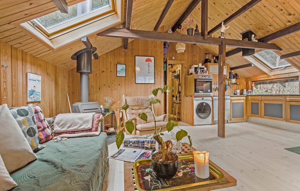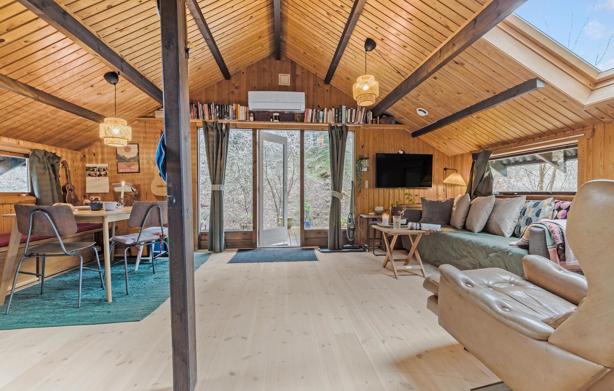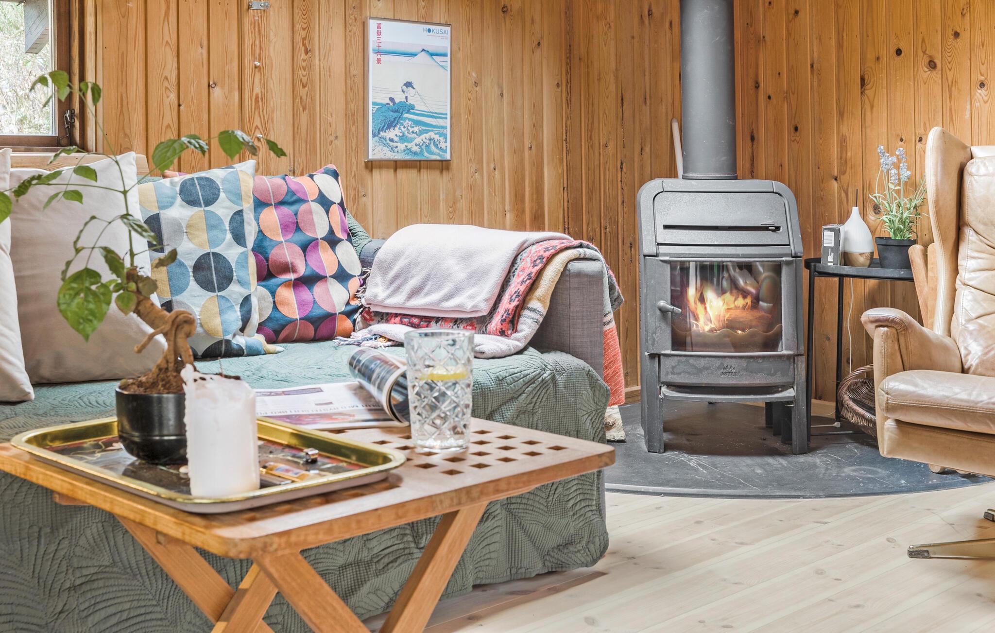 Gönnen Sie sich eine Auszeit vom hektischen Alltag und finden in diesem Ferienhaus Ruhe und Frieden, umgeben von Natur. Das praktische Holzhaus vermittelt Behaglichkeit. Feuern Sie den Holzofen an und machen es sich auf den Sofas gemütlich, spielen Sie Gitarre oder genießen die gemeinsame Zeit beim Kochen in der Küche oder Spielen am Esstisch.