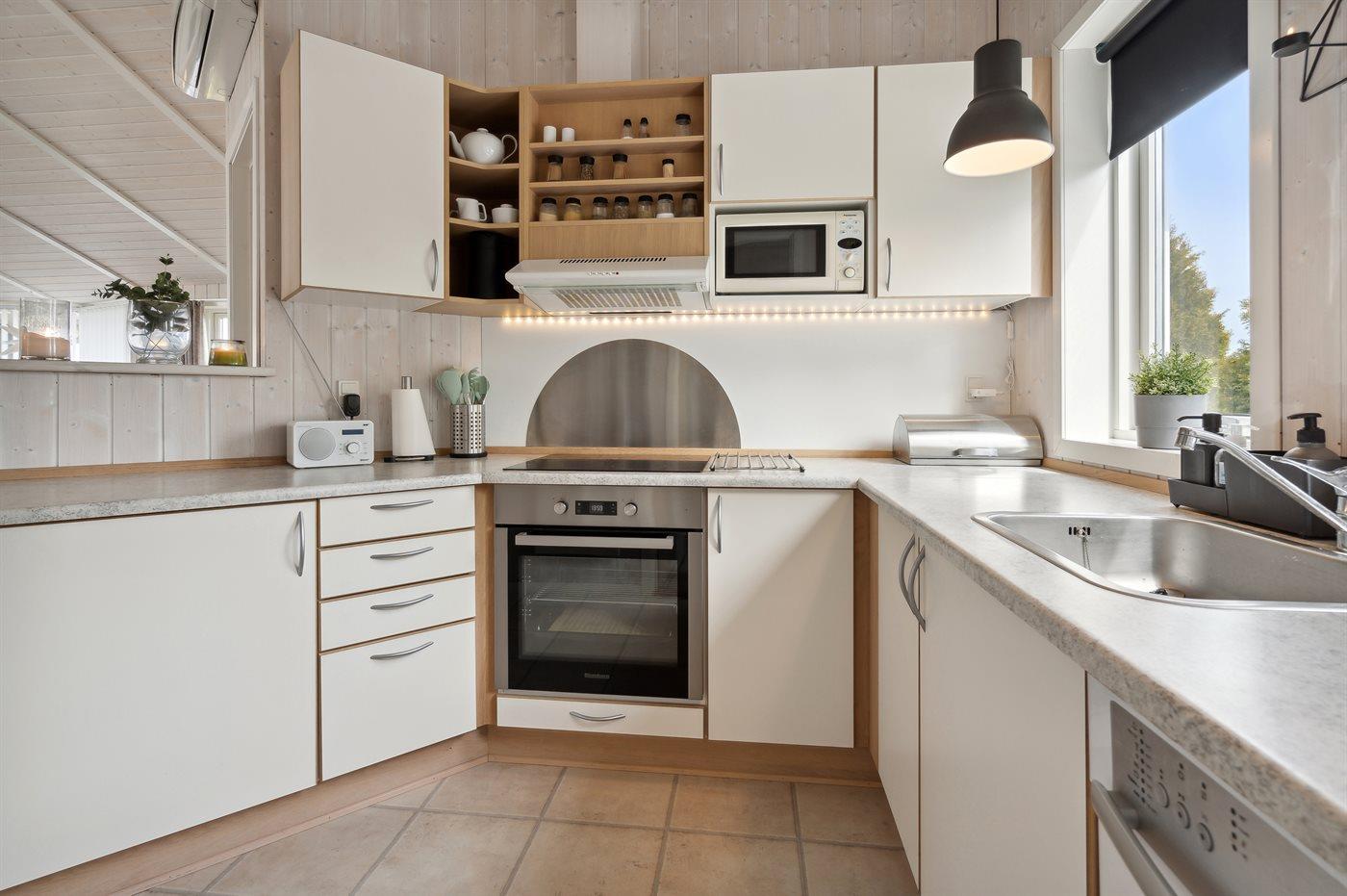Die Küche ist mit Kühlschrank ausgestattet. Außerdem gibt es 4 Keramik-Kochfelder, Umluftofen, Mikrowelle sowie Geschirrspüler.