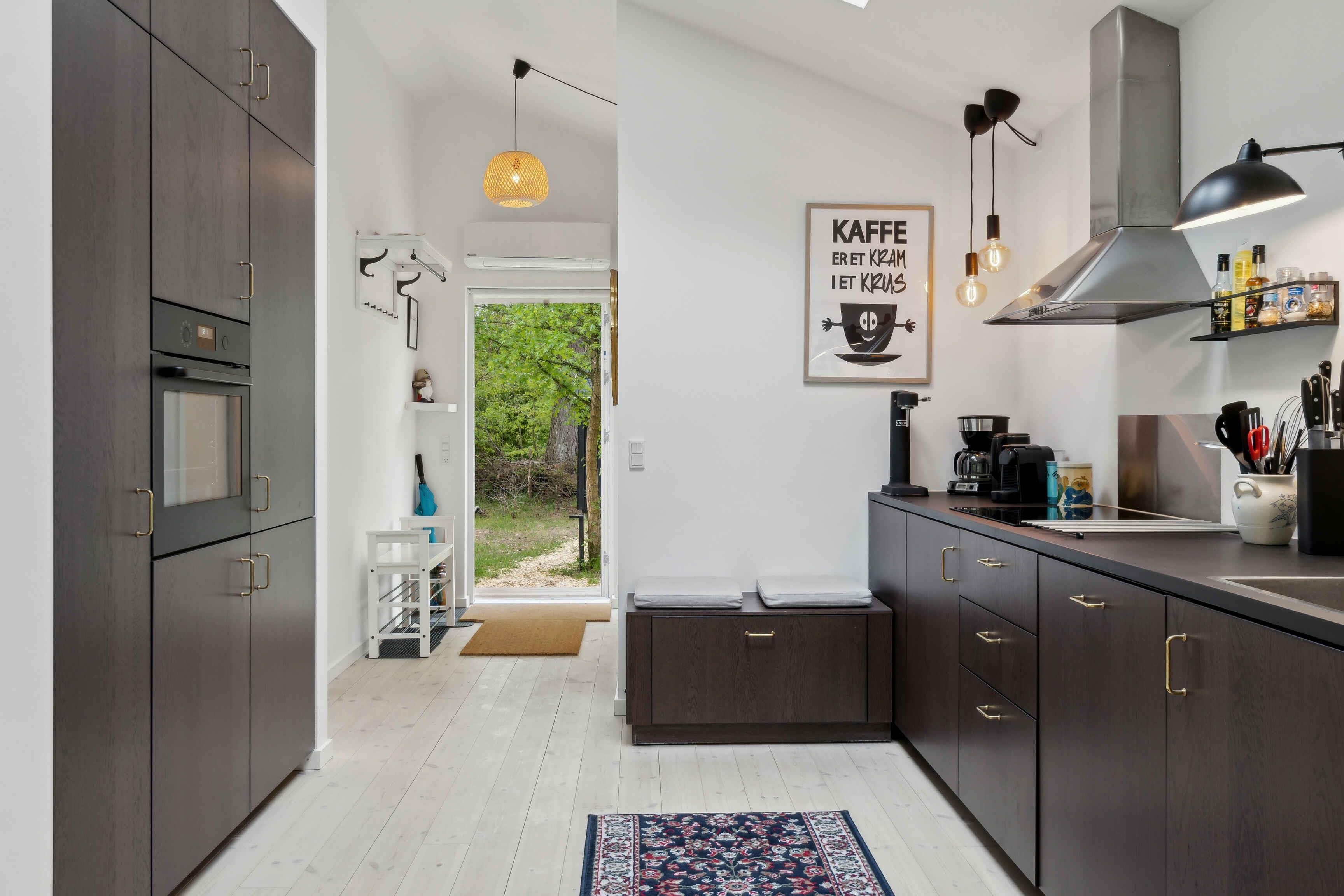 Willkommen in unserem charmanten Ferienhaus, das in einer malerischen Umgebung in der Nähe der Asserbo-Plantage und des Arresø liegt. Hier haben Sie die einzigartige Gelegenheit, die Natur hautnah zu erleben, mit der Ruhe des Waldes und der Schönheit des Sees direkt vor der Tür. Das Ferienhaus, das 2022 gebaut wurde, befindet sich auf einem wunderschönen Naturgrundstück, umgeben von Grün und mit viel Platz zum Entspannen und Genießen der Umgebung. Das Grundstück bietet einen Lagerfeuerplatz, an dem Sie sich abends versammeln und Marshmallows rösten können, eine Hängematte zum Entspannen im Schatten der Bäume und einen Grill, der zu Outdoor-Kochen und gemütlichen Abendessen im Freien einlädt. Hier können Sie wirklich dem Stress und der Hektik des Alltags entkommen und Ruhe in der Natur finden. In der Nähe befindet sich Arresø, wo Sie den Sonnenaufgang und die Vogelwelt genießen können. Das Herz des Hauses ist der große, helle Küchen- und Essbereich, in dem viel Platz für gemeinsames Beisammensein und Geselligkeit ist. Er ist mit einem Essbereich, einem Sofa und einem Kaminofen ausgestattet. Die Küche ist mit allem ausgestattet, was Sie benötigen, um köstliche Mahlzeiten zuzubereiten. Hier finden Sie ein Induktionskochfeld, einen Kühl-/Gefrierschrank, eine Kaffeestation und eine Spülmaschine, die sowohl das Kochen als auch das Aufräumen einfach und bequem machen. Das Haus verfügt außerdem über zwei Schlafzimmer. Eines mit einem Doppelbett und viel Stauraum, das andere mit einem ausziehbaren Bett mit bequemen Matratzen, das entweder so genutzt oder in ein weiteres Doppelbett umgewandelt werden kann. Wenn Sie Übernachtungsgäste haben, gibt es zwei zusätzliche Schlafplätze auf dem Sofa im Wohnzimmer. Das Haus ist mit Decken, Kissen und viel Geschirr für sechs Personen ausgestattet. Das Haus zeichnet sich durch große Fenster, Dachfenster und einen eigenen Ausgang zum Garten in jedem Raum aus. Zusätzlich gibt es einen hellen Flur mit viel Platz für Oberbekleidung und Schuhe sowie ein gemütliches Badezimmer mit einer Duschkabine, einer Waschmaschine und Fußbodenheizung. Das gesamte Haus wird mit einer Luft-Wärmepumpe beheizt und ist gut isoliert. Der Morgenkaffee kann in der Sonne auf der Ostseite des Hauses genossen werden, und das Mittagessen/Nachmittag kann auf der nach Süden ausgerichteten Terrasse eingenommen werden. Die Abende können vor dem Kaminofen oder auf der offenen Terrasse verbracht werden, wo Sie die Abendsonne mit einem Glas Wein in der Hand und Essen auf dem Grill genießen können. Es gibt schnelles WLAN sowie ein Fernseher mit Chromecast, sodass Sie Ihre Lieblingsserien verfolgen können. Die Region bietet eine Vielzahl von Aktivitäten für Naturfreunde und Abenteurer. Unternehmen Sie entspannende Spaziergänge im schönen Wald, erkunden Sie aufregende Mountainbike-Strecken, Wanderwege oder genießen Sie einen Tag am Strand, zum Beispiel in Liseleje. Tisvilde Leje ist eine angenehme Wanderung oder Radtour durch den Wald entfernt. Hier ist für jeden etwas dabei! Die Region bietet auch viele kulturelle Erlebnisse in der Nähe. In der Umgebung gibt es lokale Bauernmärkte mit frischen Produkten wie Eiern und saisonalen Gemüse sowie Cafés, Eisdielen, attraktive Bauernhöfe und Flohmärkte. Außerdem gibt es zahlreiche kulturelle Erlebnisse wie Museen, Hügelgräber und Bauernhöfe, auf denen Sie eine Kuh streicheln können. Achtung: Wird nicht für gewerbliche Nutzung vermietet.