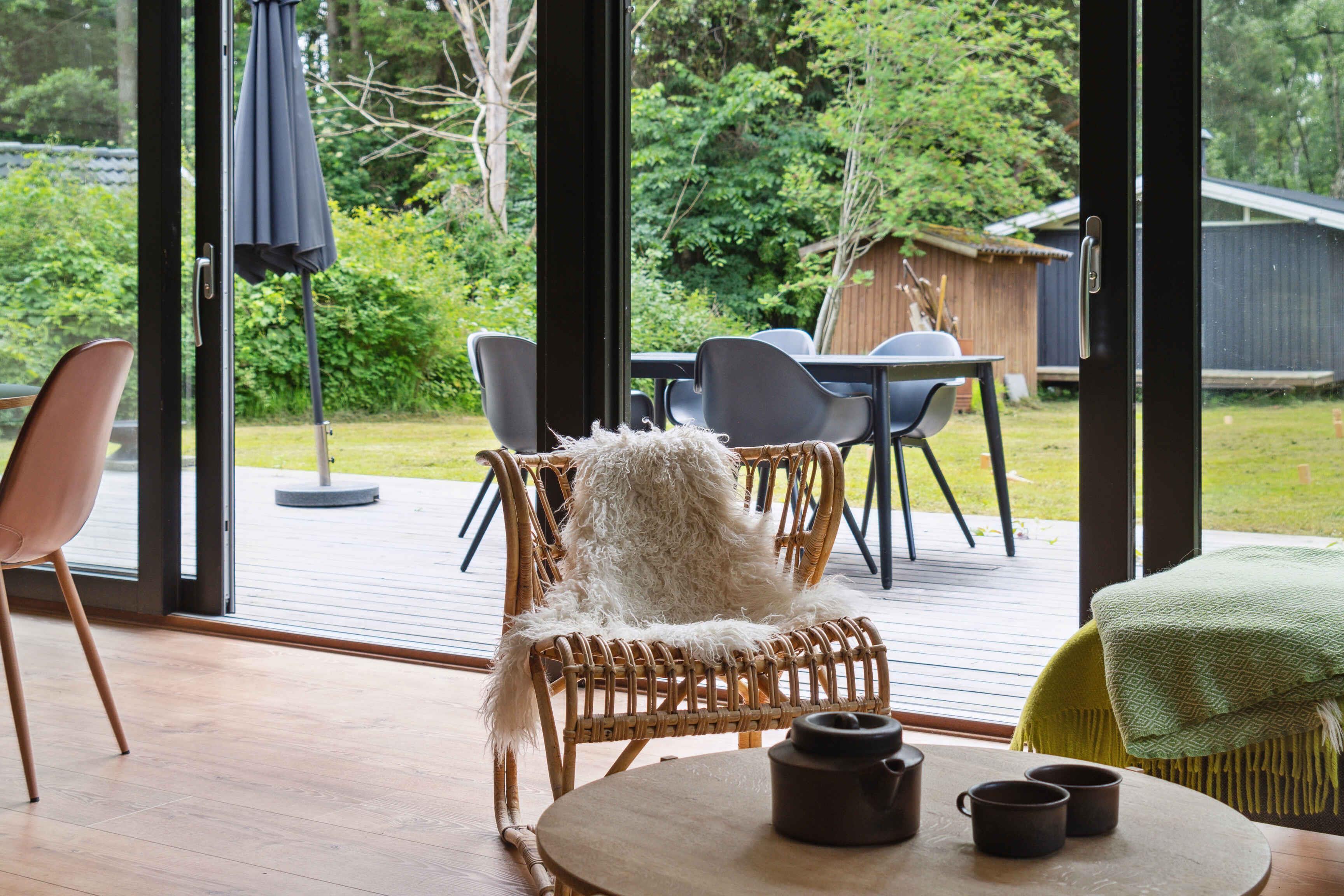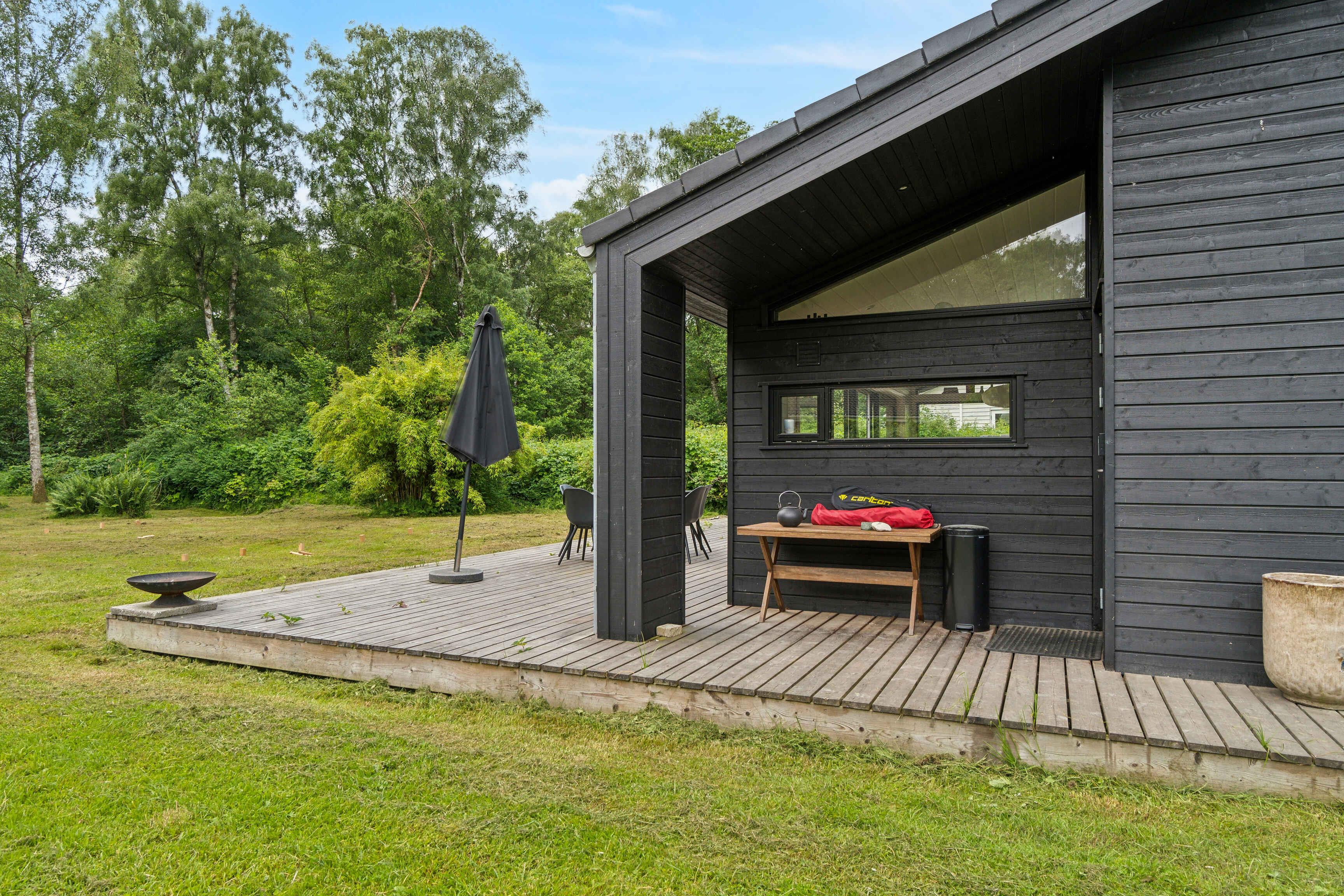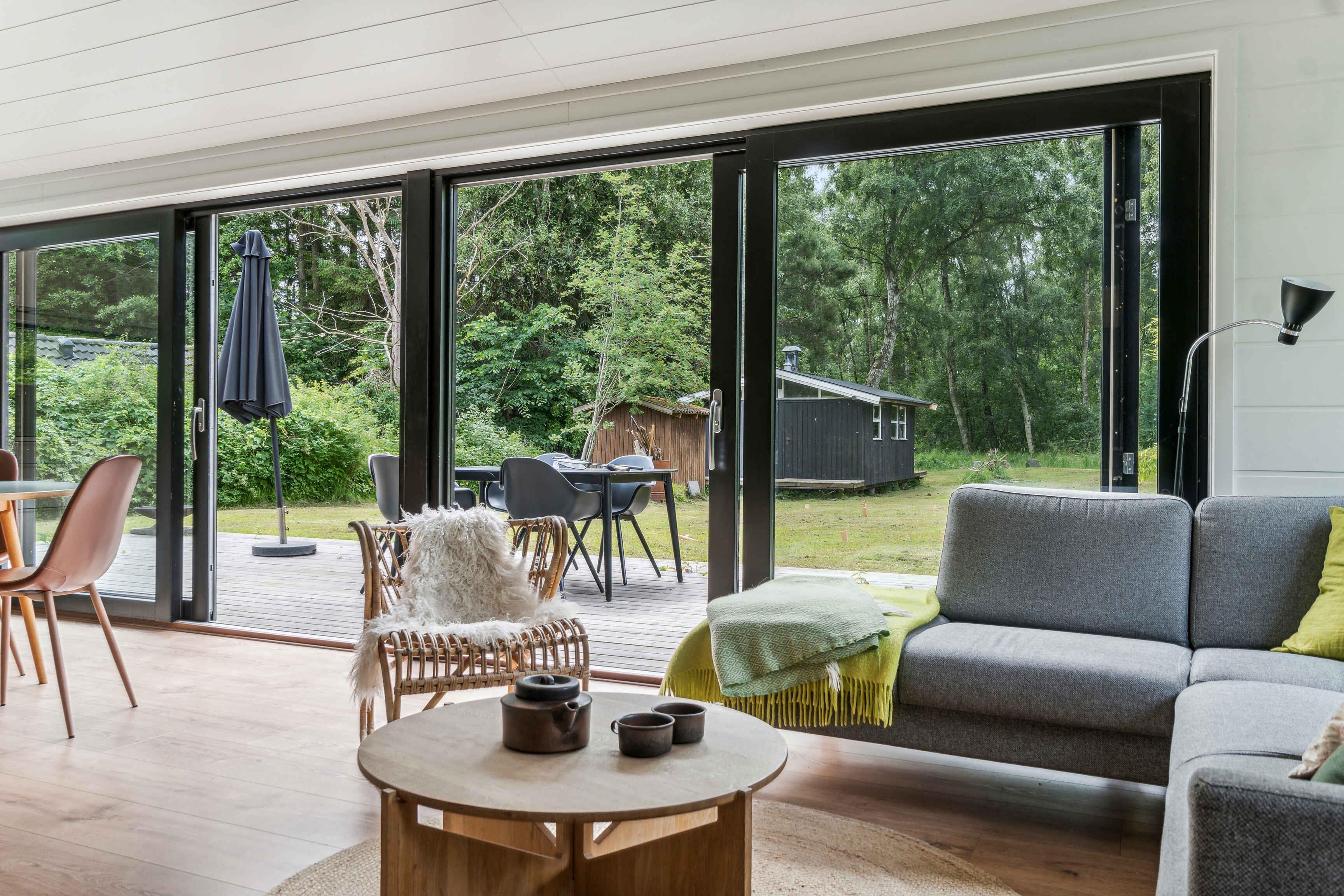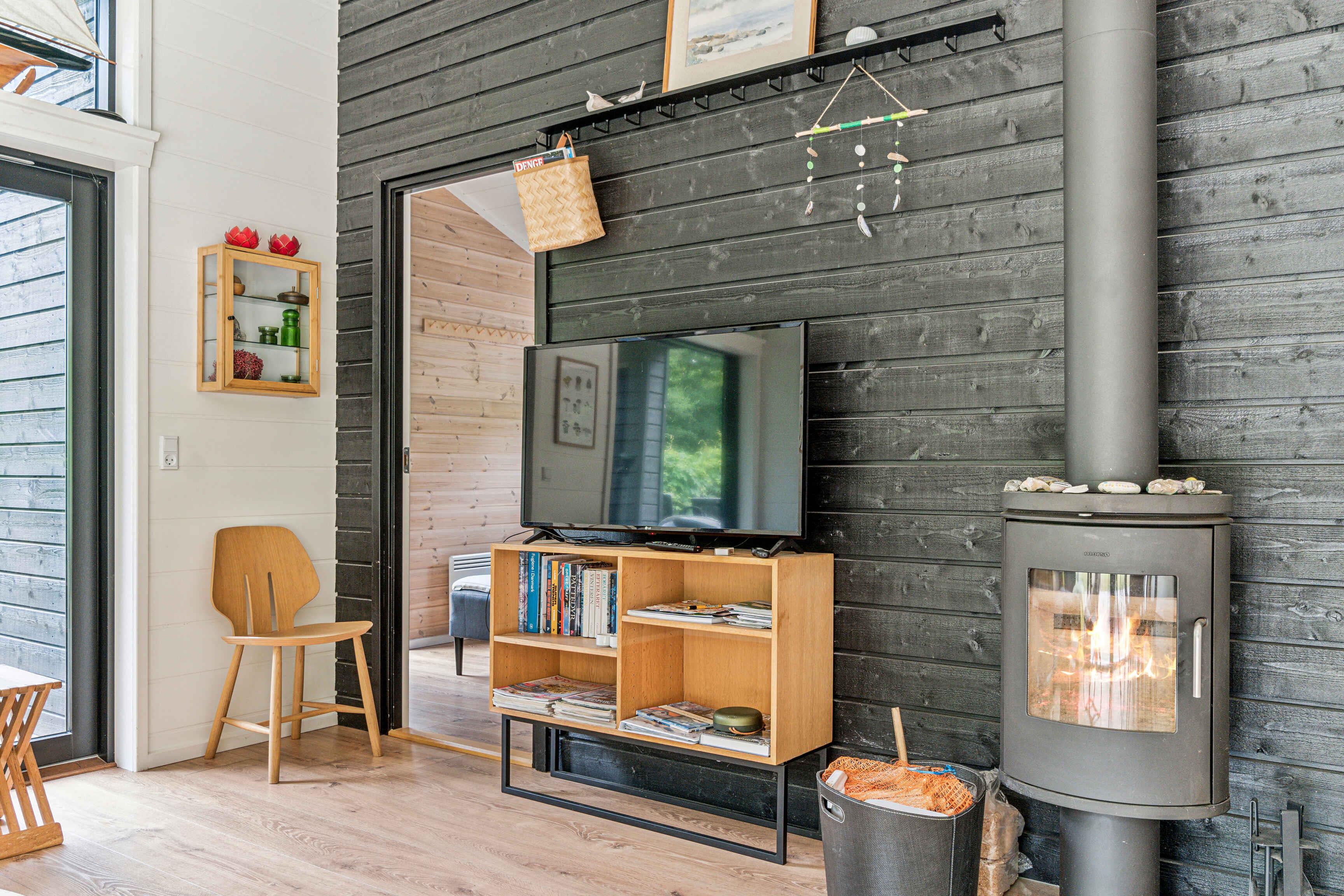 Modernes Ferienhaus in Asserbo mit Kamin, Terrasse und Garten, ideal für entspannte Urlaubstage inmitten der Natur.