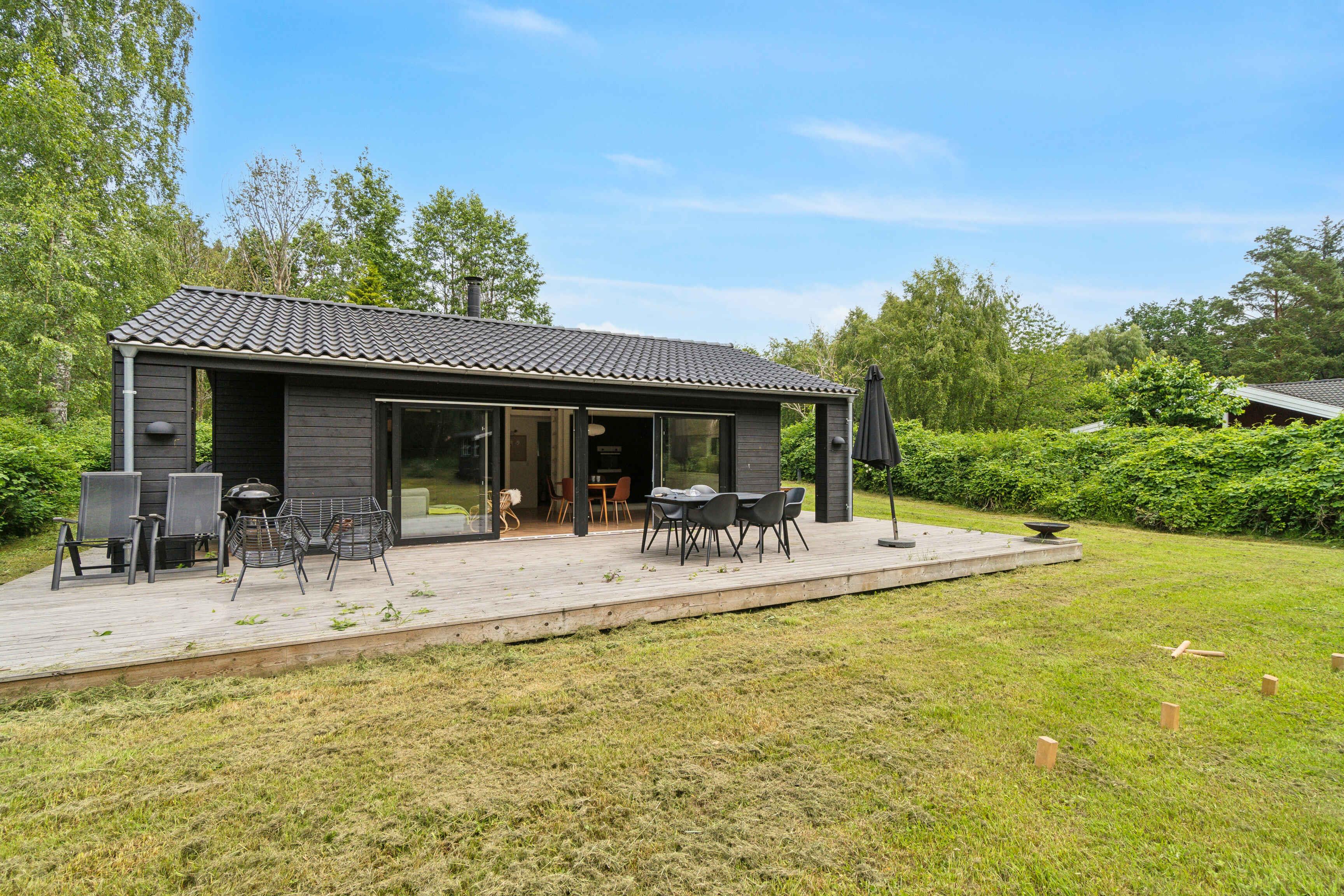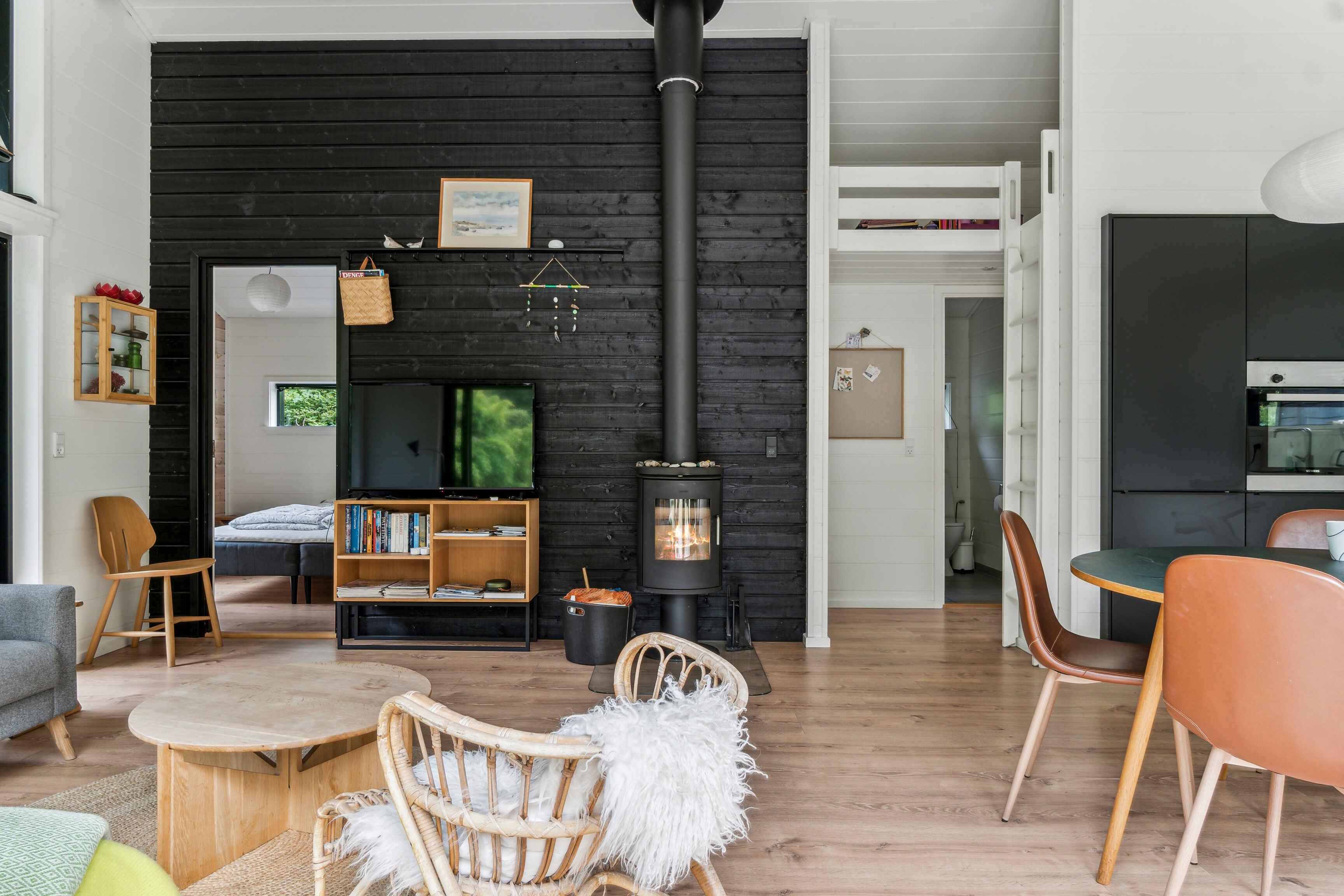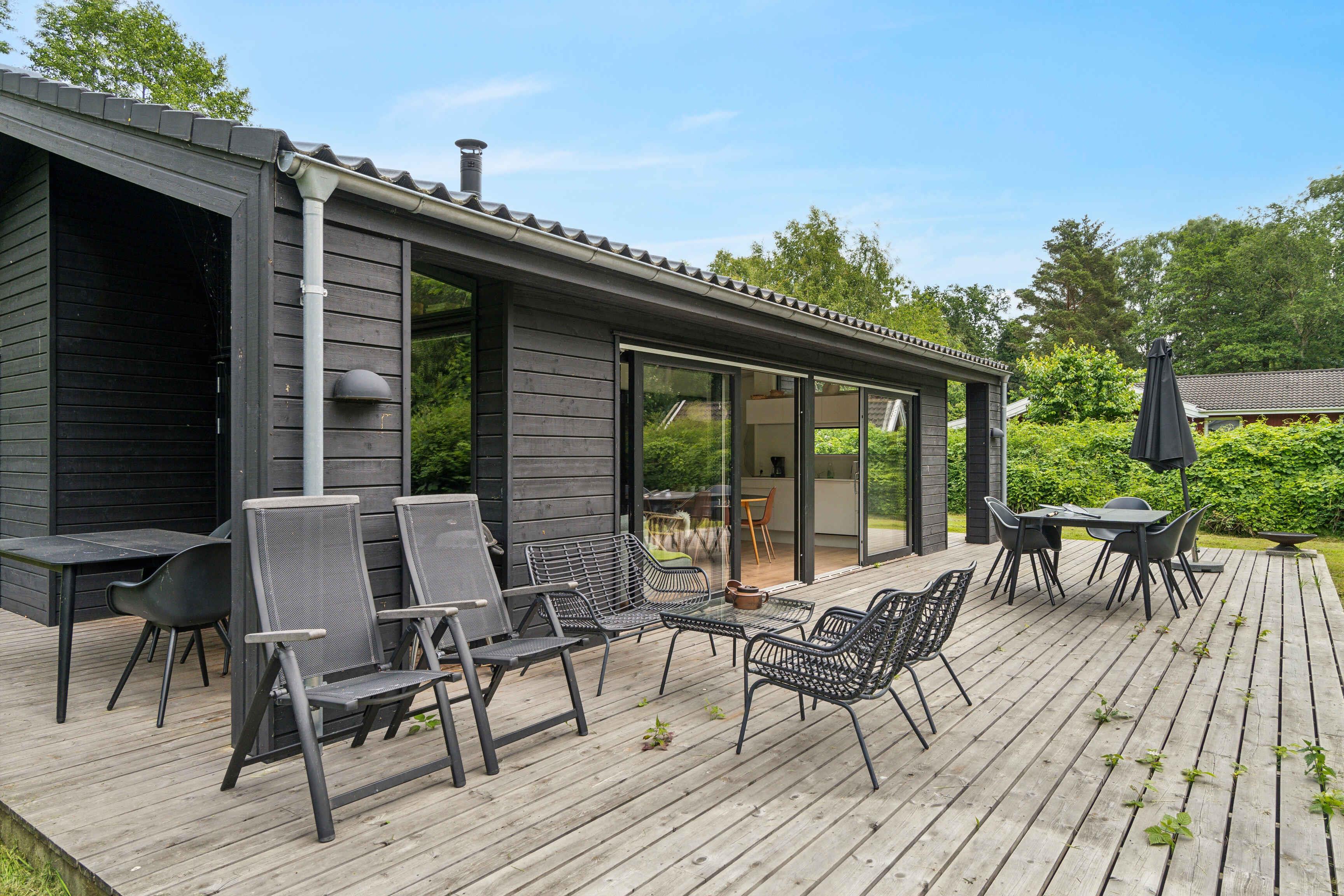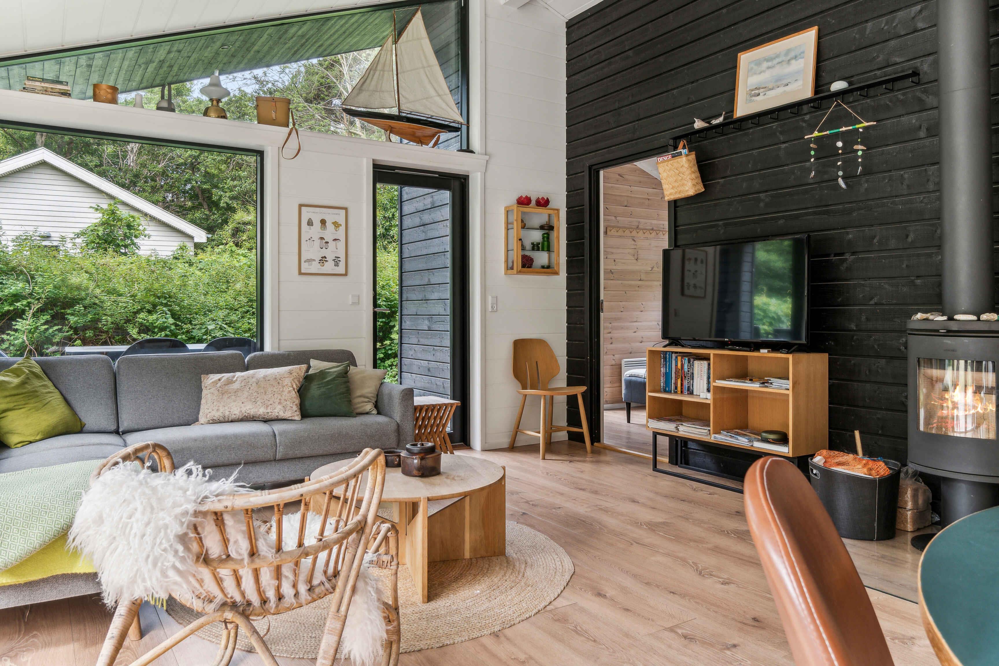 Im malerischen Ferienhausgebiet in Asserbo, umgeben von üppigen Wäldern und ruhiger Natur, finden Sie dieses moderne und stilvolle Ferienhaus, erbaut im Jahr 2020. Das Ferienhaus ist mit einer hellen und geräumigen Küche/Wohnzimmer eingerichtet, wo die gut ausgestattete Küche alles enthält, was Sie für die Zubereitung köstlicher Mahlzeiten benötigen. Hier finden Sie ein Induktionskochfeld, einen Kühl-/Gefrierschrank und einen Geschirrspüler, die das Kochen und Aufräumen einfach und bequem machen. Das Wohnzimmer, eingerichtet mit einem gemütlichen Kaminofen und einer effizienten Luft/Luft-Wärmepumpe, lädt zu entspannenden Momenten vor dem Kamin ein. Hier können Sie auch moderne Annehmlichkeiten wie Internetzugang und einen Fernseher mit Chromecast genießen, mit dem Sie Ihre Lieblingsfilme und -serien streamen können. Vom Wohnzimmer aus haben Sie direkten Zugang zu einer offenen und einer geschlossenen Terrasse, von denen aus Sie die schöne Aussicht auf den Garten und den umliegenden Wald genießen können. Die Terrasse ist ideal sowohl zum Sonnenbaden als auch für gemütliche Grillabende an warmen Sommerabenden. Das Ferienhaus verfügt über drei gut eingerichtete Schlafzimmer. Zwei der Zimmer sind mit komfortablen Doppelbetten ausgestattet, während das dritte Zimmer ein Etagenbett mit Platz für drei Personen hat – perfekt für Familien mit Kindern oder Gruppen von Freunden. Das Badezimmer ist modern und stilvoll, ausgestattet mit einer geräumigen Dusche und Fußbodenheizung, die auch an kühlen Tagen für ein angenehmes Erlebnis sorgt. Der Außenbereich ist eine Oase der Entspannung und Gemütlichkeit. Auf der Terrasse stehen bequeme Gartenmöbel, wo Sie Ihren Morgenkaffee genießen oder in der Sonne ein gutes Buch lesen können. Das Naturgrundstück bietet sowohl eine Feuerstelle, an der Sie abends zusammenkommen und Marshmallows rösten können, als auch eine Hängematte zur Entspannung im Schatten der Bäume und einen Grill, der zum Kochen im Freien und zu gemütlichen Mahlzeiten im Freien einlädt. Dieses Ferienhaus wird nicht an Jugendgruppen vermietet, was eine ruhige und entspannte Atmosphäre für alle Gäste gewährleistet. Es ist der ideale Ort für Familien und Freunde, die einen friedlichen und malerischen Urlaub mit modernem Komfort und Annehmlichkeiten genießen möchten. Ob Sie die umliegenden Waldgebiete erkunden, sich in der Sonne auf der Terrasse entspannen oder einen gemütlichen Abend am Kaminofen genießen möchten, dieses Ferienhaus in Asserbo bietet den perfekten Rahmen für einen unvergesslichen Urlaub.