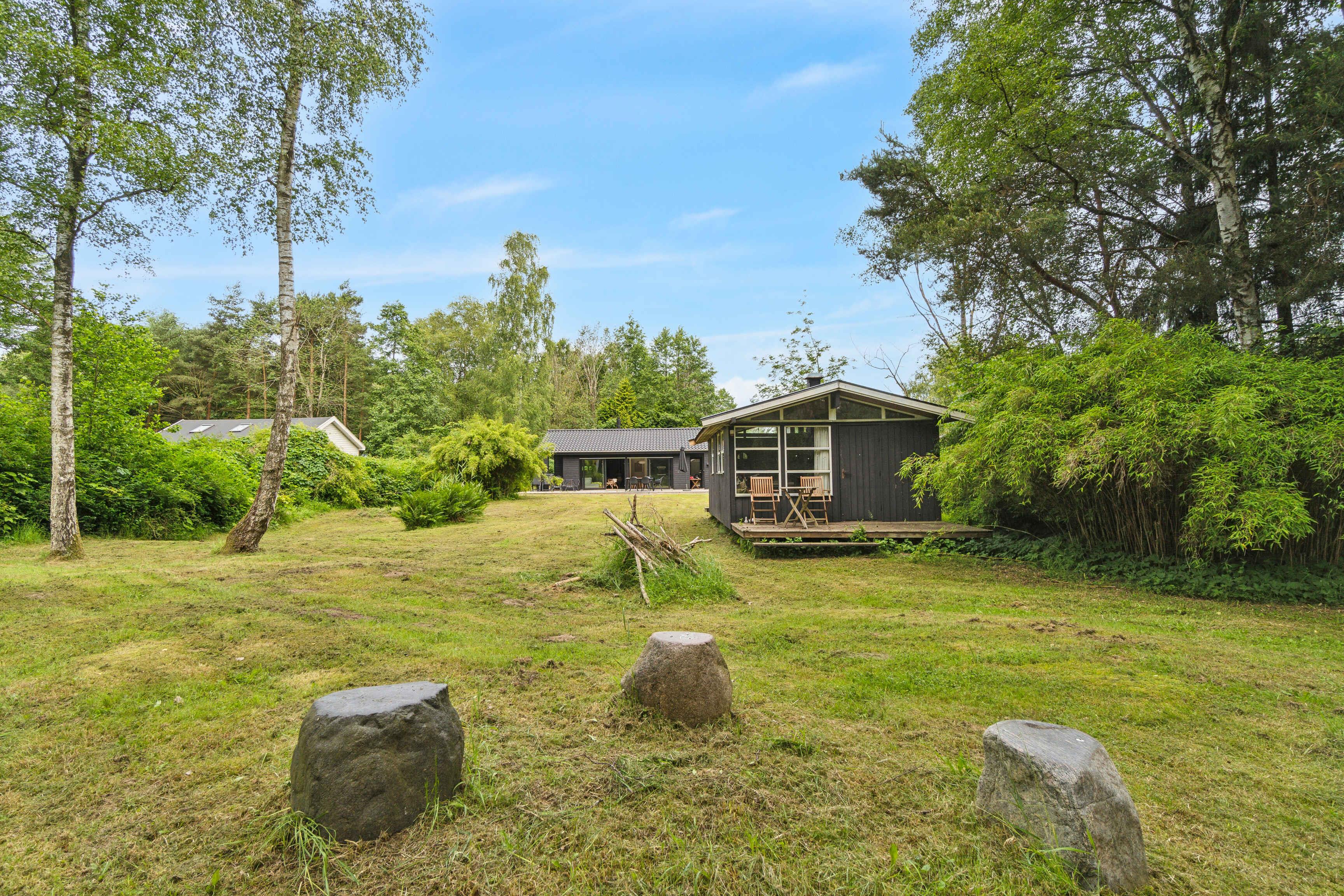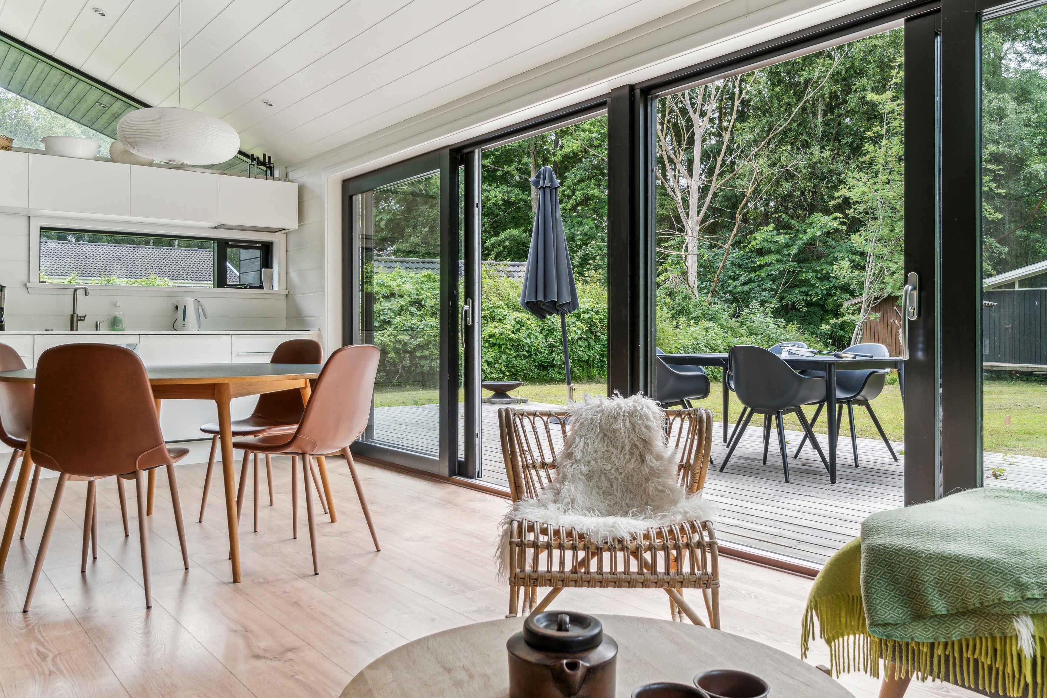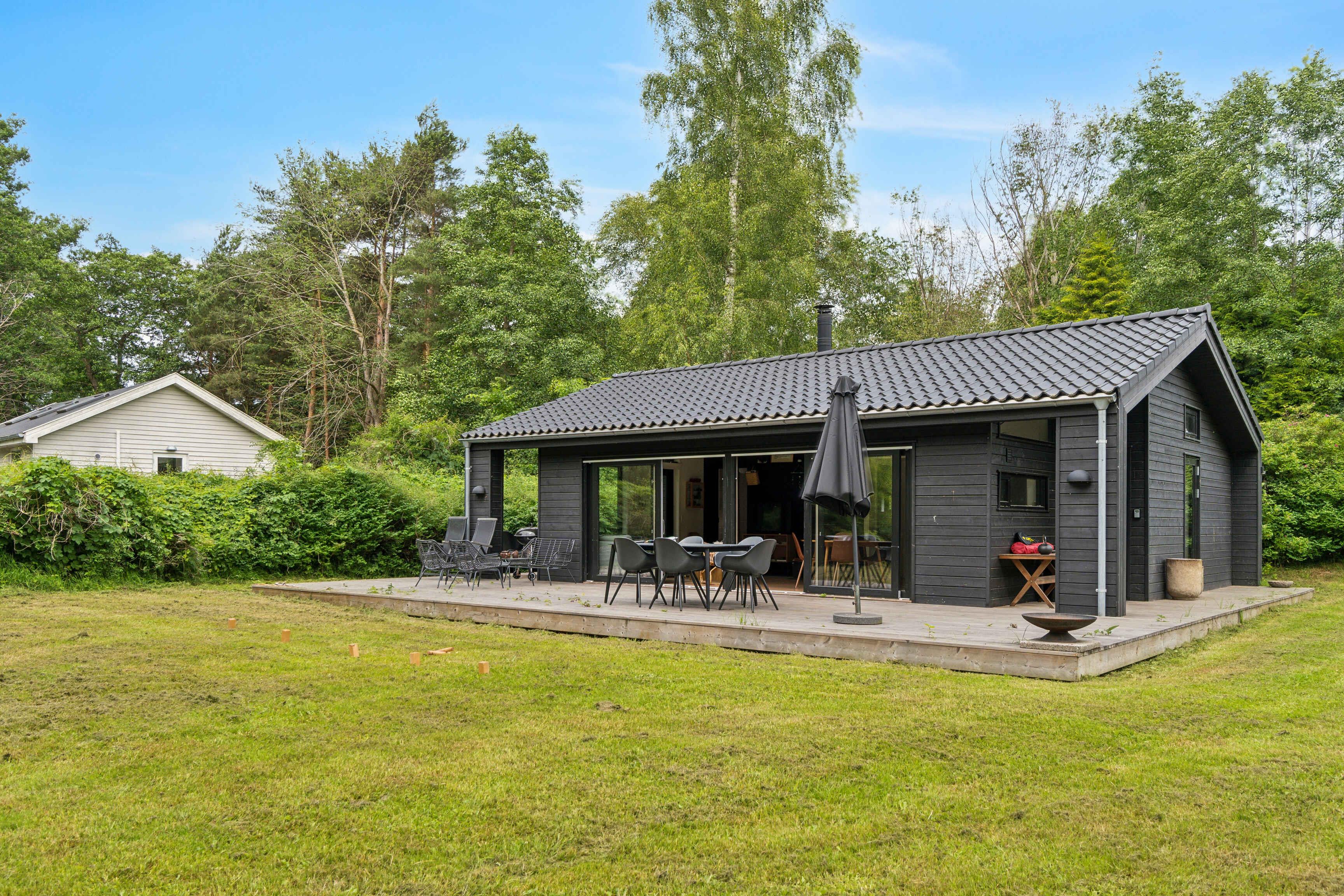 Im malerischen Ferienhausgebiet in Asserbo, umgeben von üppigen Wäldern und ruhiger Natur, finden Sie dieses moderne und stilvolle Ferienhaus, erbaut im Jahr 2020. Das Ferienhaus ist mit einer hellen und geräumigen Küche/Wohnzimmer eingerichtet, wo die gut ausgestattete Küche alles enthält, was Sie für die Zubereitung köstlicher Mahlzeiten benötigen. Hier finden Sie ein Induktionskochfeld, einen Kühl-/Gefrierschrank und einen Geschirrspüler, die das Kochen und Aufräumen einfach und bequem machen. Das Wohnzimmer, eingerichtet mit einem gemütlichen Kaminofen und einer effizienten Luft/Luft-Wärmepumpe, lädt zu entspannenden Momenten vor dem Kamin ein. Hier können Sie auch moderne Annehmlichkeiten wie Internetzugang und einen Fernseher mit Chromecast genießen, mit dem Sie Ihre Lieblingsfilme und -serien streamen können. Vom Wohnzimmer aus haben Sie direkten Zugang zu einer offenen und einer geschlossenen Terrasse, von denen aus Sie die schöne Aussicht auf den Garten und den umliegenden Wald genießen können. Die Terrasse ist ideal sowohl zum Sonnenbaden als auch für gemütliche Grillabende an warmen Sommerabenden. Das Ferienhaus verfügt über drei gut eingerichtete Schlafzimmer. Zwei der Zimmer sind mit komfortablen Doppelbetten ausgestattet, während das dritte Zimmer ein Etagenbett mit Platz für drei Personen hat – perfekt für Familien mit Kindern oder Gruppen von Freunden. Das Badezimmer ist modern und stilvoll, ausgestattet mit einer geräumigen Dusche und Fußbodenheizung, die auch an kühlen Tagen für ein angenehmes Erlebnis sorgt. Der Außenbereich ist eine Oase der Entspannung und Gemütlichkeit. Auf der Terrasse stehen bequeme Gartenmöbel, wo Sie Ihren Morgenkaffee genießen oder in der Sonne ein gutes Buch lesen können. Das Naturgrundstück bietet sowohl eine Feuerstelle, an der Sie abends zusammenkommen und Marshmallows rösten können, als auch eine Hängematte zur Entspannung im Schatten der Bäume und einen Grill, der zum Kochen im Freien und zu gemütlichen Mahlzeiten im Freien einlädt. Dieses Ferienhaus wird nicht an Jugendgruppen vermietet, was eine ruhige und entspannte Atmosphäre für alle Gäste gewährleistet. Es ist der ideale Ort für Familien und Freunde, die einen friedlichen und malerischen Urlaub mit modernem Komfort und Annehmlichkeiten genießen möchten. Ob Sie die umliegenden Waldgebiete erkunden, sich in der Sonne auf der Terrasse entspannen oder einen gemütlichen Abend am Kaminofen genießen möchten, dieses Ferienhaus in Asserbo bietet den perfekten Rahmen für einen unvergesslichen Urlaub.