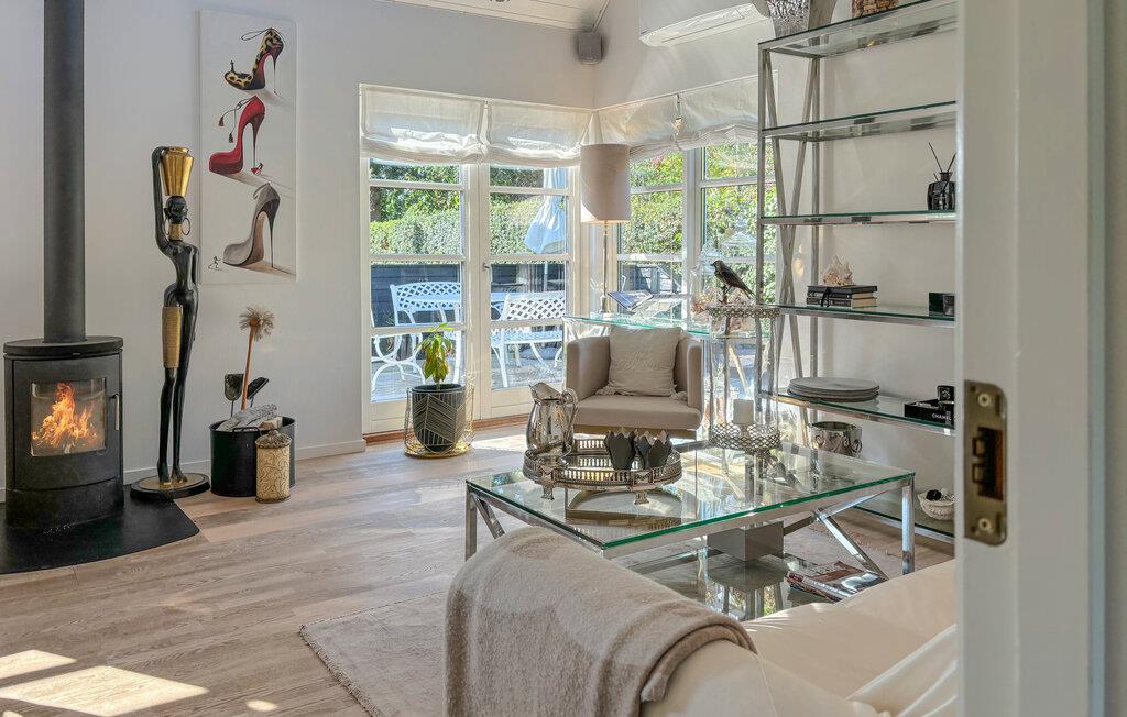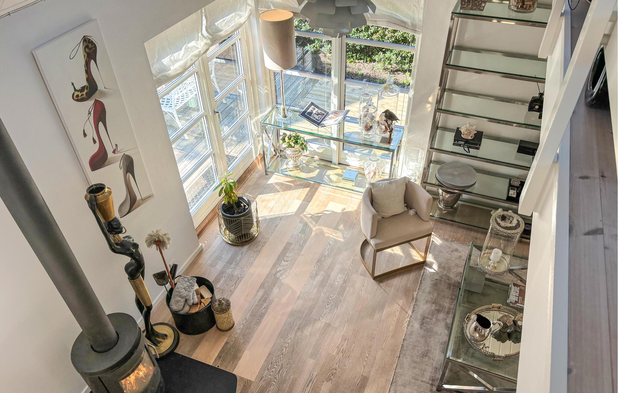 Dieses Haus empfängt Sie mit stilvollem Ambiente, hellen Räumen und modernen Details, die Eleganz und Gemütlichkeit verbinden. Auf dem Sofa am Kamin können Sie entspannte Stunden verbringen oder den Tag bei einem Glas Wein im sonnendurchfluteten Wohnzimmer ausklingen lassen. Durch die großen Fenster und den direkten Zugang zur Terrasse genießen Sie jederzeit den Blick ins Grüne und das Gefühl, mitten in der Natur zu sein.